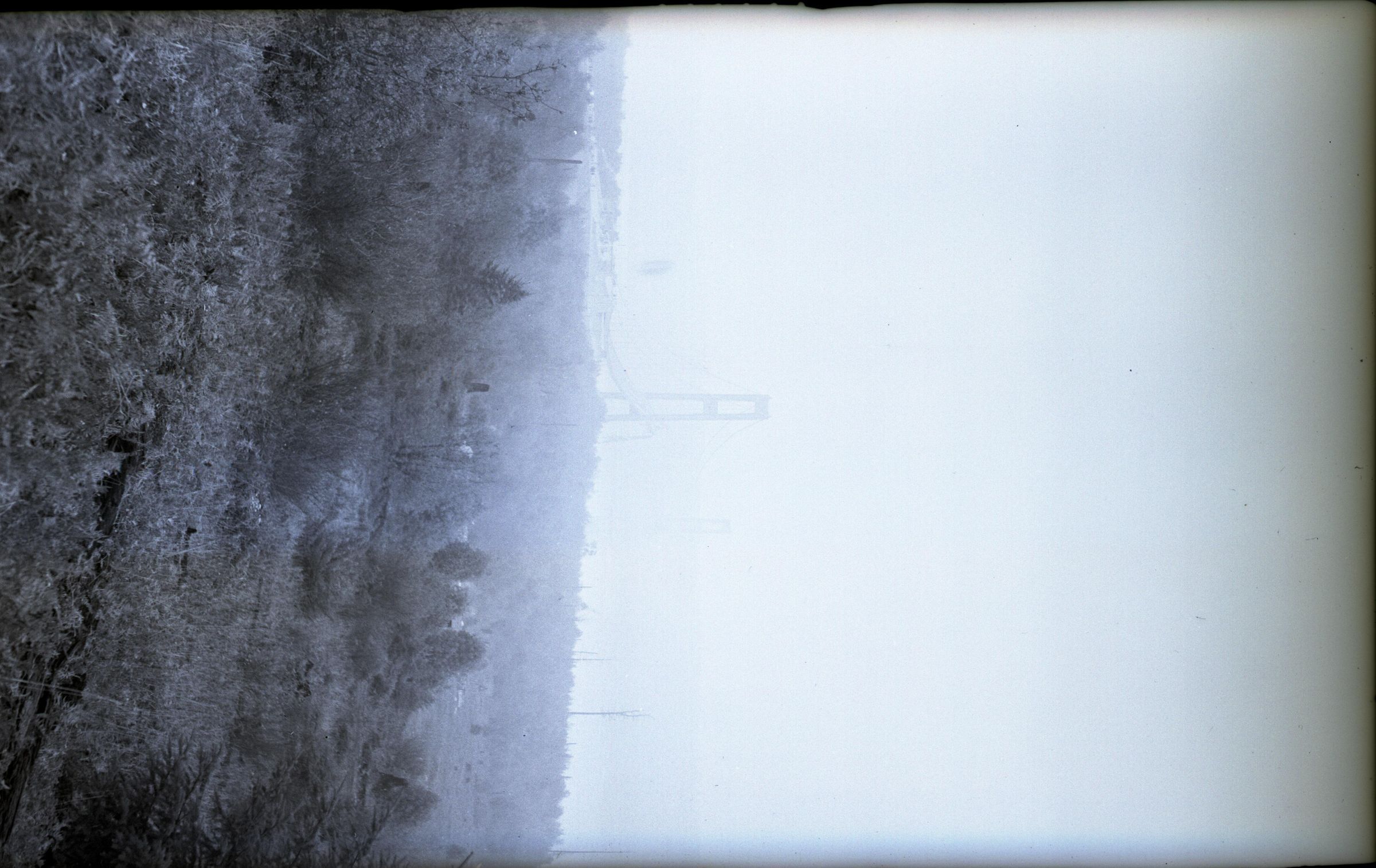 Black and white negative of the Tacoma Narrows Bridge after it collapsed. The image is faint, but visible in the foreground is land with trees, and in the middle background are the remaining towers and fallen roadway of the bridge. There is a white border on all sides, and in the bottom border is "#2191 January 1941".