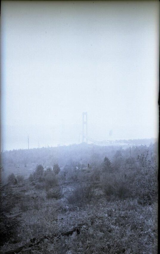 The negative is inserted, along with a print of the image, into a cream colored envelope that has typed "January 1941 - Tacoma Wreck of the Narrows Bridge - Distant view on a foggy day of the towers and the fallen roadway" Stamped is "2191" and "indexed".Made/Created
