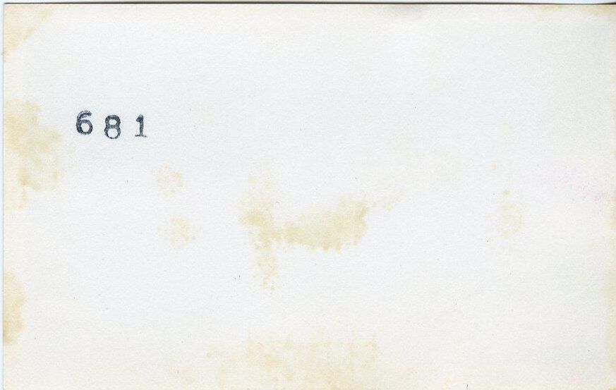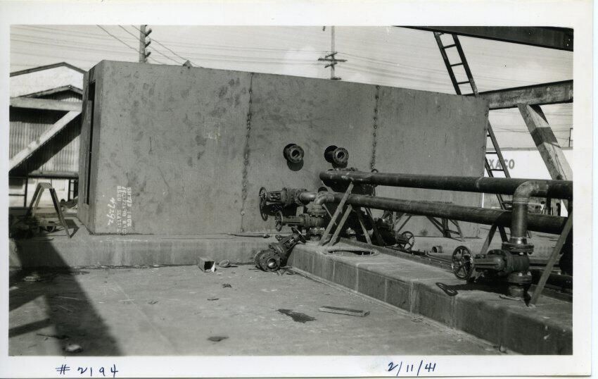 Black and white photo of the pump house on a barge built by Reliable Welding. There is flat deck in the foreground with slightly raised portions on the right and rear. In the middle of the image is a wall of an enclosure with two pipes protruding. At the left is a shadow of a beam and a portion of a building behind the barge. On the right are steel beams and a wooden ladder. In the right foreground are a collection of pipes, valves, and handles. In the background are telephone poles and wires. There is a white border on all sides, and in the bottom border is "#2194 2/11/41". On the back is "681".