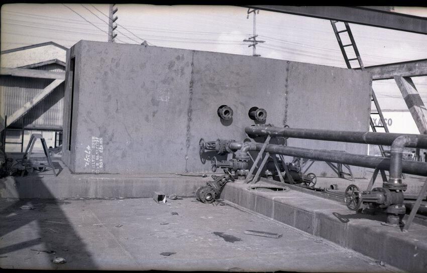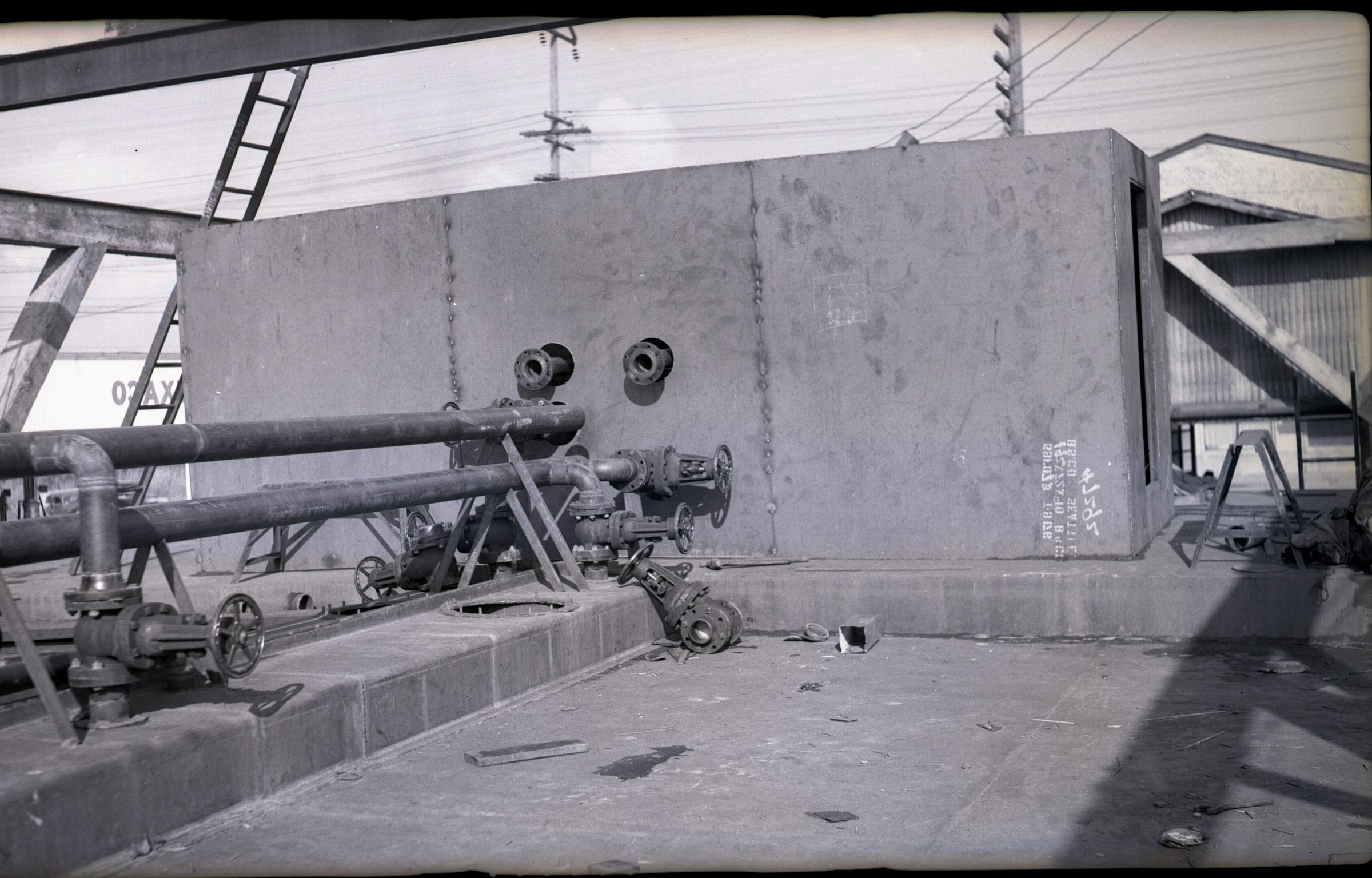 Black and white negative of the pump house on a barge built by Reliable Welding. There is flat deck in the foreground with slightly raised portions on the right and rear. In the middle of the image is a wall of an enclosure with two pipes protruding. At the left is a shadow of a beam and a portion of a building behind the barge. On the right are steel beams and a wooden ladder. In the right foreground are a collection of pipes, valves, and handles. In the background are telephone poles and wires. There is a white border on all sides, and in the bottom border is "#2194 2/11/41".