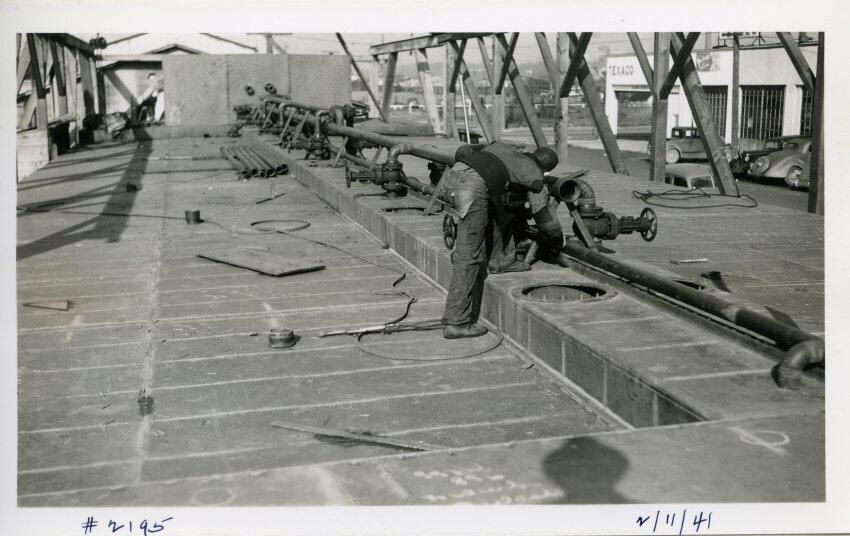 Black and white photo of the deck of an oil barge built by Reliable Welding. There is a steel deck with various items such as pipes and tools scattered around on it. There is a framework of steel beams on both sides of the barge, and shadows of the beams at the left. In the center of the deck is a raised portion with manhole covers and pipes, valves, and handles extending back to the wall of a pump house. A man is leaning over an open manhole. On the right side beyond the barge is a part of a building and some vehicles.. There is a white border on all sides, and in the bottom border is "#2195 2/11/41". On the back is "681".