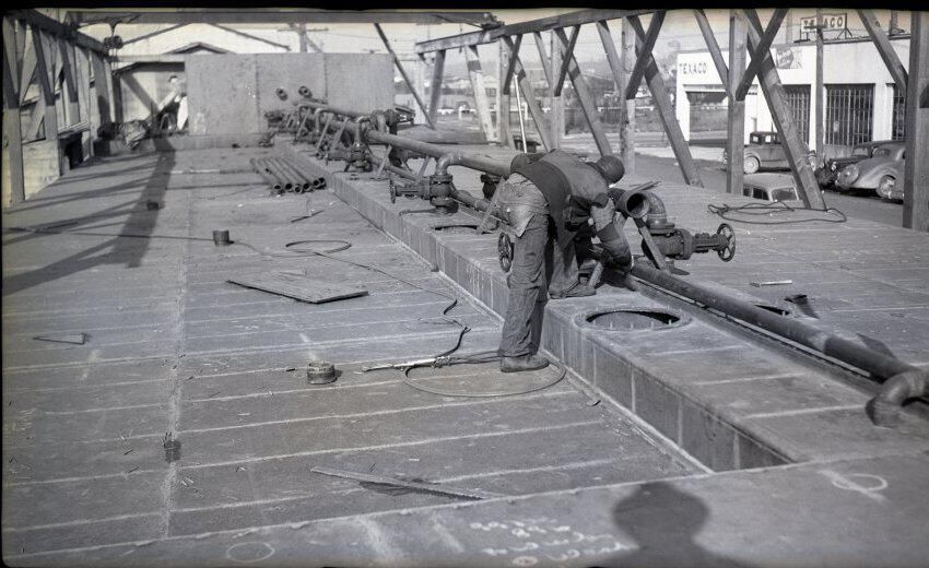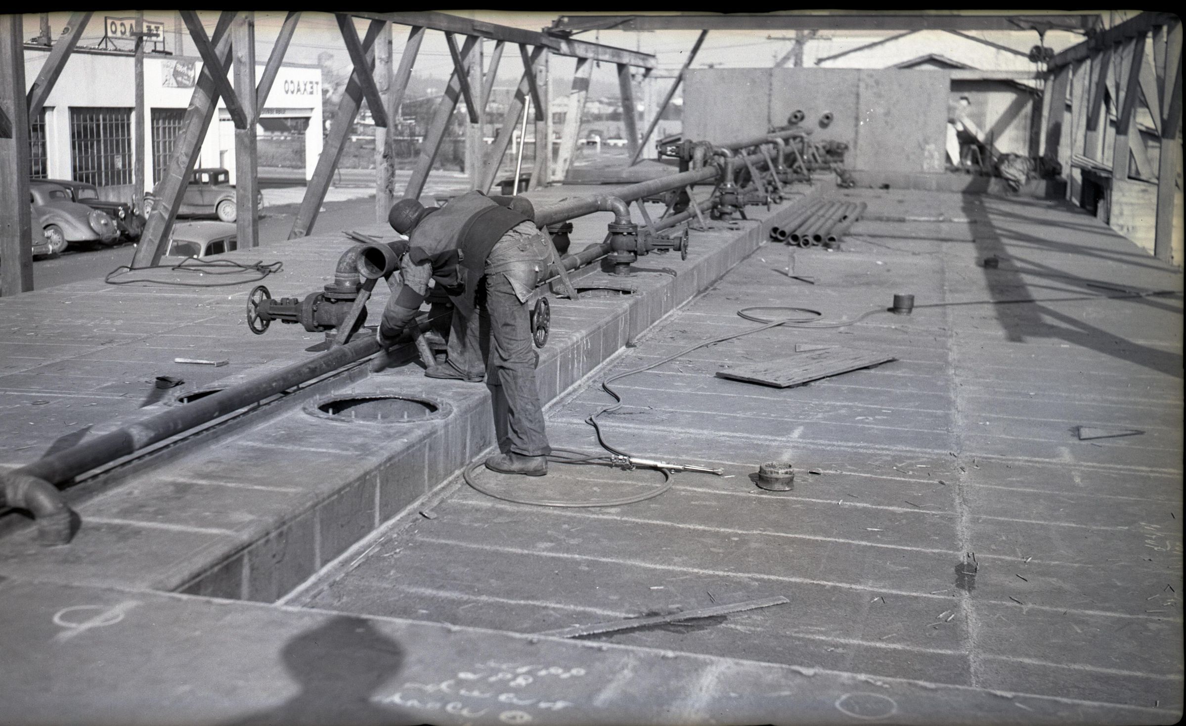 Black and white negative of the deck of an oil barge built by Reliable Welding. There is a steel deck with various items such as pipes and tools scattered around on it. There is a framework of steel beams on both sides of the barge, and shadows of the beams at the left. In the center of the deck is a raised portion with manhole covers and pipes, valves, and handles extending back to the wall of a pump house. A man is leaning over an open manhole. On the right side beyond the barge is a part of a building and some vehicles.. There is a white border on all sides, and in the bottom border is "#2195 2/11/41"