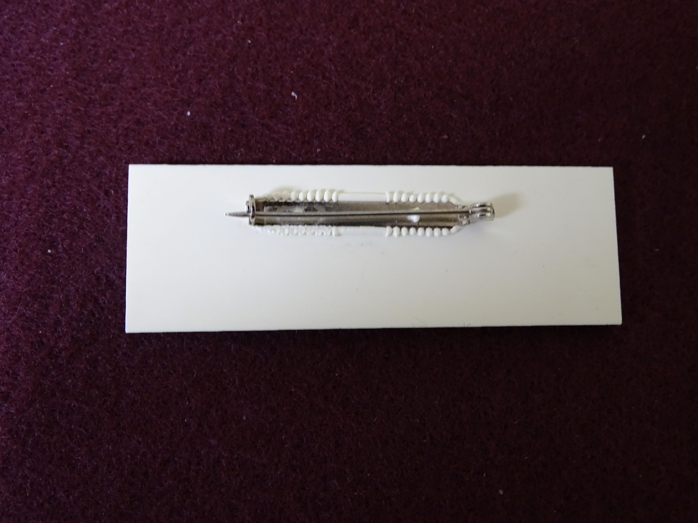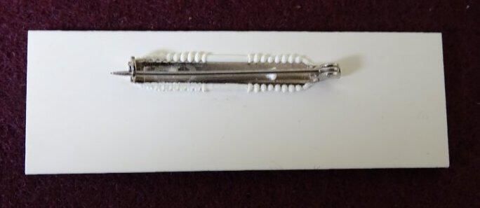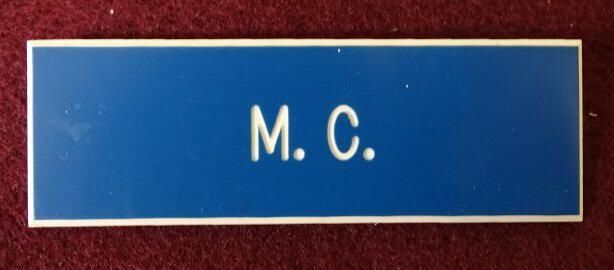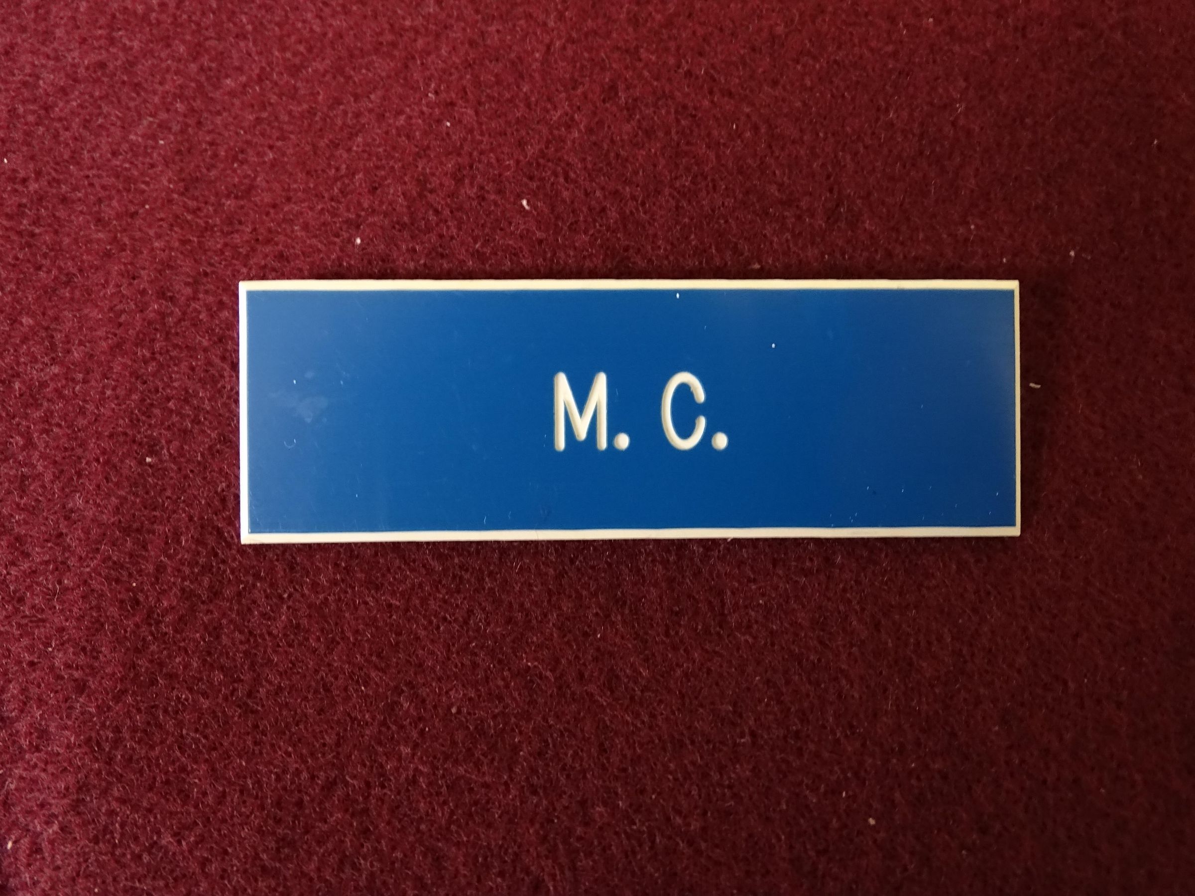 White rectangular badge with a blue front. The blue is cut out to form the letters "M. C." There is an attachment pin on the back.Relationships
