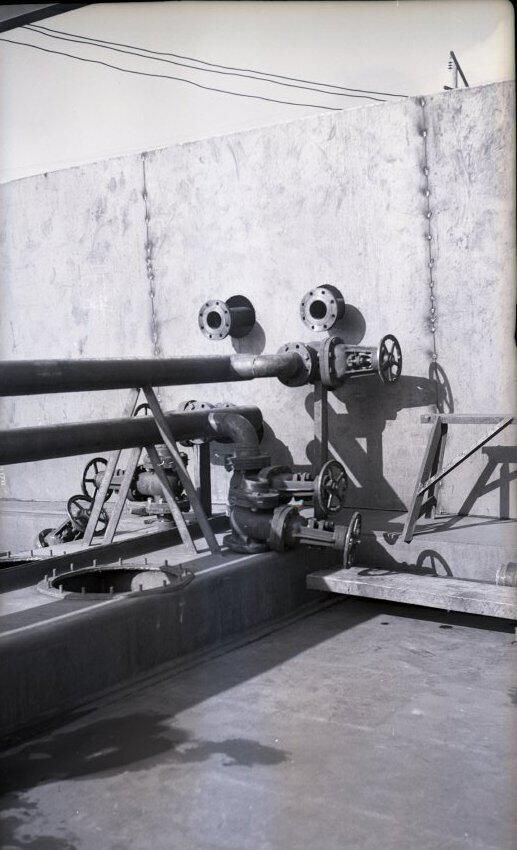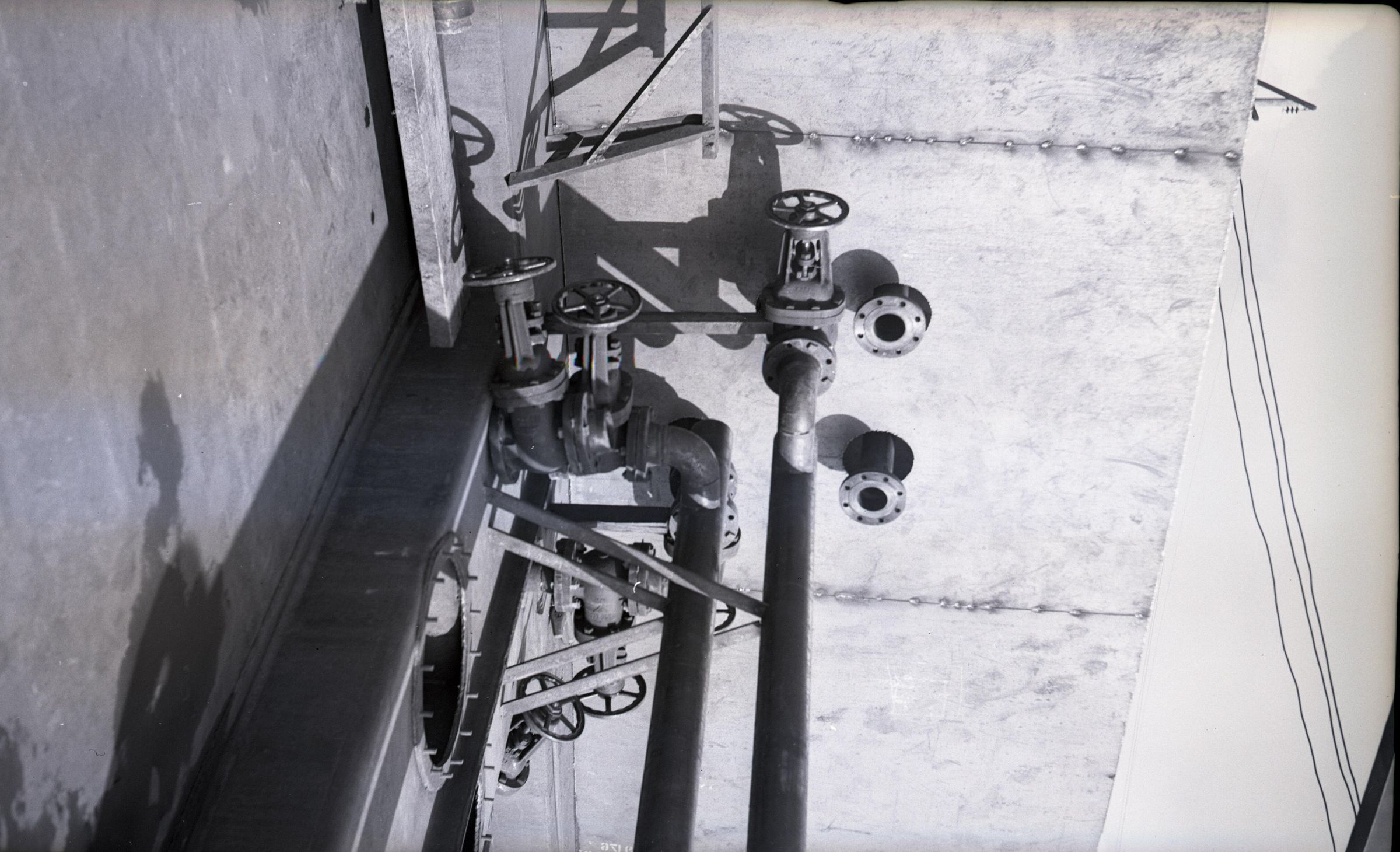 Black and white negative of the deck of an oil barge built by Reliable Welding. There is a steel deck with the wall of an enclosure behind it. A raised portion of the deck at the left has an open manhole. Above it are various pipes with valves and handles. At the top of the image are wires. There is a white border on all sides, and in the bottom border is "#2196 2/11/41"