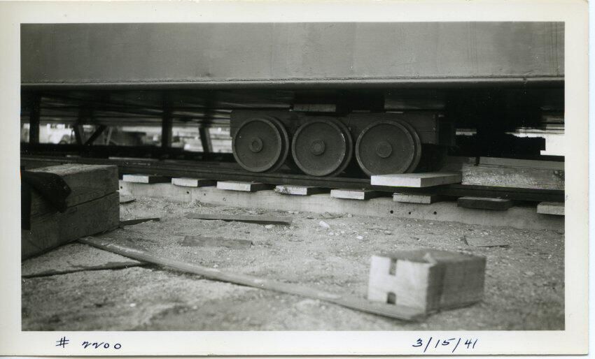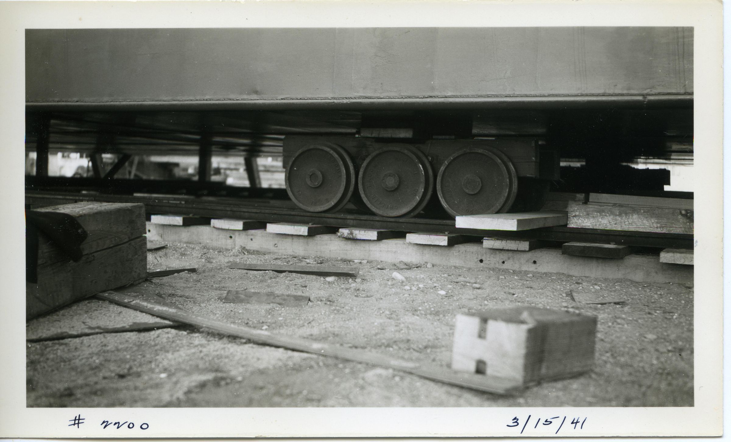 Black and white photo of an oil barge built by Reliable Welding ready for launching. There is gravel in the foreground with various objects scattered around. There are rails mounted on ties, and above that is the barge. In the center of the image is a truck consisting of three metal railroad-type wheels on each side. The wheels are running on the rails. On the back is "756D". There is a white border on all sides, and in the bottom border is "#2200 3/15/41"