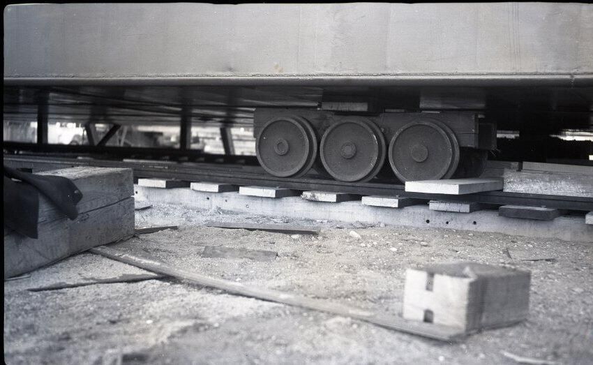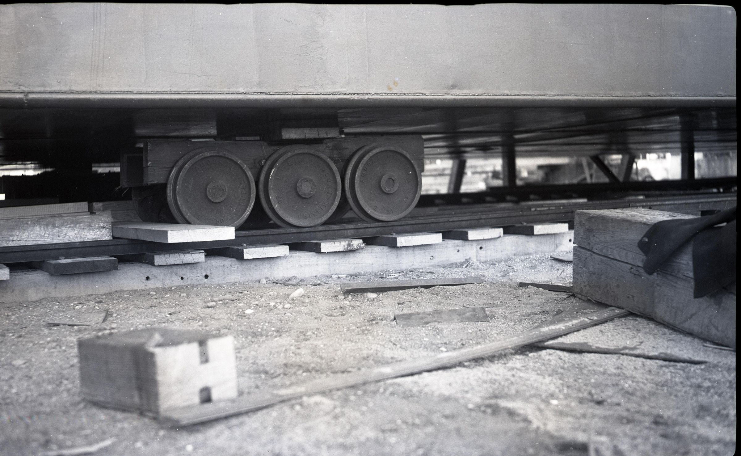Black and white negative of an oil barge built by Reliable Welding ready for launching. There is gravel in the foreground with various objects scattered around. There are rails mounted on ties, and above that is the barge. In the center of the image is a truck consisting of three metal railroad-type wheels on each side. The wheels are running on the rails. There is a white border on all sides, and in the bottom border is "#2200 3/15/41"