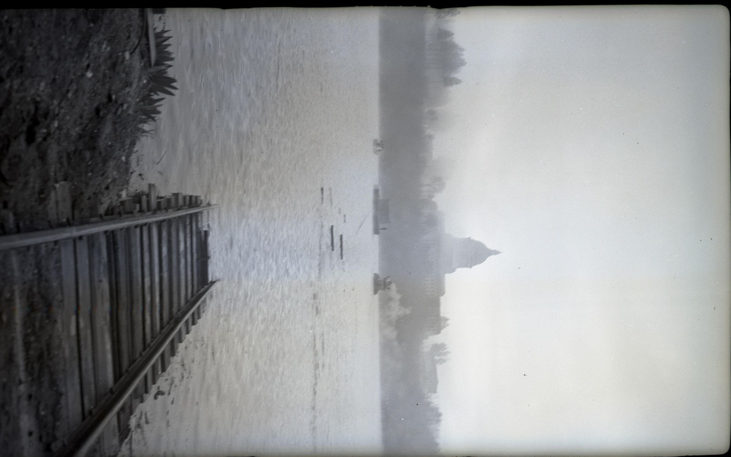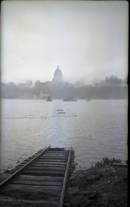 Black and white negative of an oil barge built by Reliable Welding just after launching. In the foreground is a portion of a railroad track disappearing into a body of water. In the center of the image is the silhouette of the barge and two tug boats chasing it. In the background is the dome of the Legislative Building. There is a white border on all sides, and in the bottom border is "#2204 3/16/41"