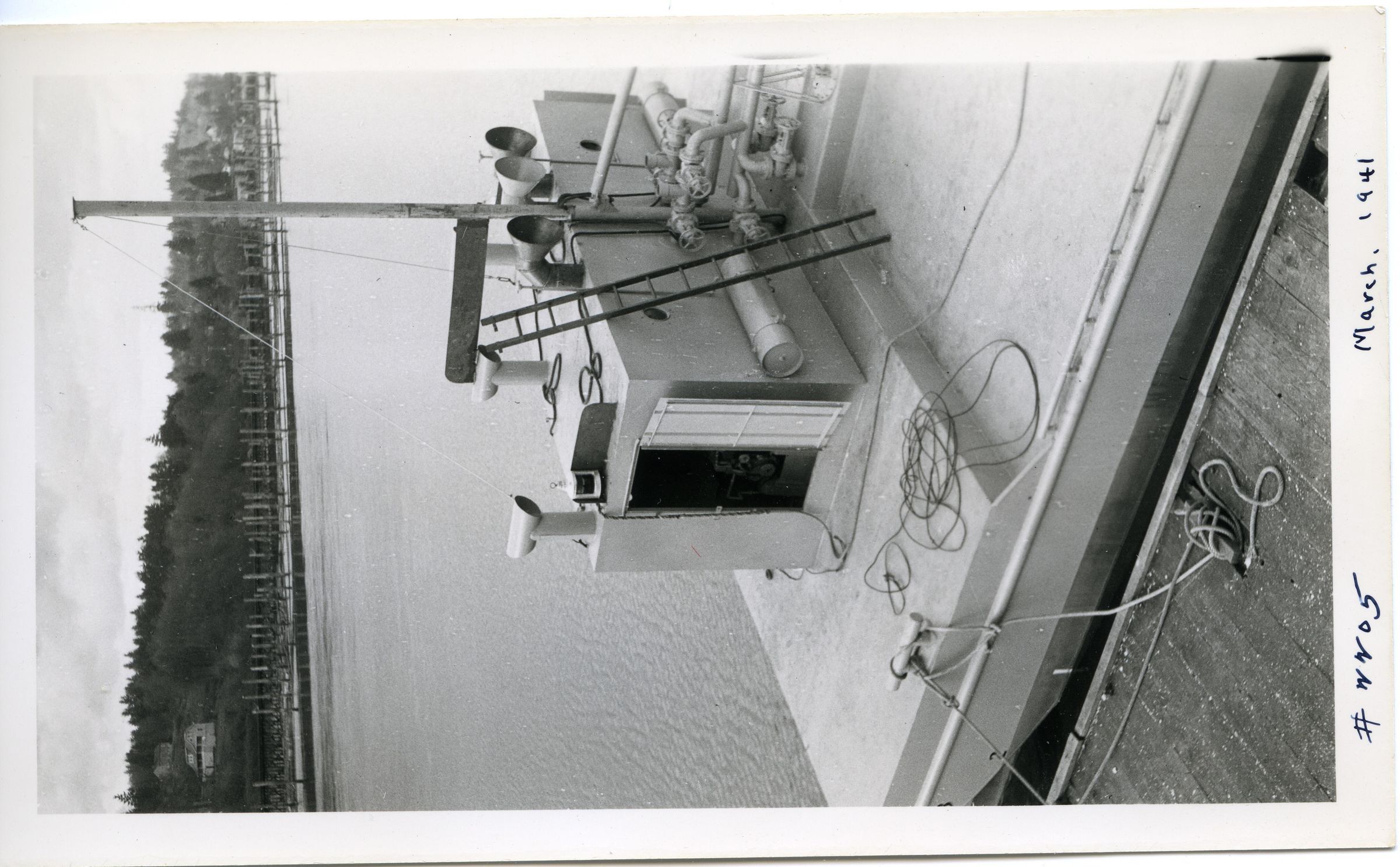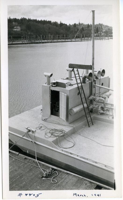 The photo is inserted, along with a negative of the image, into a cream colored envelope that has typed "March, 1941 - Olympia Pump house on Steel Barge, built by the Reliable Welding Works, after launching". Stamped is "2205" and "indexed".Made/Created