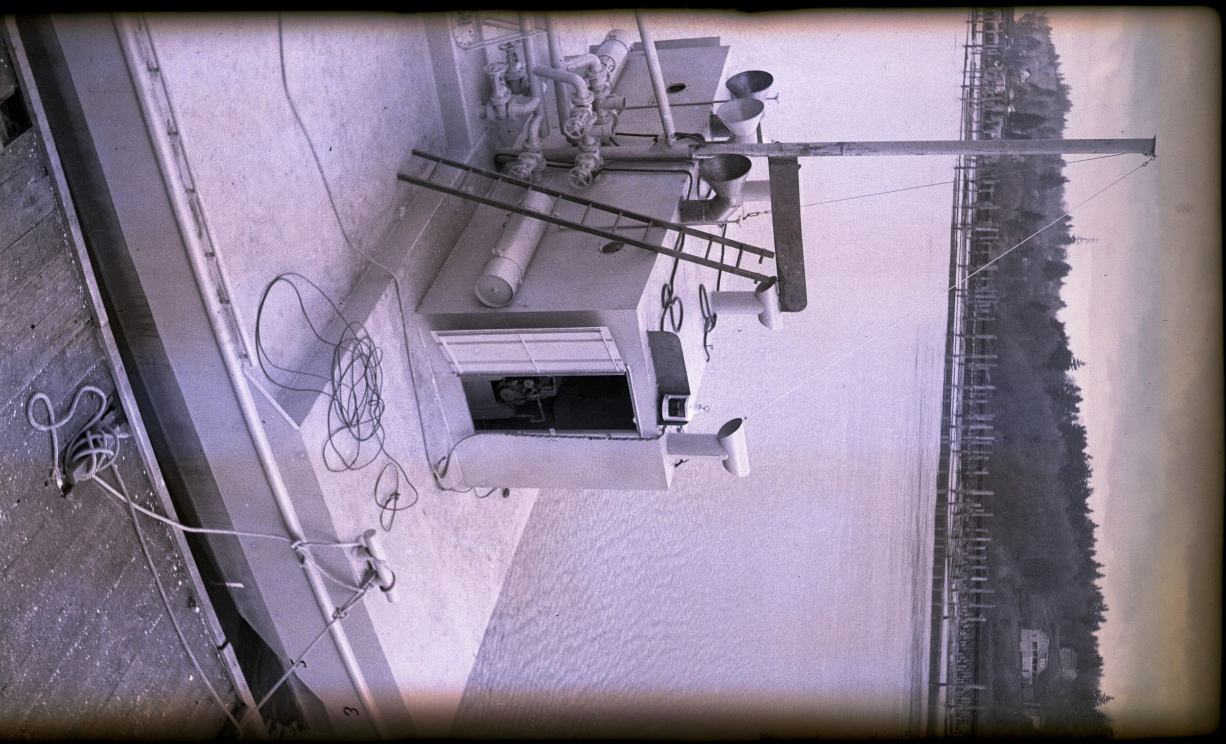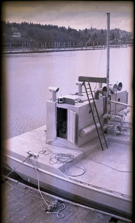 The negative is inserted, along with a print of the image, into a cream colored envelope that has typed "March, 1941 - Olympia Pump house on Steel Barge, built by the Reliable Welding Works, after launching". Stamped is "2205" and "indexed".Made/Created