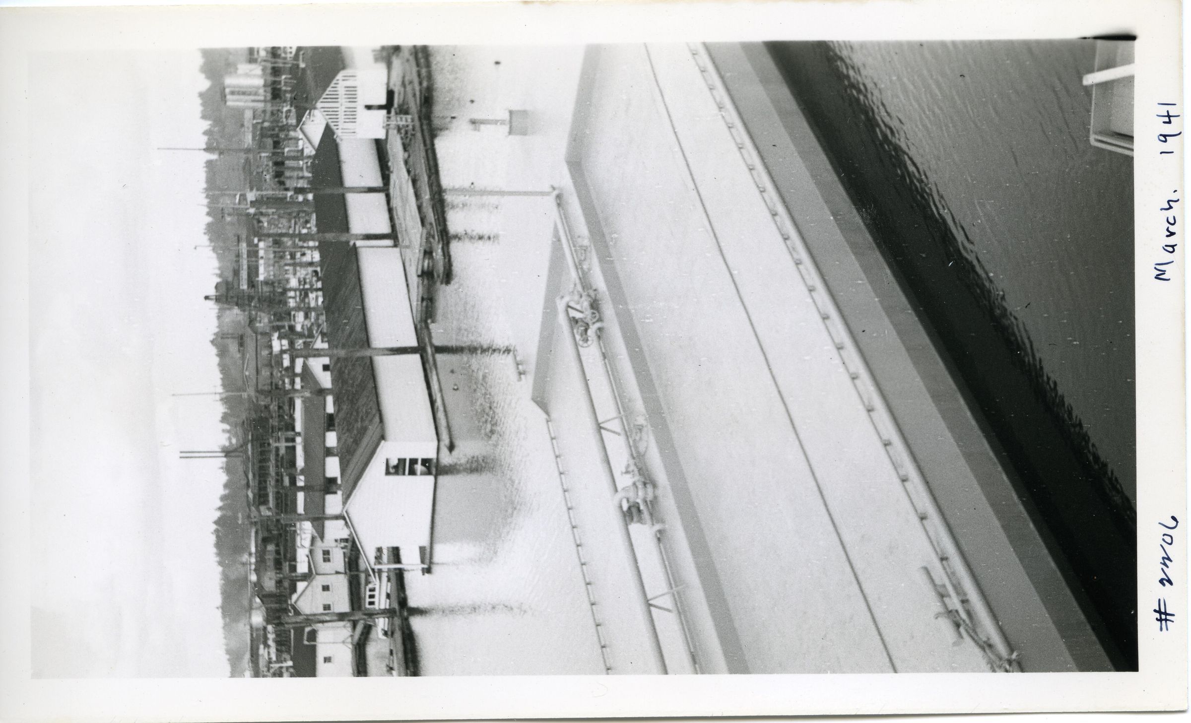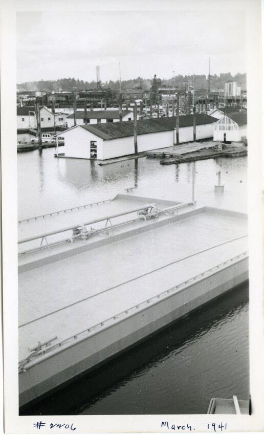 The photo is inserted, along with a negative of the image, into a cream colored envelope that has typed "March, 1941 - Olympia Deck of steel barge, built by the Reliable Welding Works, afloat". Stamped is "2206" and "indexed".Made/Created