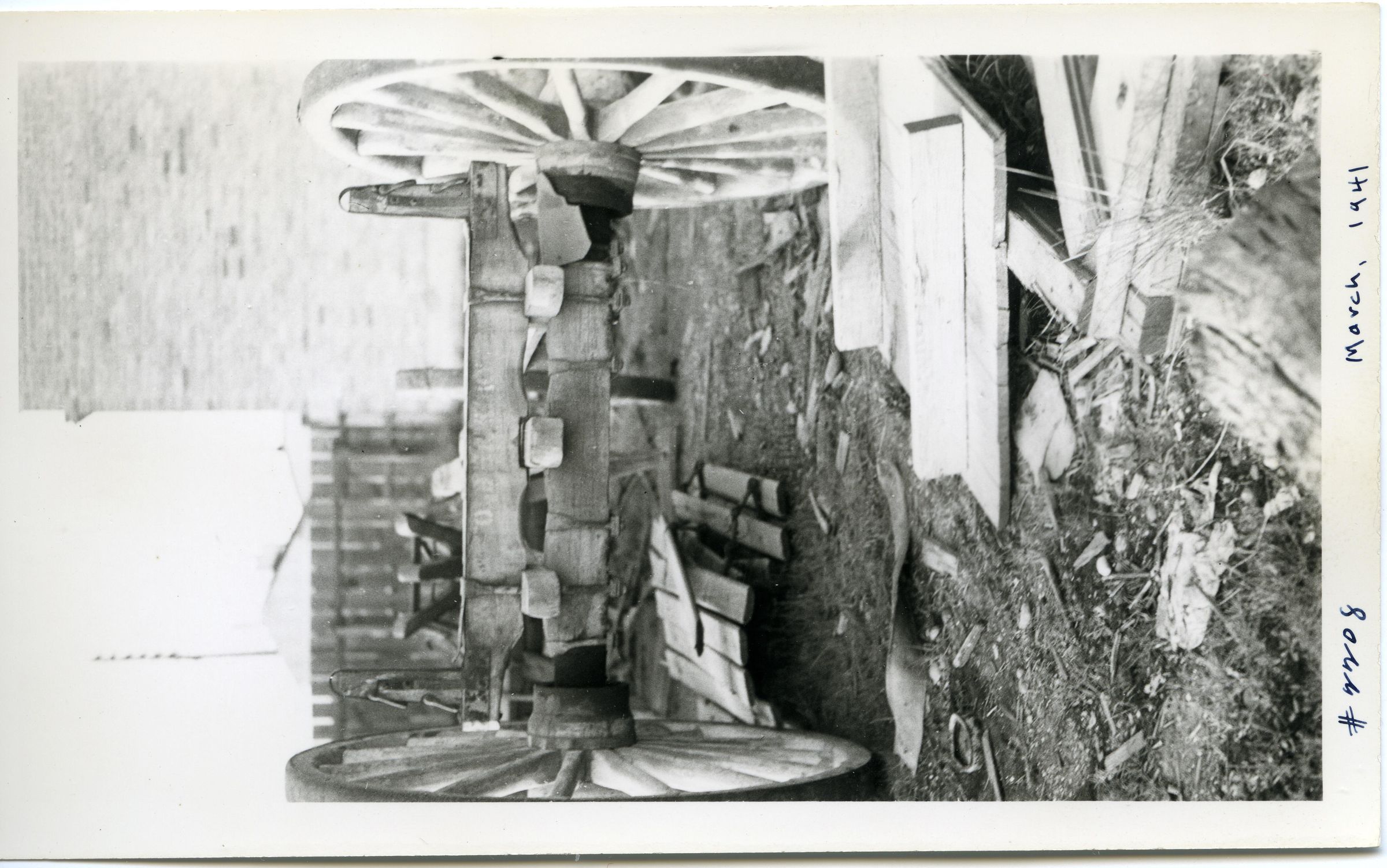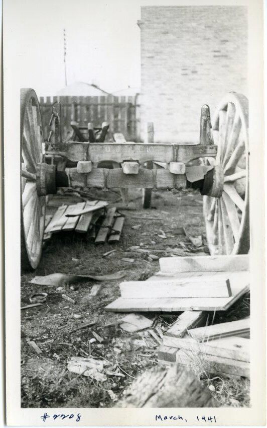 The photo is inserted, along with a negative of the image, into a cream colored envelope that has typed "April, 1941 - Olympia Wagon: Rear view of running gear of old time lumber wagon". Stamped is "2208" and "indexed".Made/Created