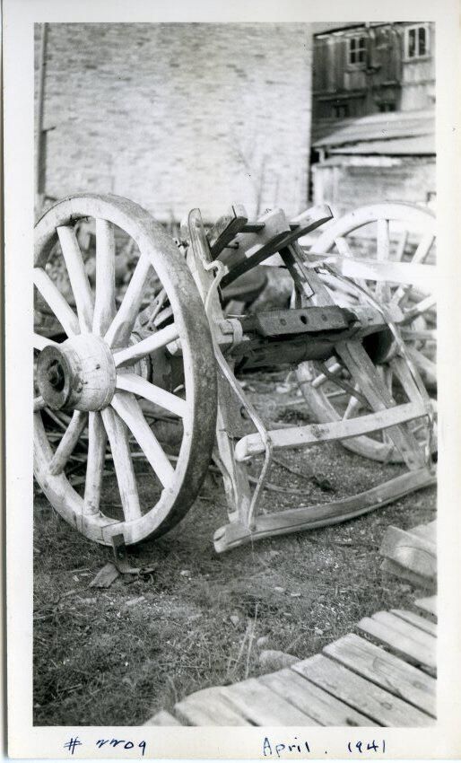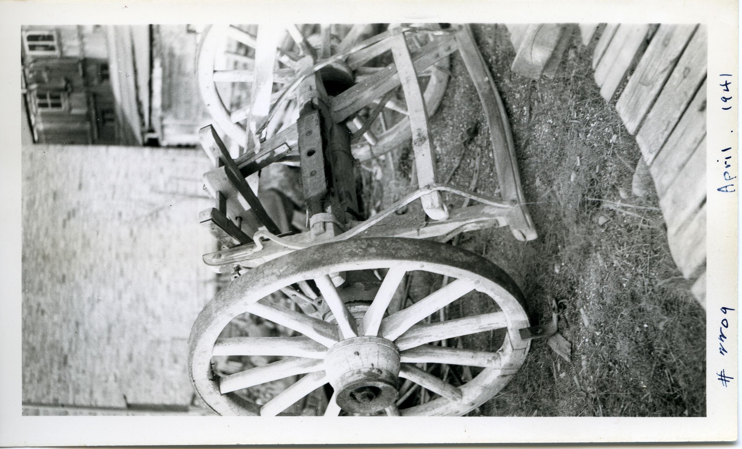 Black and white photo of the wheels of an old lumber wagon. The foreground is dirt with grass and weeds and boards laid out as if a walkway. The wheels are large with wooden spokes. Between the wheels is an axle and a wood and metal assembly that had to do with the moving of the wagon. In the background are parts of buildings. There is a white border on all sides, and in the bottom border is "#2209 April 1941". On the back is "995F".