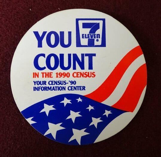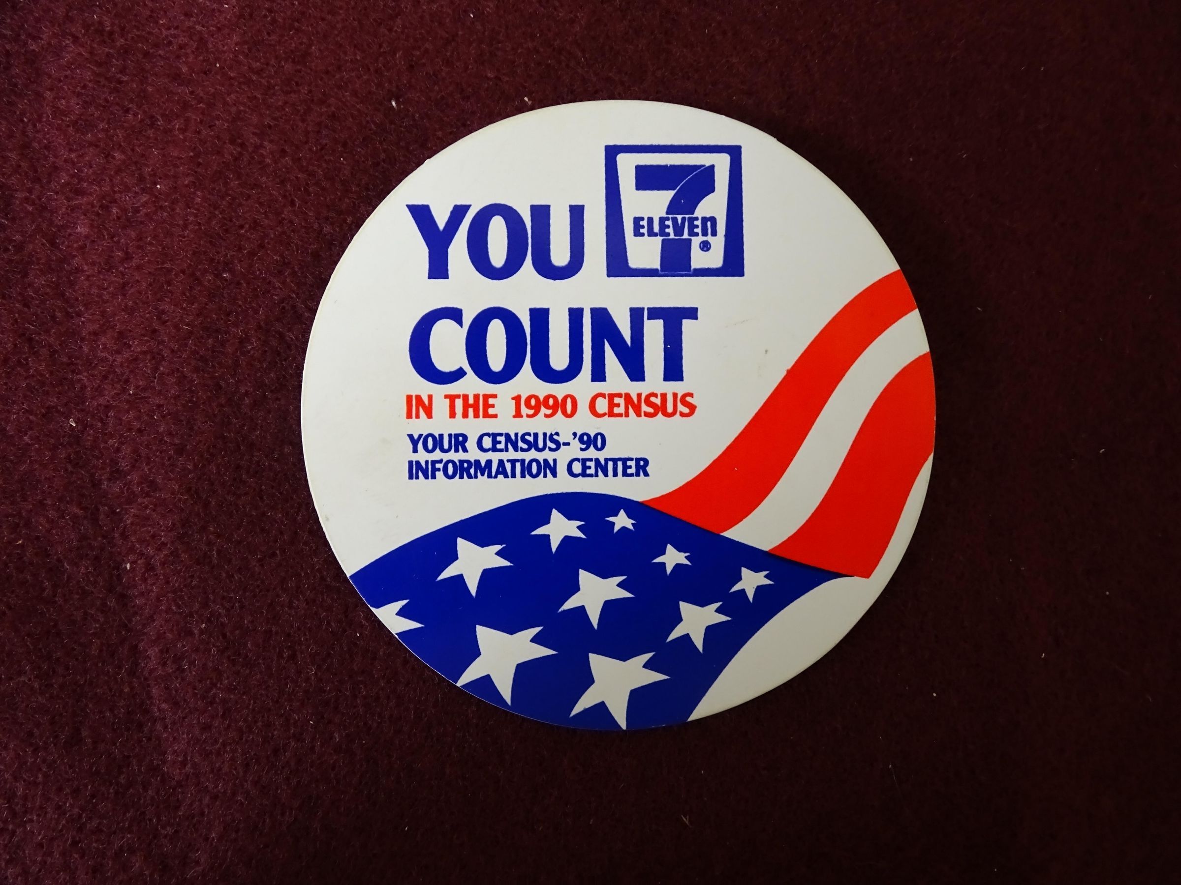 White plastic button with red and blue ink. On the front is "You Count in the 1990 Census, Your census-'90 information center". Also on the front is the "7 Eleven" logo and a partial image of the American flag. On the back is a pin for attachment.Relationships