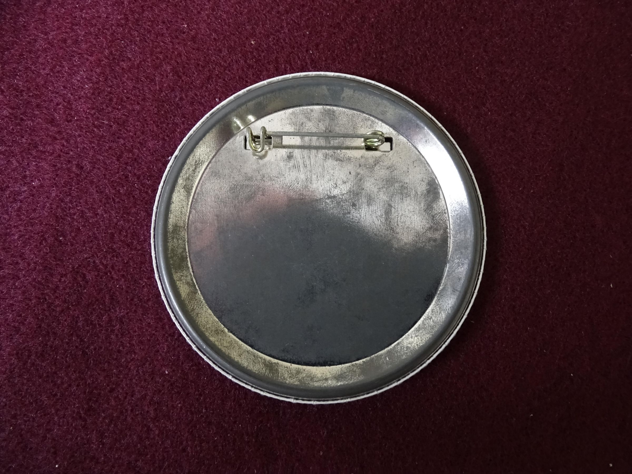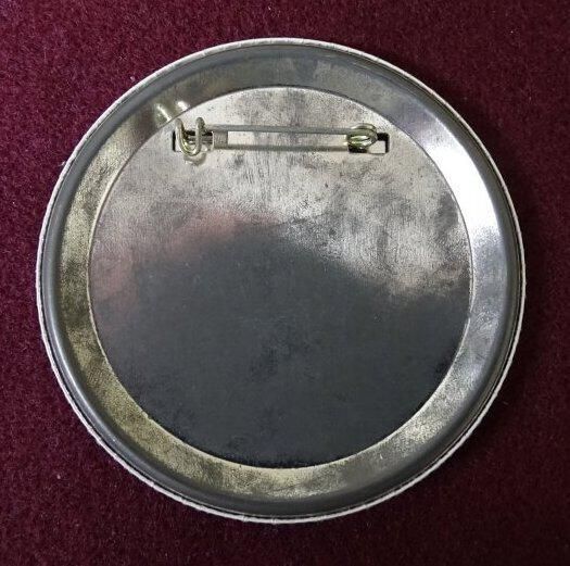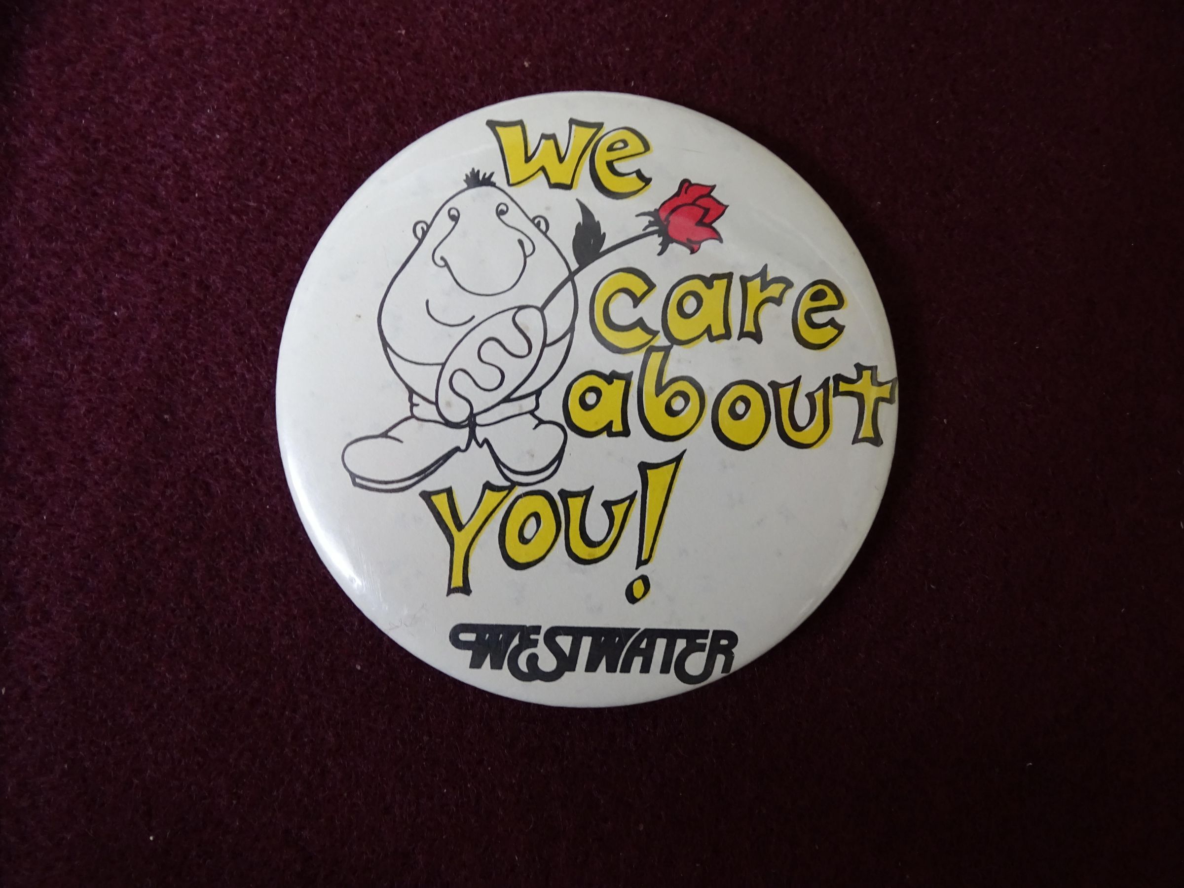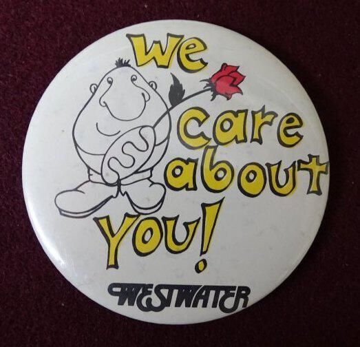 White metal button with yellow, red, and black ink. On the front is "We care about you, Westwater" and a cartoon figure holding a rose.Relationships