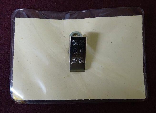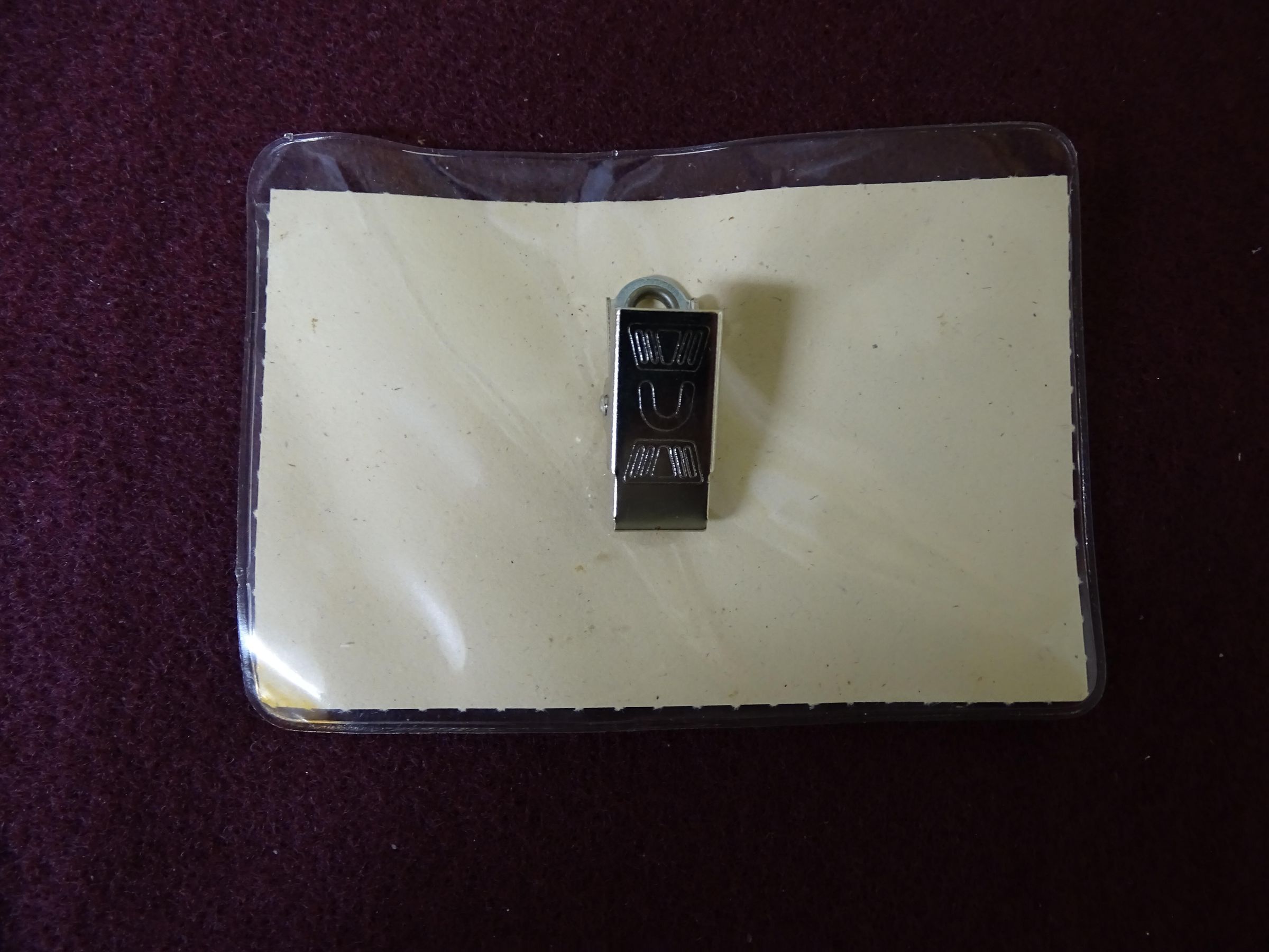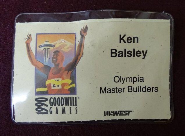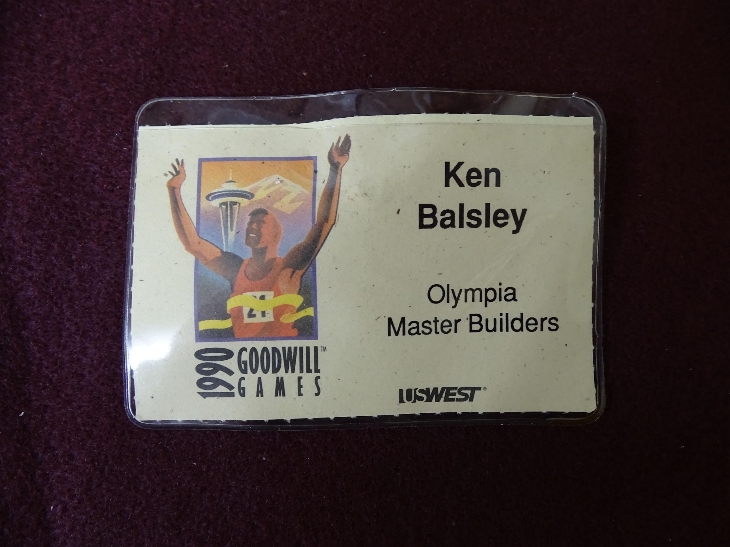 Rectangular plastic envelope with a clip on the back and a paper inserted. On the paper is "Ken balsley, Olympia Master Builders. USWEST, 1990 Goodwill Games". After the word "Goodwill" are the initials "TM". Also on the paper is an image of an athlete, the Space Needle, and Mt. Rainier".Dimensions