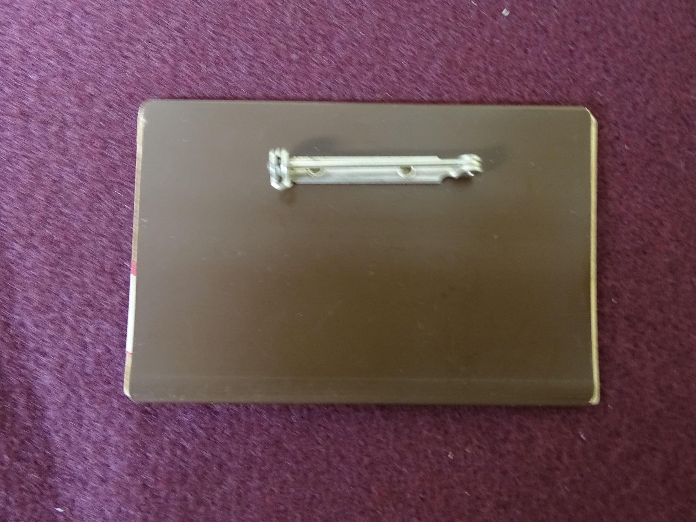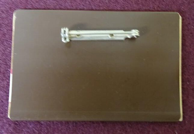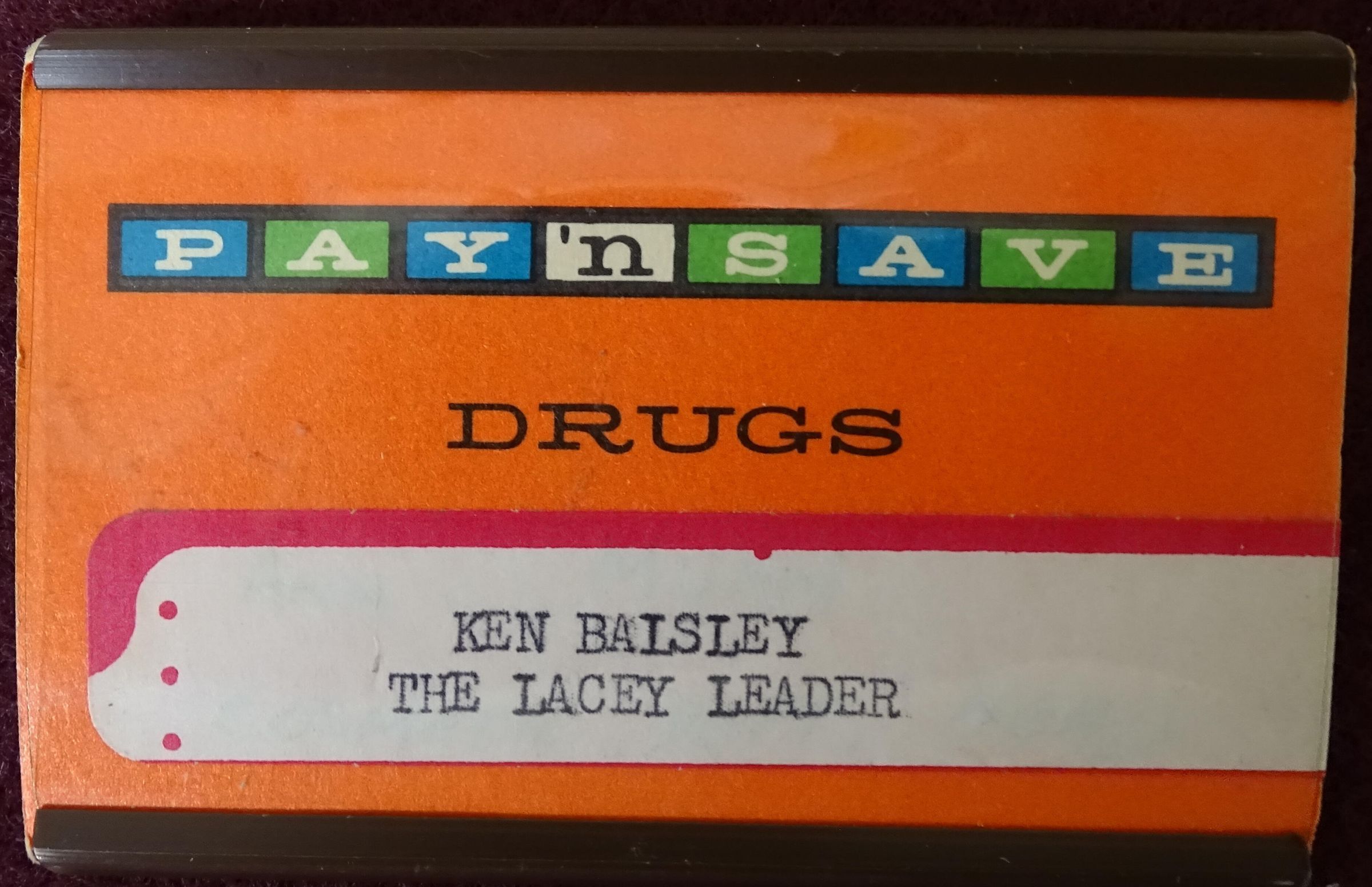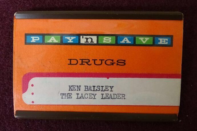 Rectangular plastic badge with a solid brown back and a clear front. Inside is inserted an orange paper. On the paper in blue, green, white, and black is "PAY'NSAVE" and in black "drugs". On a white portion of the paper is typed "Ken Balsley, The Lacey Leader". The pin on the back has a rotating lock.Dimensions