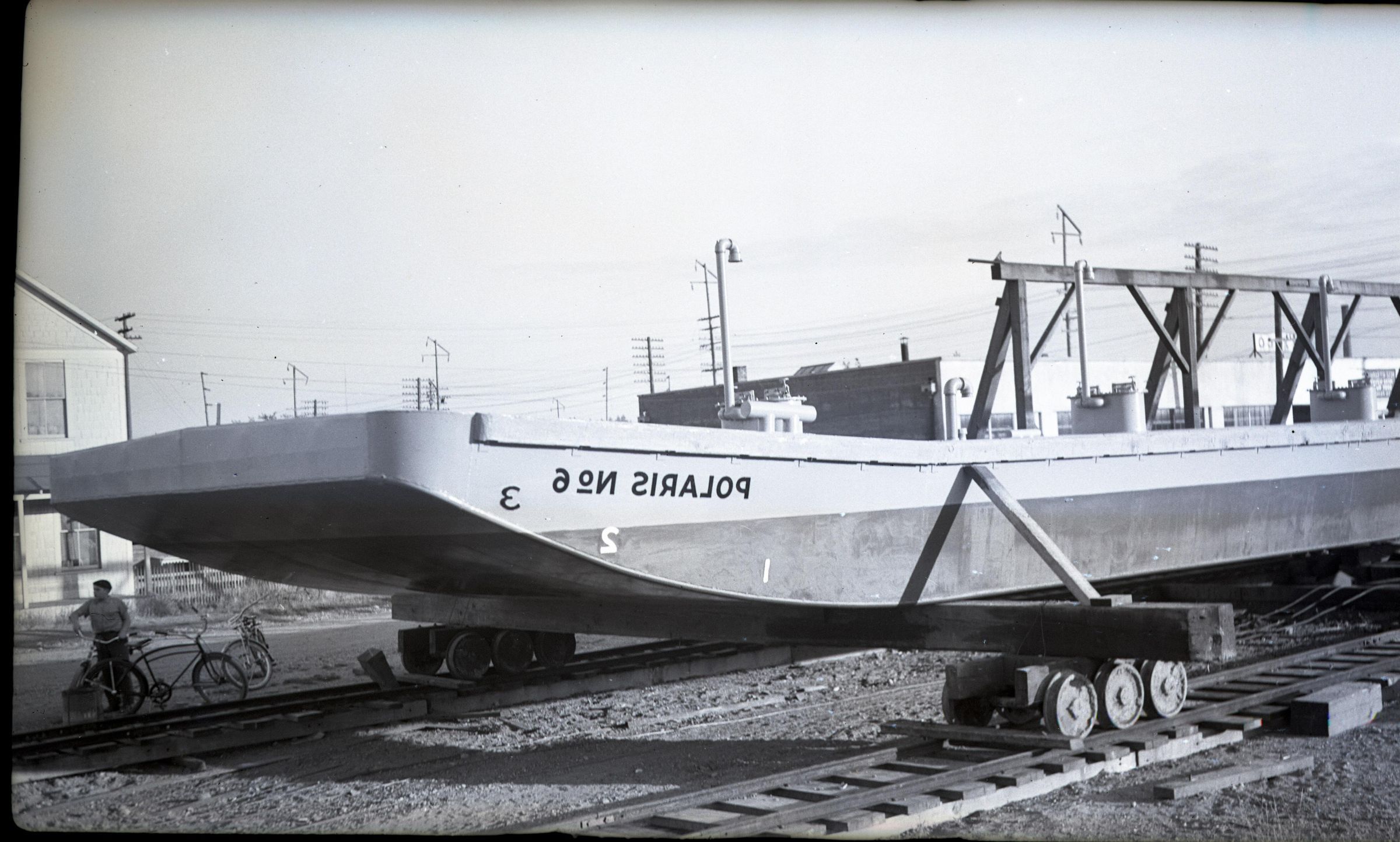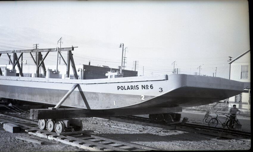 Black and white negative of a small barge ready to be launched. The barge is in the center of the photo and its bow end rises in a small curve. The hull is a light color with the portion presumably below the water line darker. On the hull is painted "Polaris No. 6" and the numbers 1, 2, and 3. The barge is resting on a wooden beam, which, in turn, is resting on two 6-wheeled trucks that run on rails. There is a metal or wooden framework on the beam and above the deck of the barge. Behind the barge are parts of buildings and telephone poles and wires.. There is a silhouette of a man in the lower right corner of the print. There is a white border on all sides, and in the bottom border is "#2505 6/27/41".