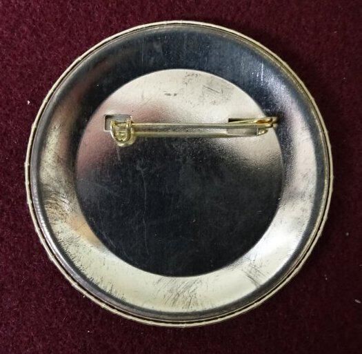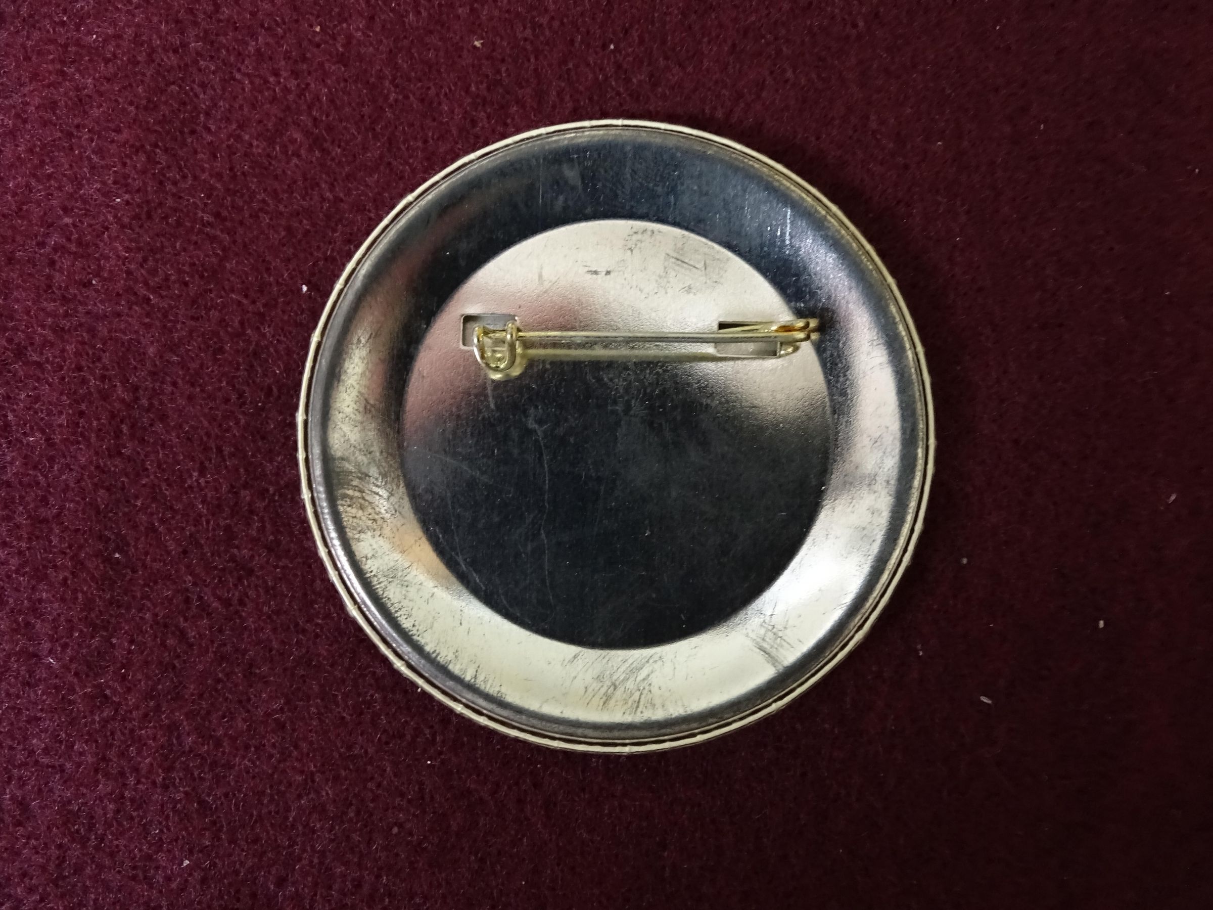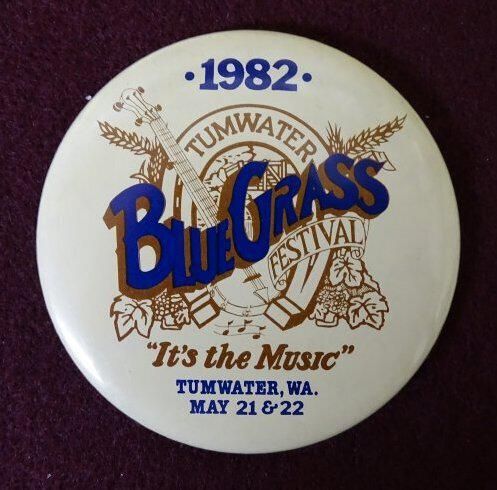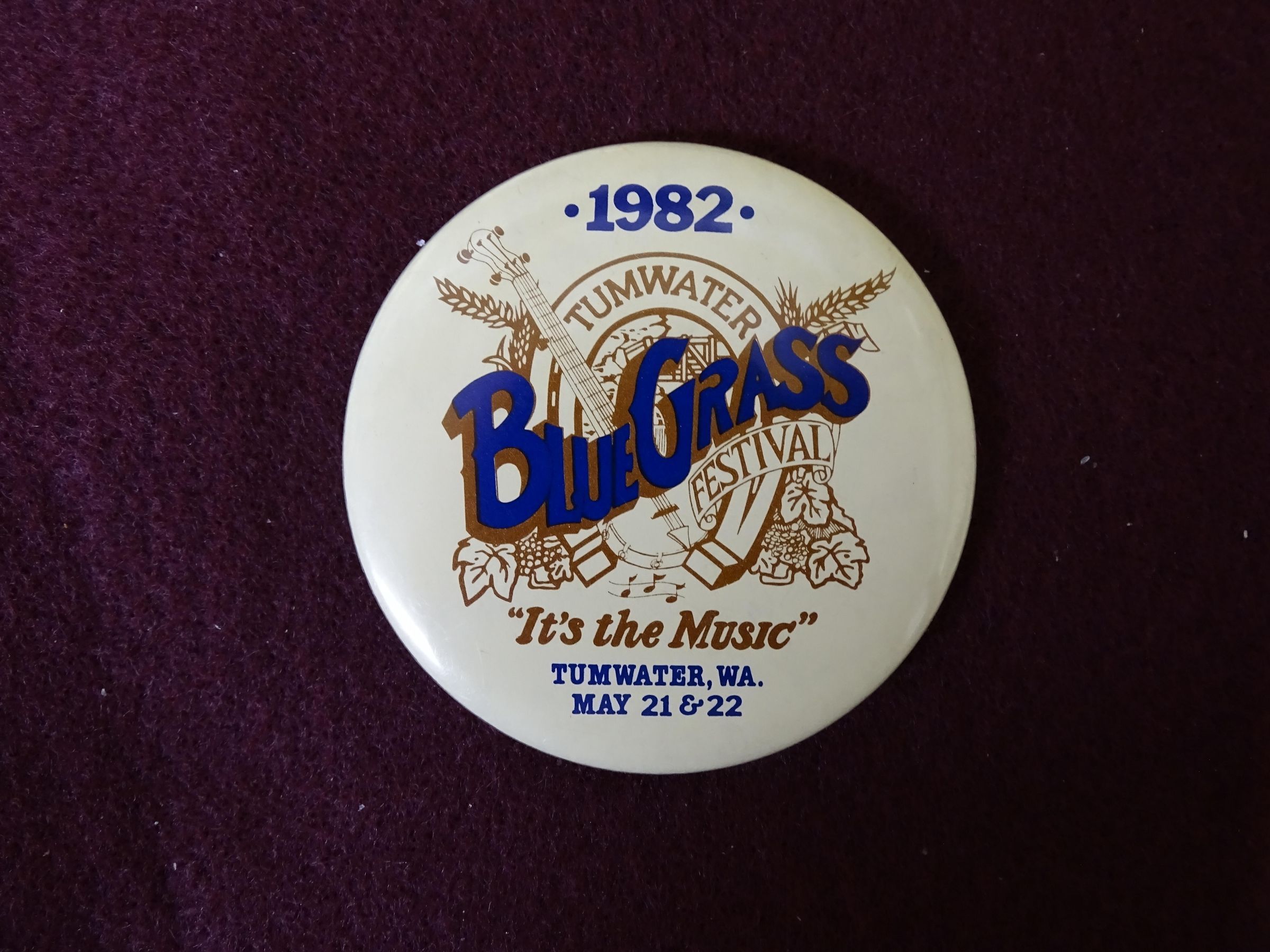 Yellow metal button with brown and blue ink. On the front is an image of a horse shoe, a guitar, leaves and branches, and musical notes. Also on the front are the words "1982, Tumwater Blue Grass, 'It's the Music', Tumwater, WA, May 21 & 22".Relationships