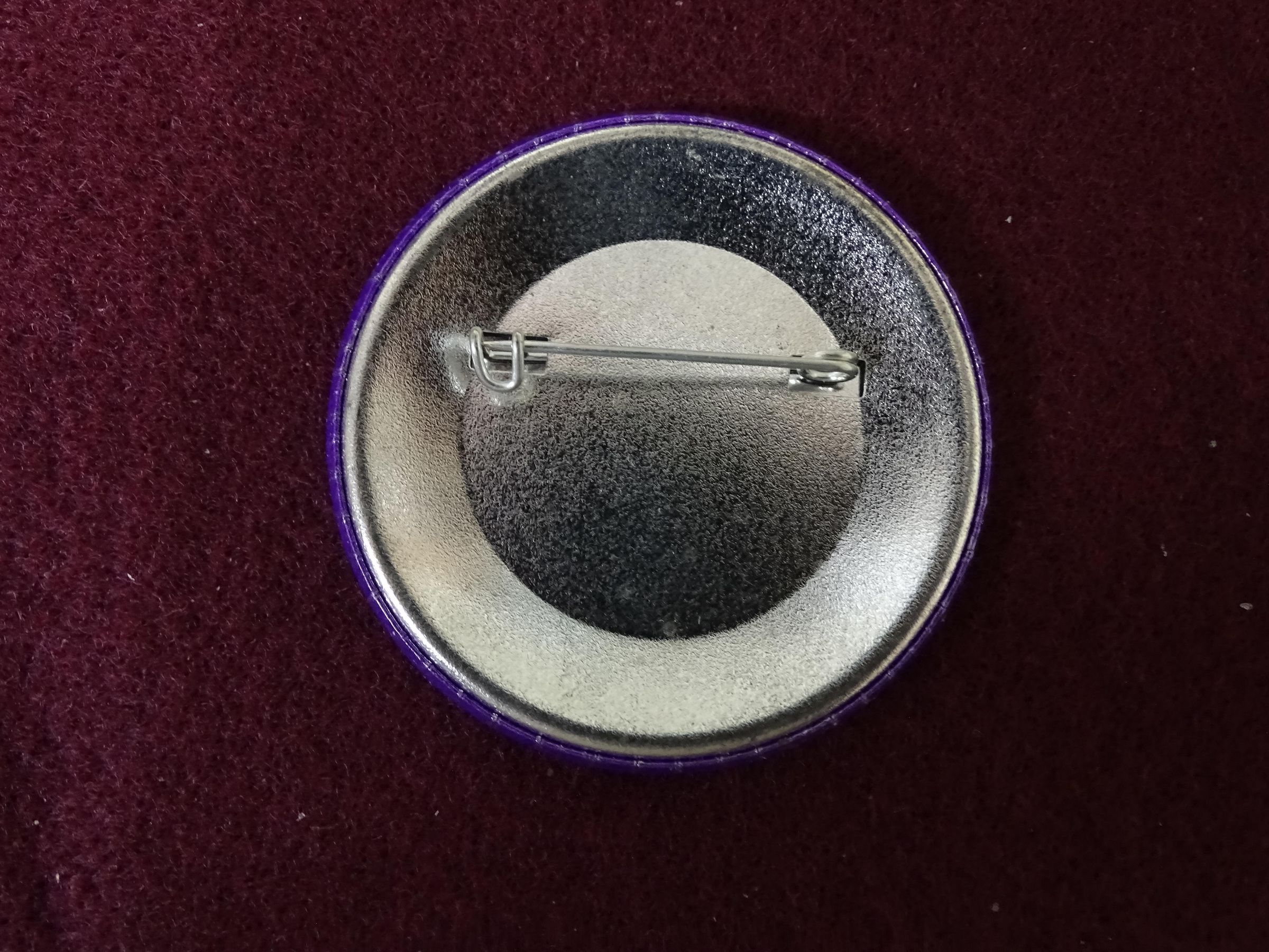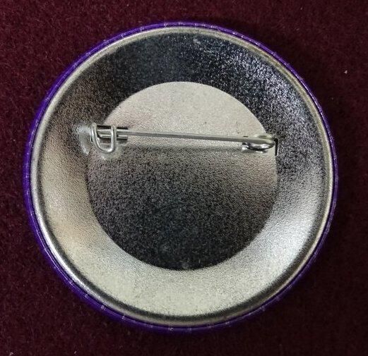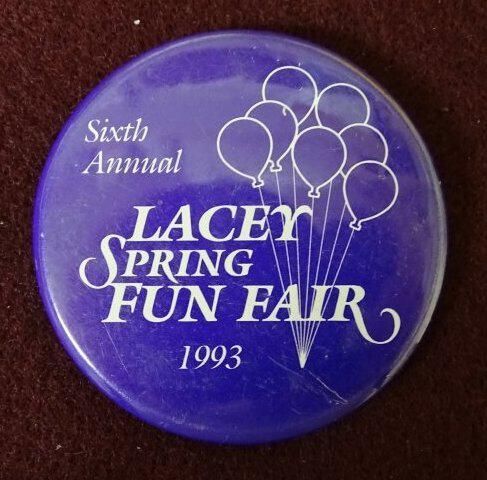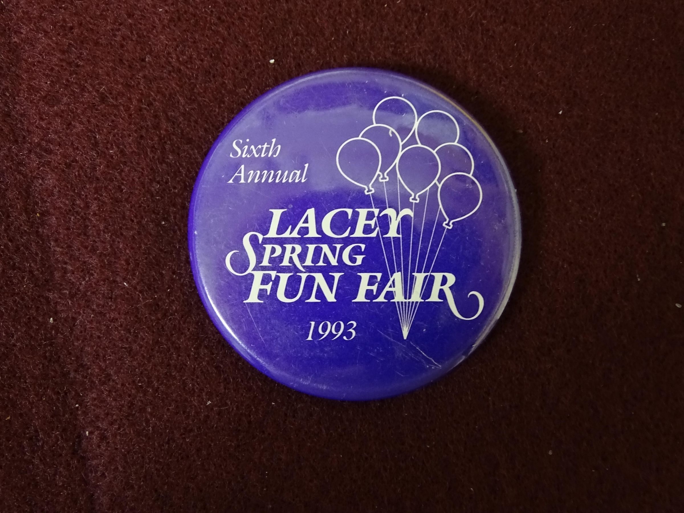 Purple metal button with white printing. On the front is "Sixth Annual Lacey Spring Fun Fair, 1993" and an image of balloons.Relationships