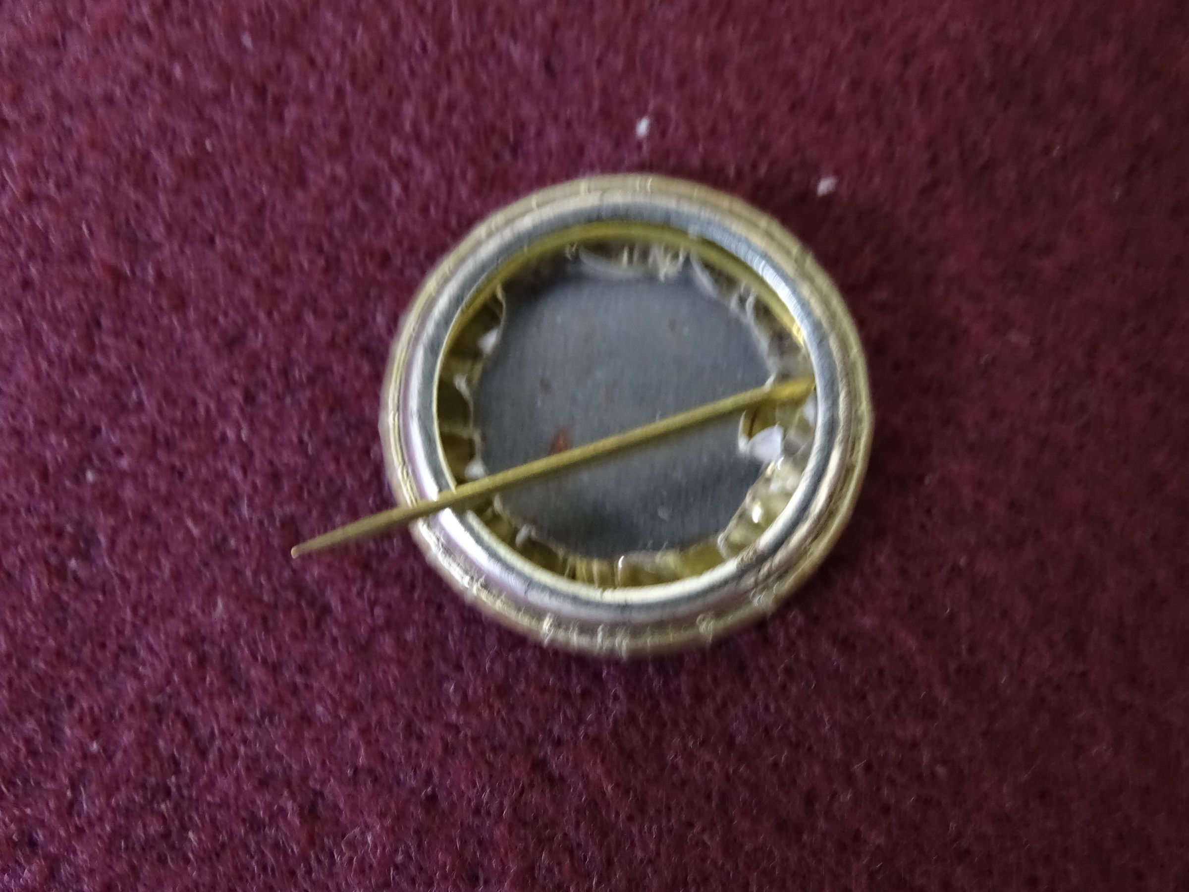 Gold colored metal button with purple ink. On the front is "Lacey 1975 Festival' and an image of a lyre.Dimensions