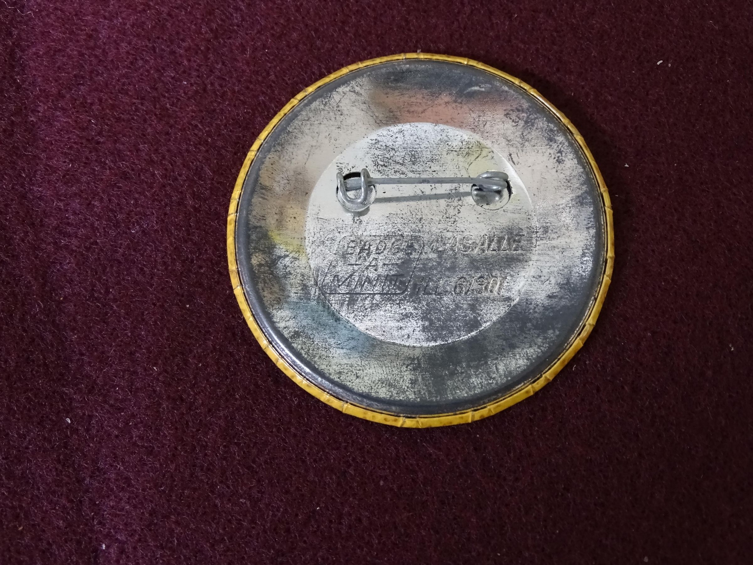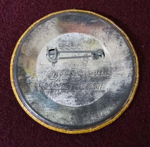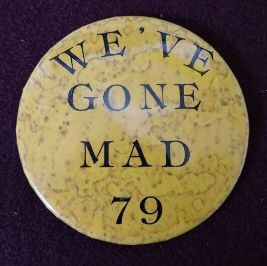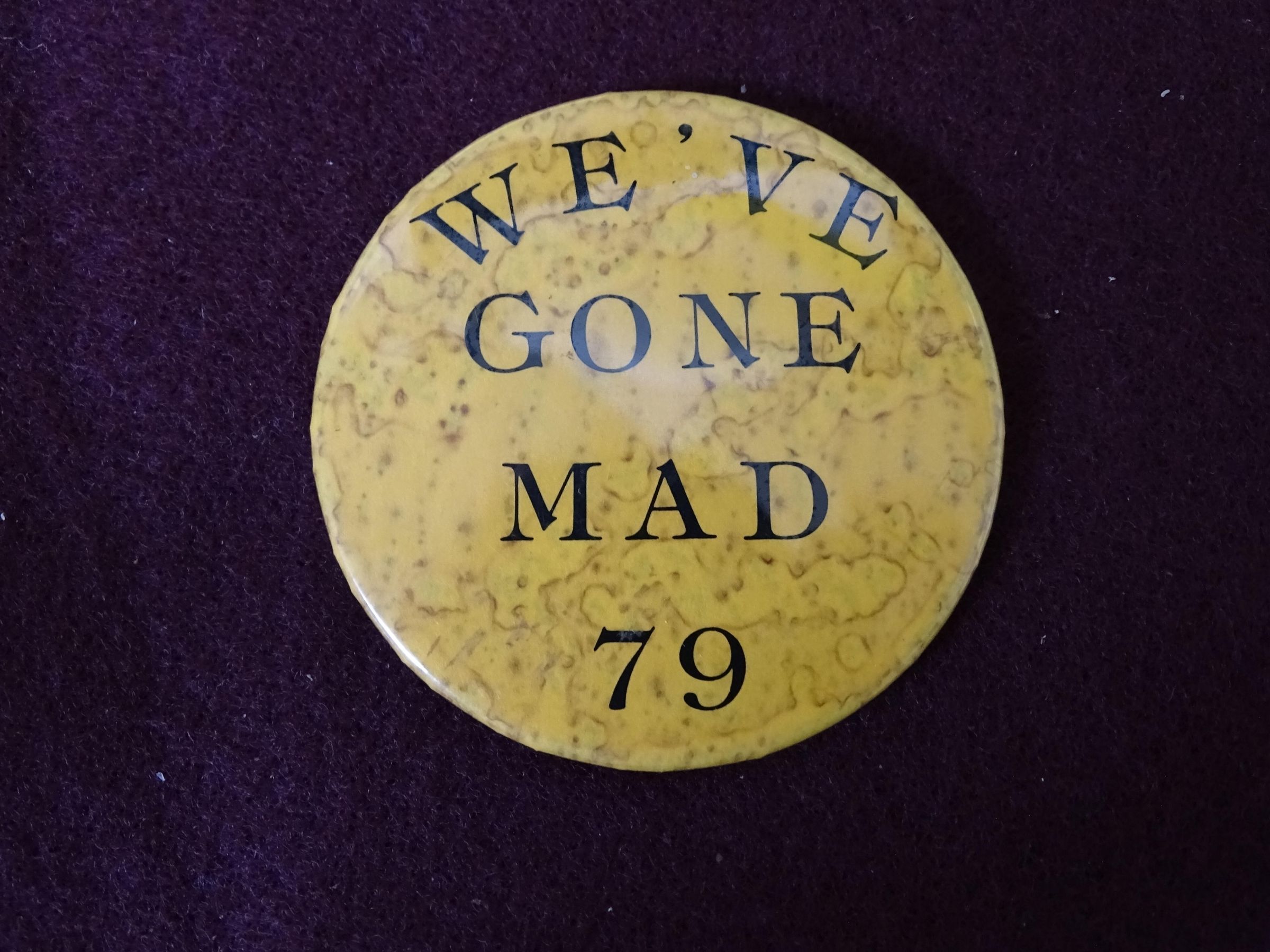 Speckled orange metal button with black ink. On the front is "We've Gone Mad 79" On the back is "Badge-A-Minit, Lasalle, Ill, 61301"Relationships