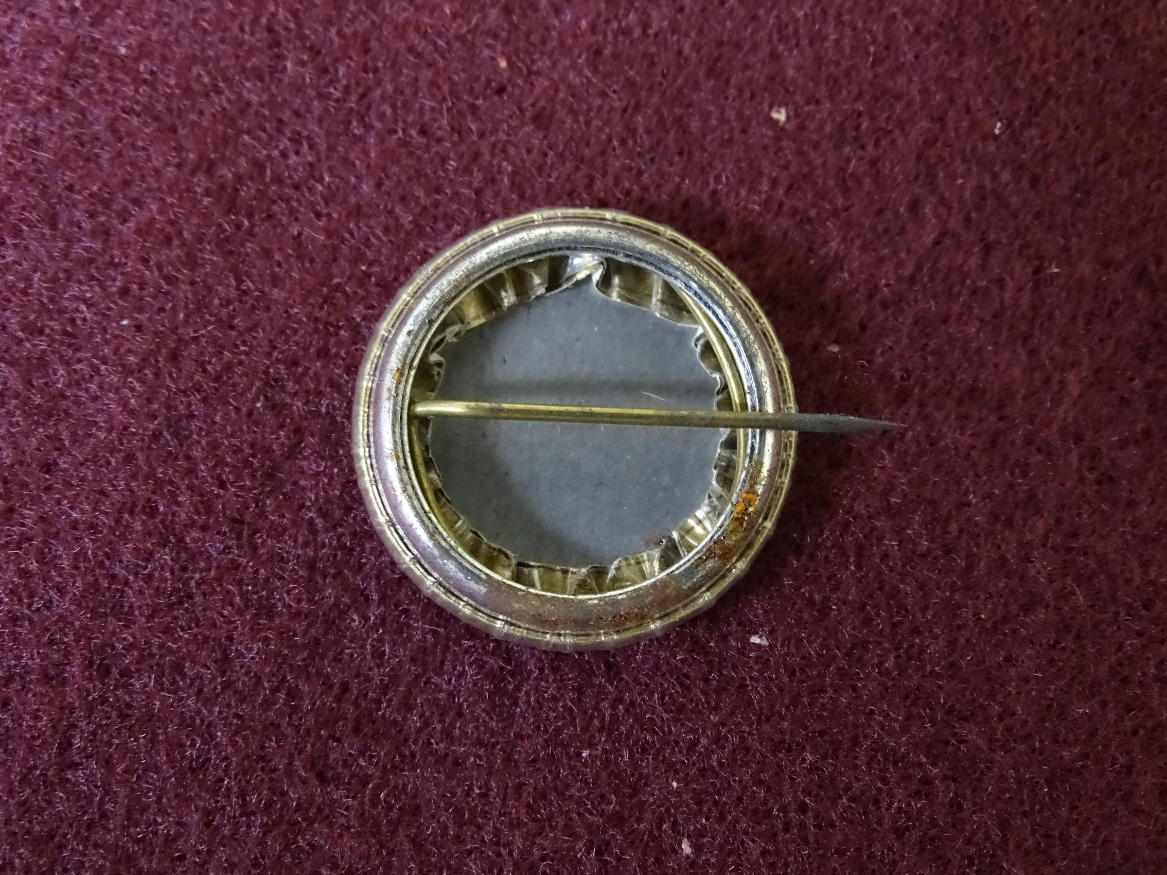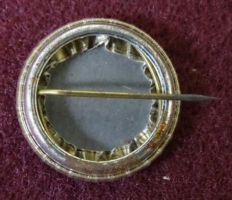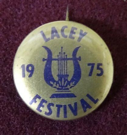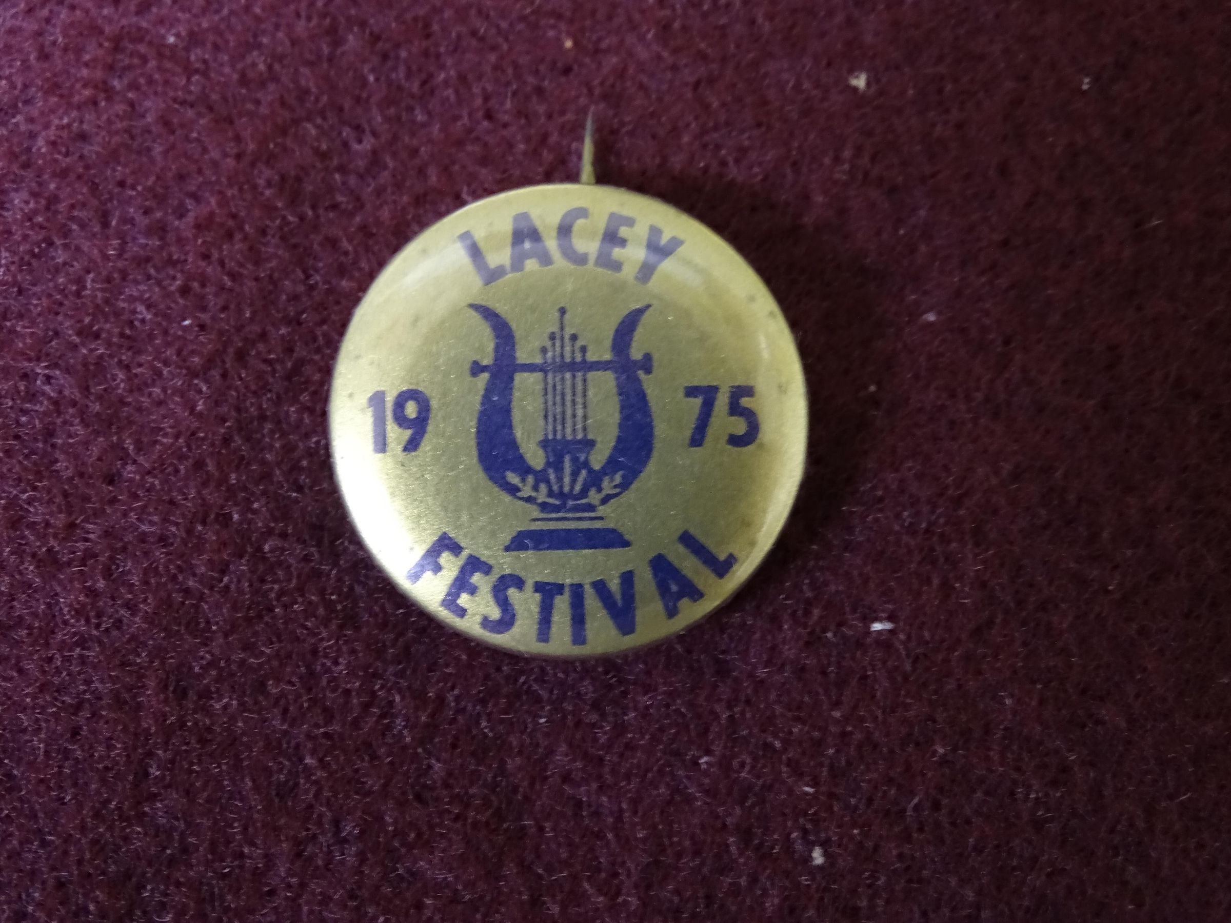Gold colored metal button with purple ink. On the front is "Lacey 1975 Festival' and an image of a lyre.Dimensions