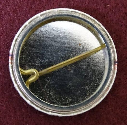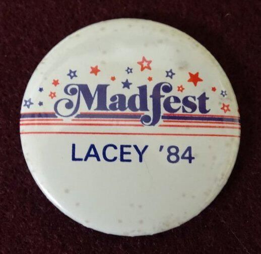 White metal button with red and blue ink. There are stars and stripes and the words "Madfest Lacey '84".Relationships