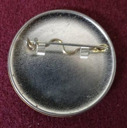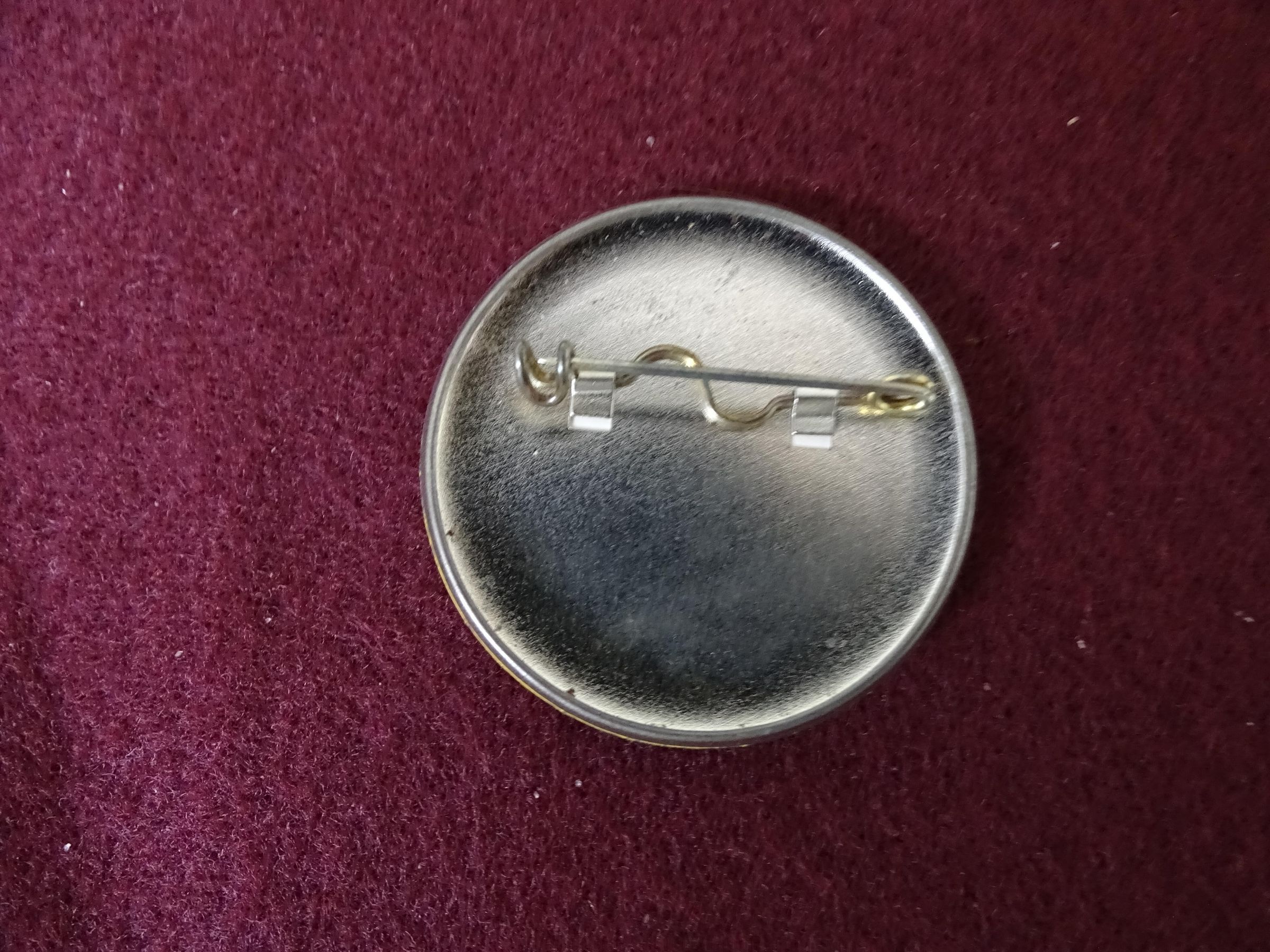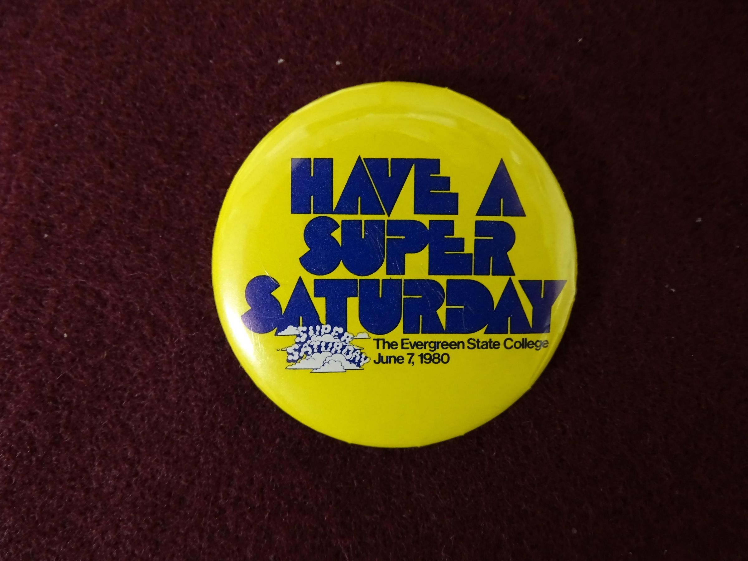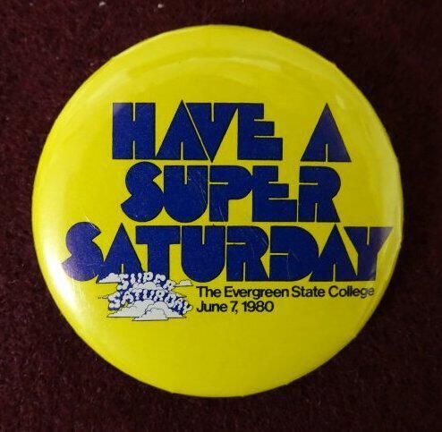 Yellow metal button with blue ink. On the front are the words "Have a Super Saturday, The Evergreen State College, June 7, 1980". Also is a small image of a clouds spelling out Super Saturday.Relationships