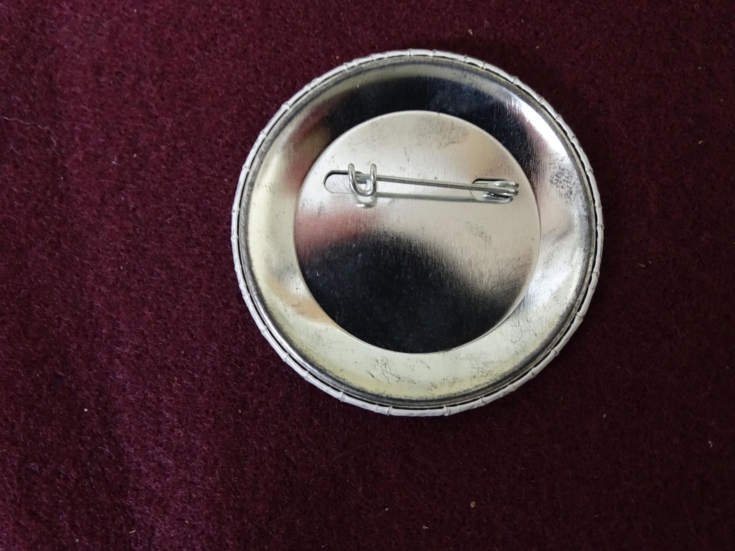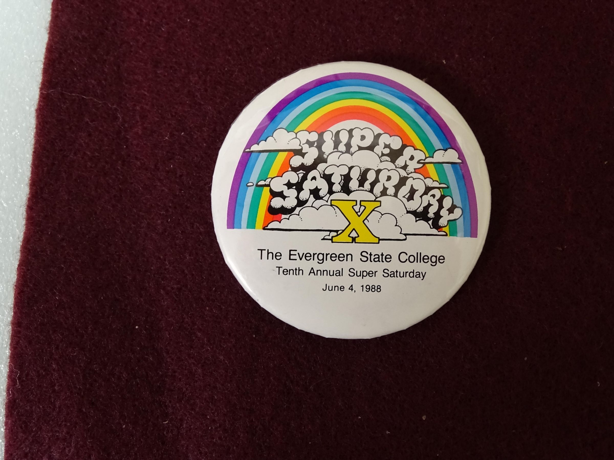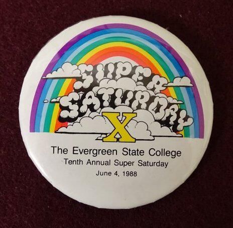 White metal button with purple, blue, green, yellow, orange, and black ink. On the front is an image of a rainbow and clouds spelling Super Saturday, an "X", and the words "The Evergreen State College, Tenth Annual Super Saturday, June 4, 1988".Relationships