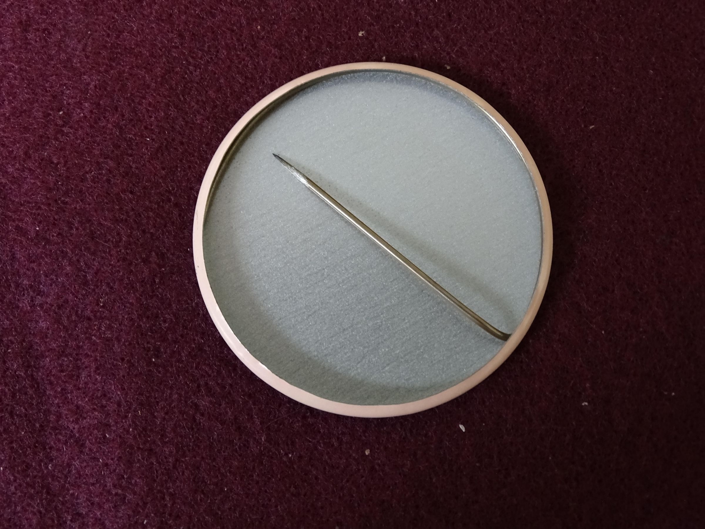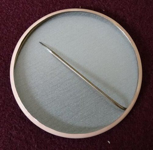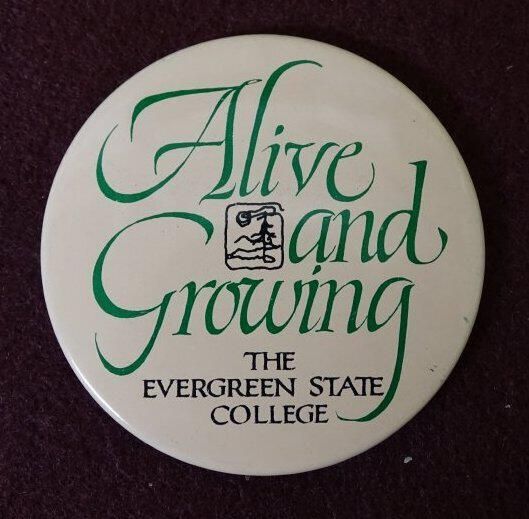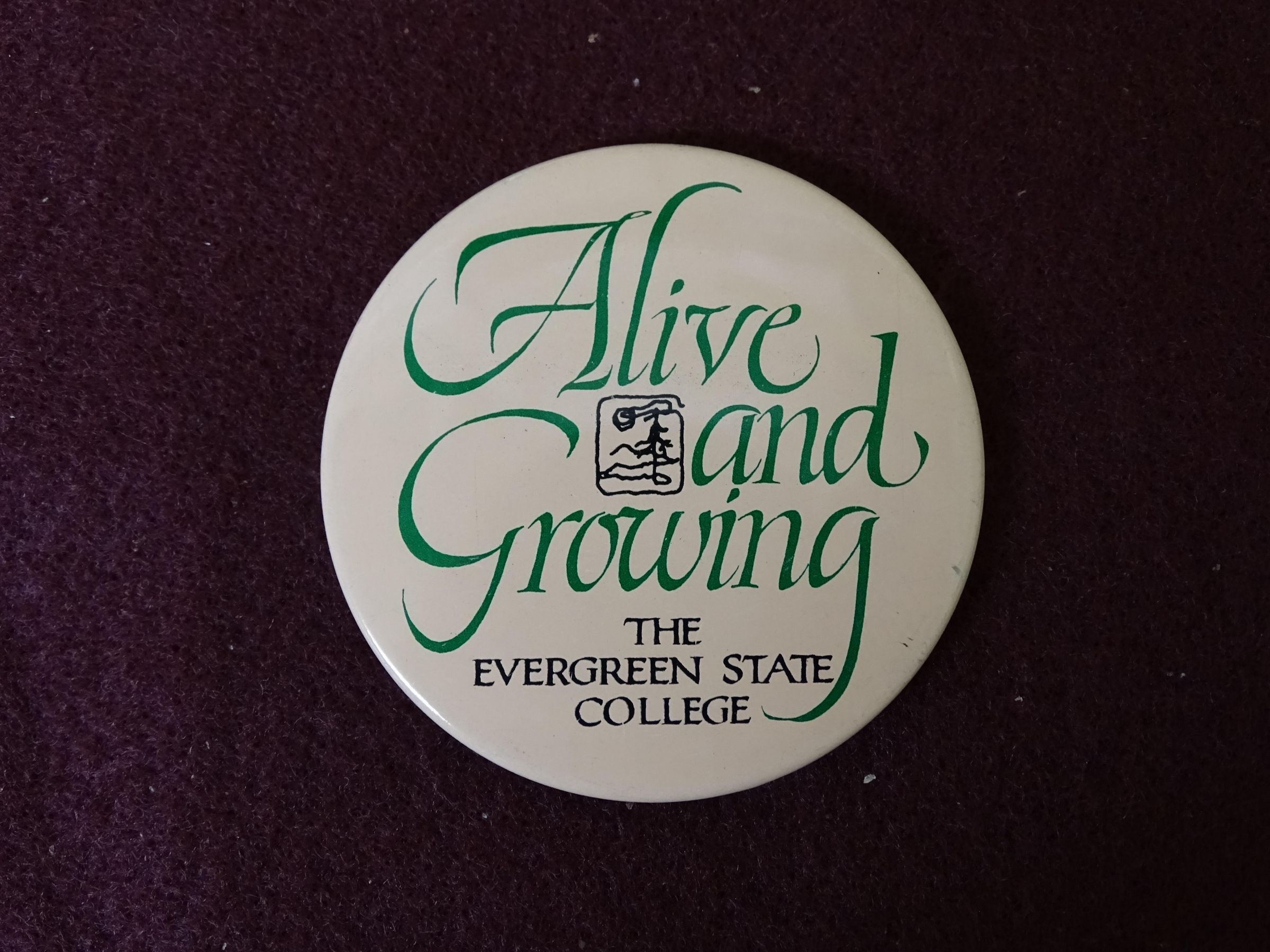 Salmon colored metal button with green and black ink. On the front is an image of a tree and mountains and the words "Alive and Growing, The Evergreen State College".Relationships