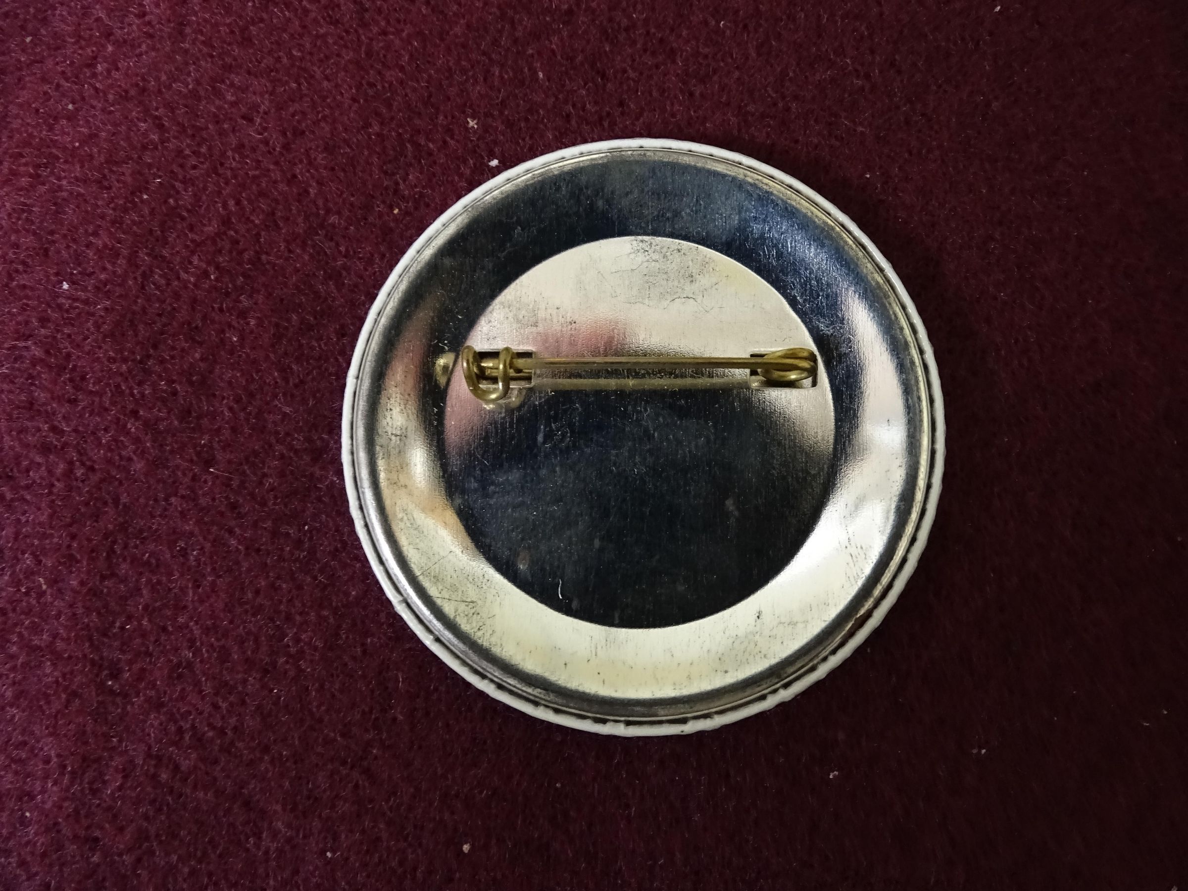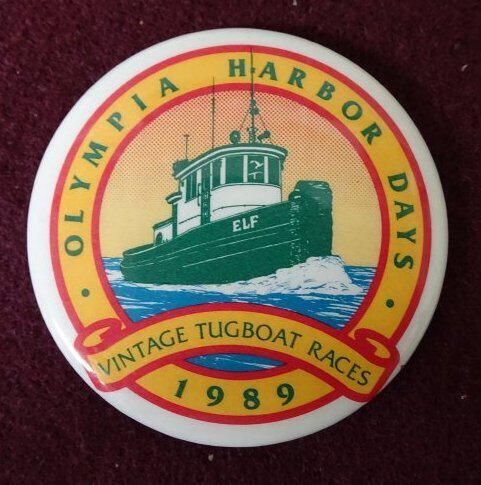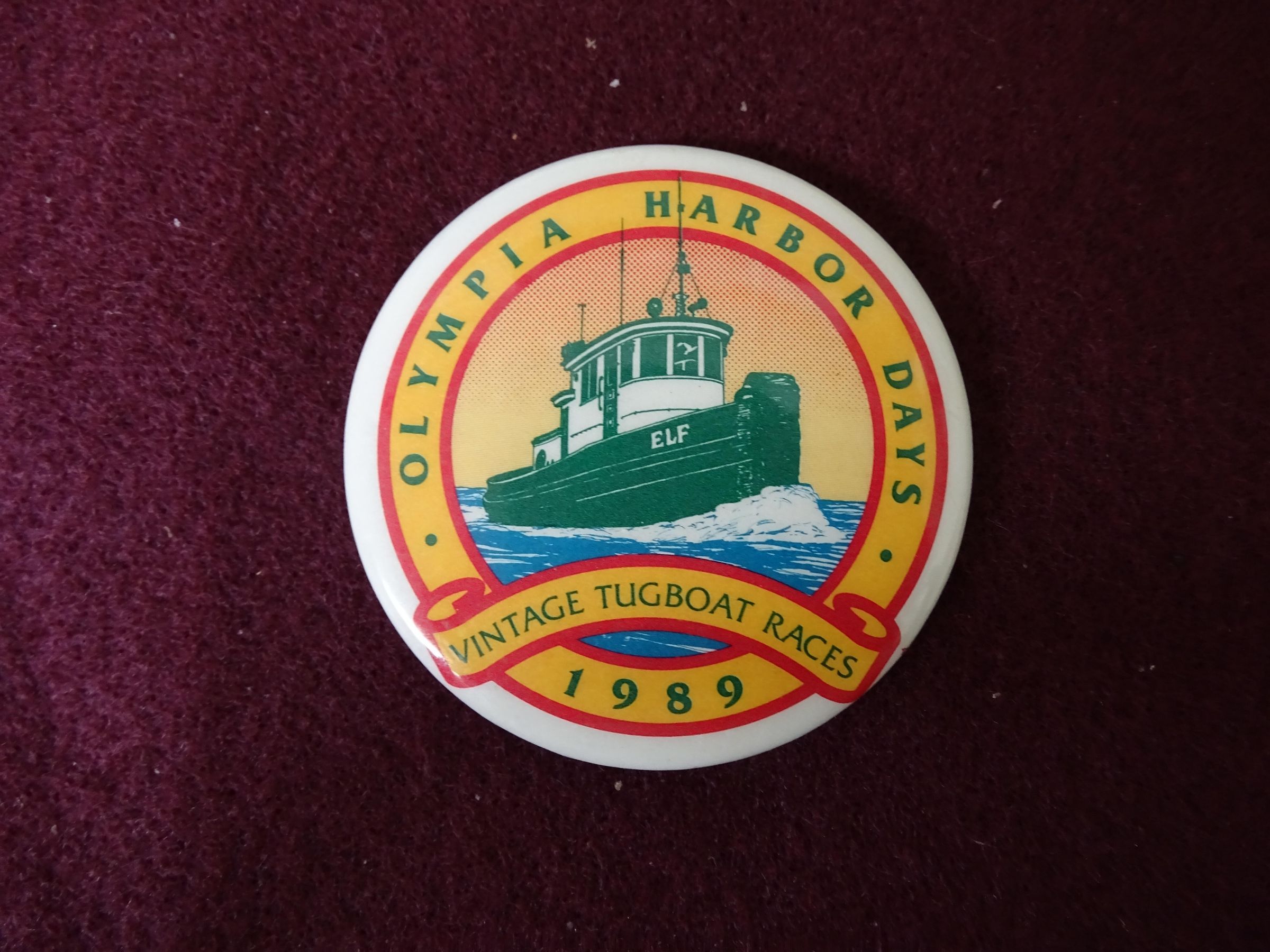 White metal button with red, green, blue, and yellow ink. On the front is an image of the tugboat "Elf" and the words "Olympia Harbor Days 1989, Vintage Tugboat Races".Relationships