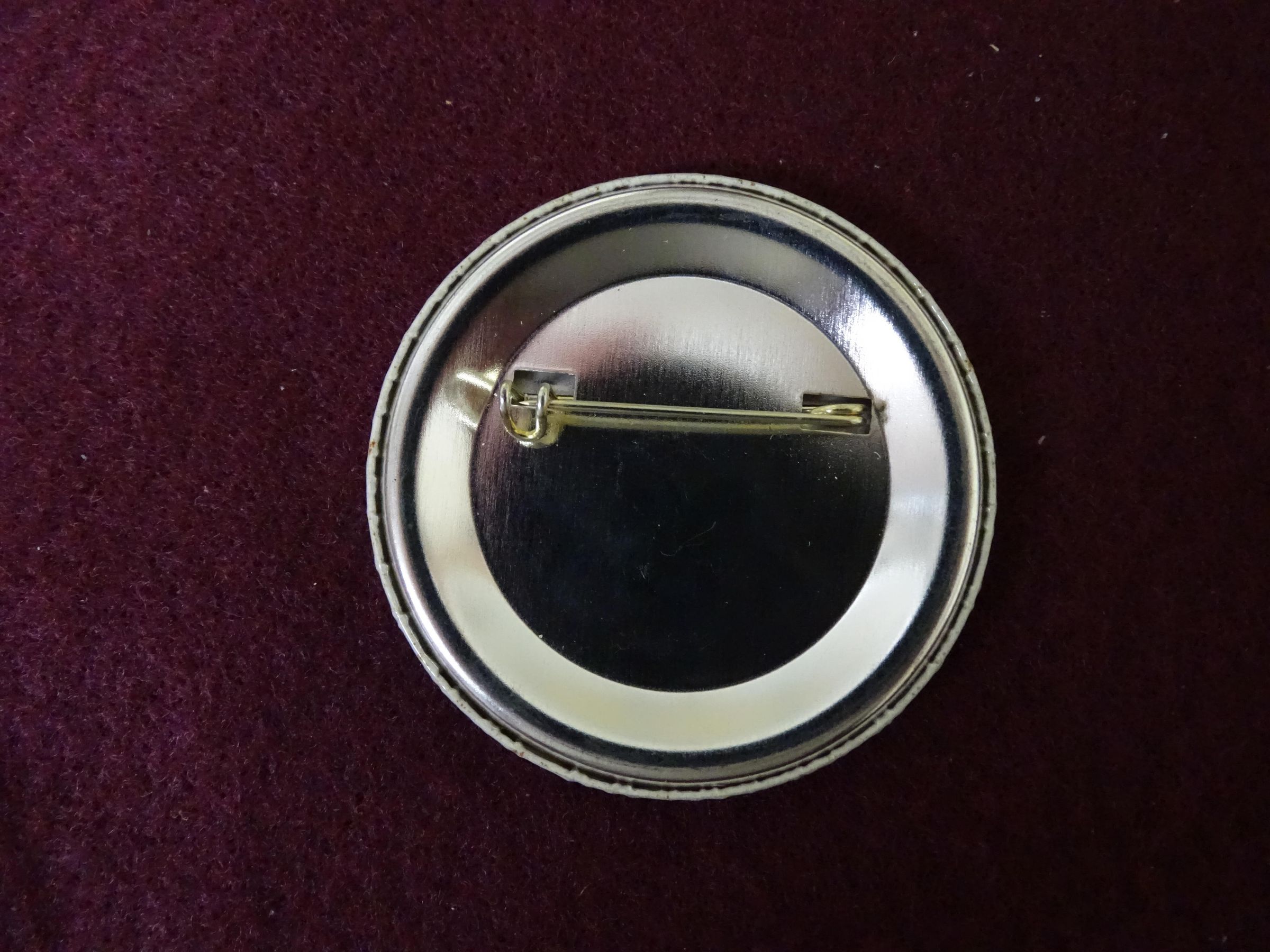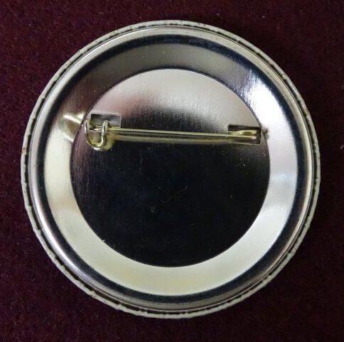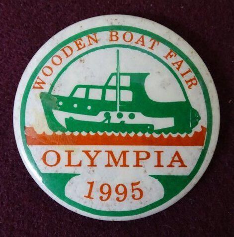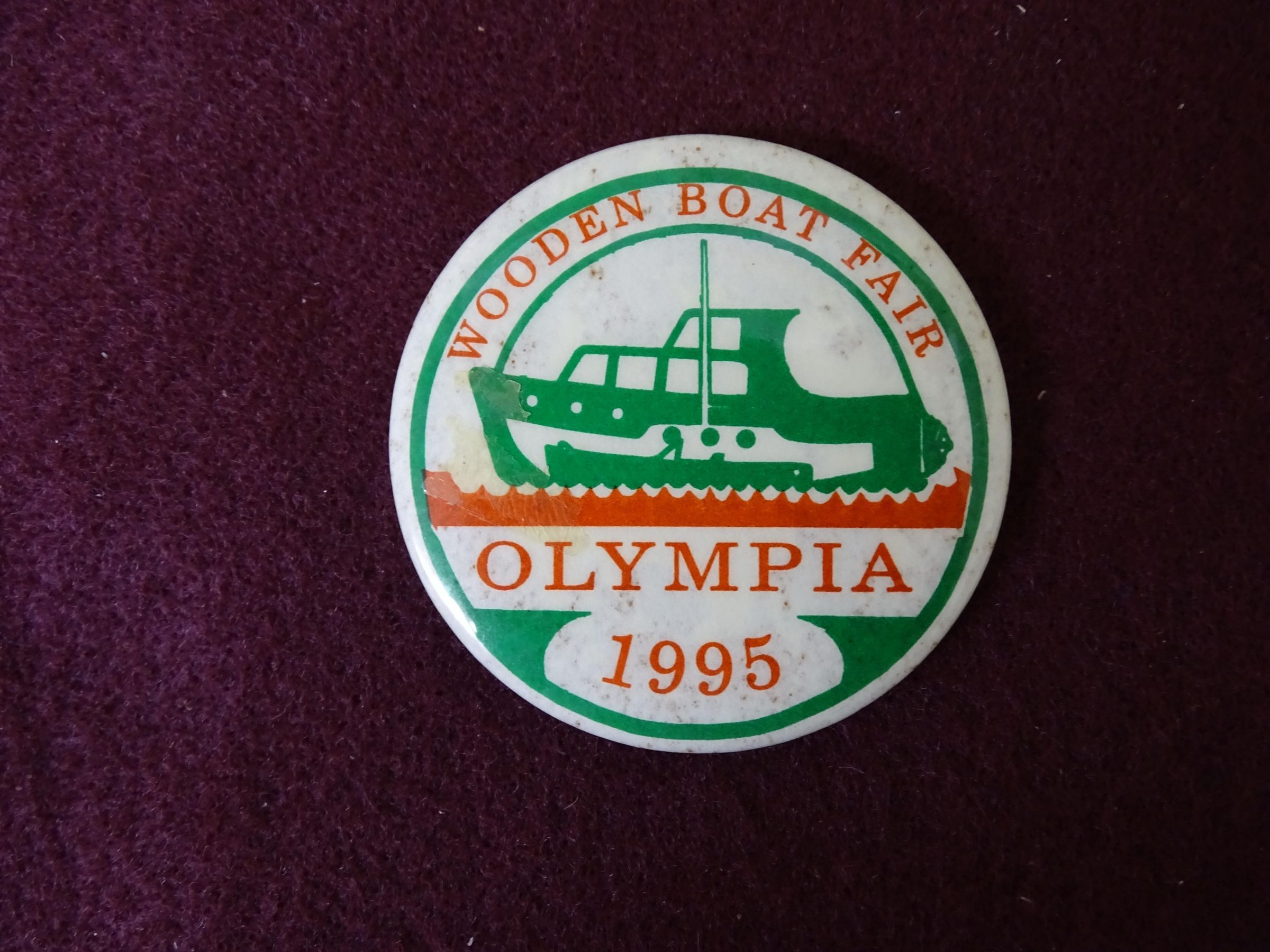 White metal button with green and red ink. On the front is an image of a boat and the words "Wooden Boat Fair, Olympia, 1995".Relationships