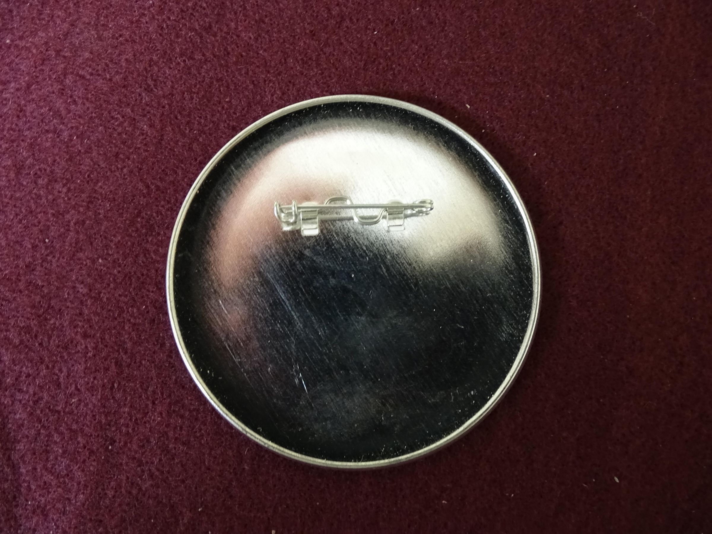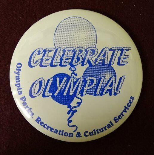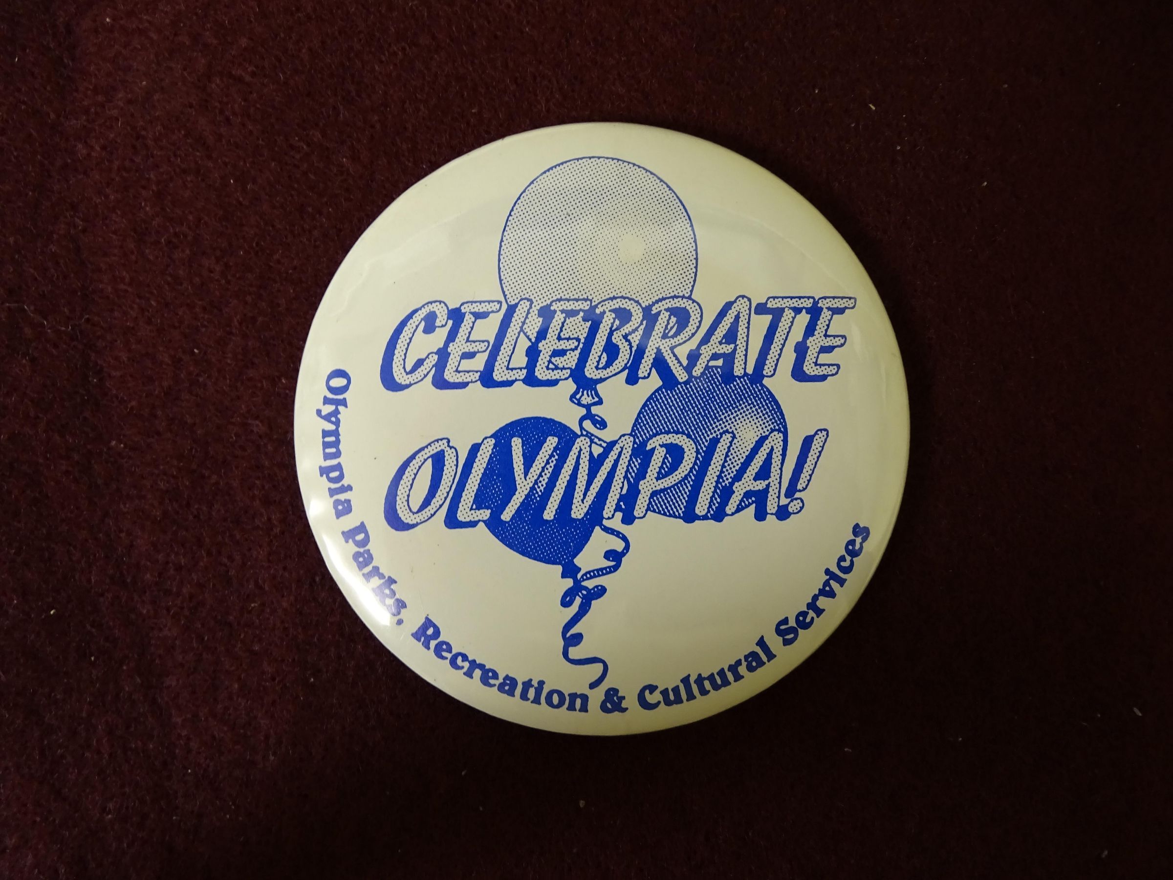 White metal button with blue ink. On the front is an image of balloons and the words "Celebrate Olympia! Olympia Parks, Recreation & Cultural Services".Relationships