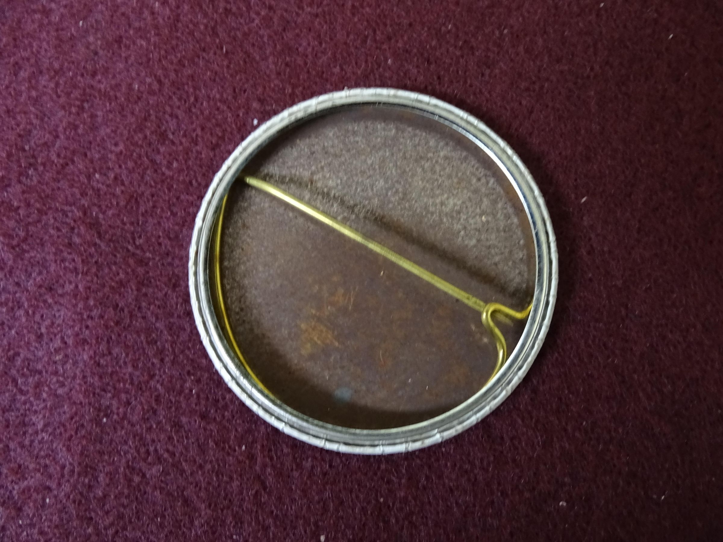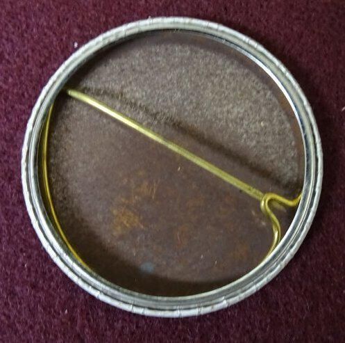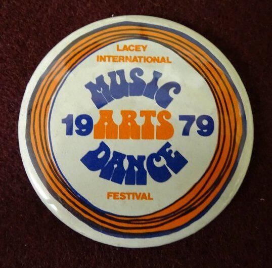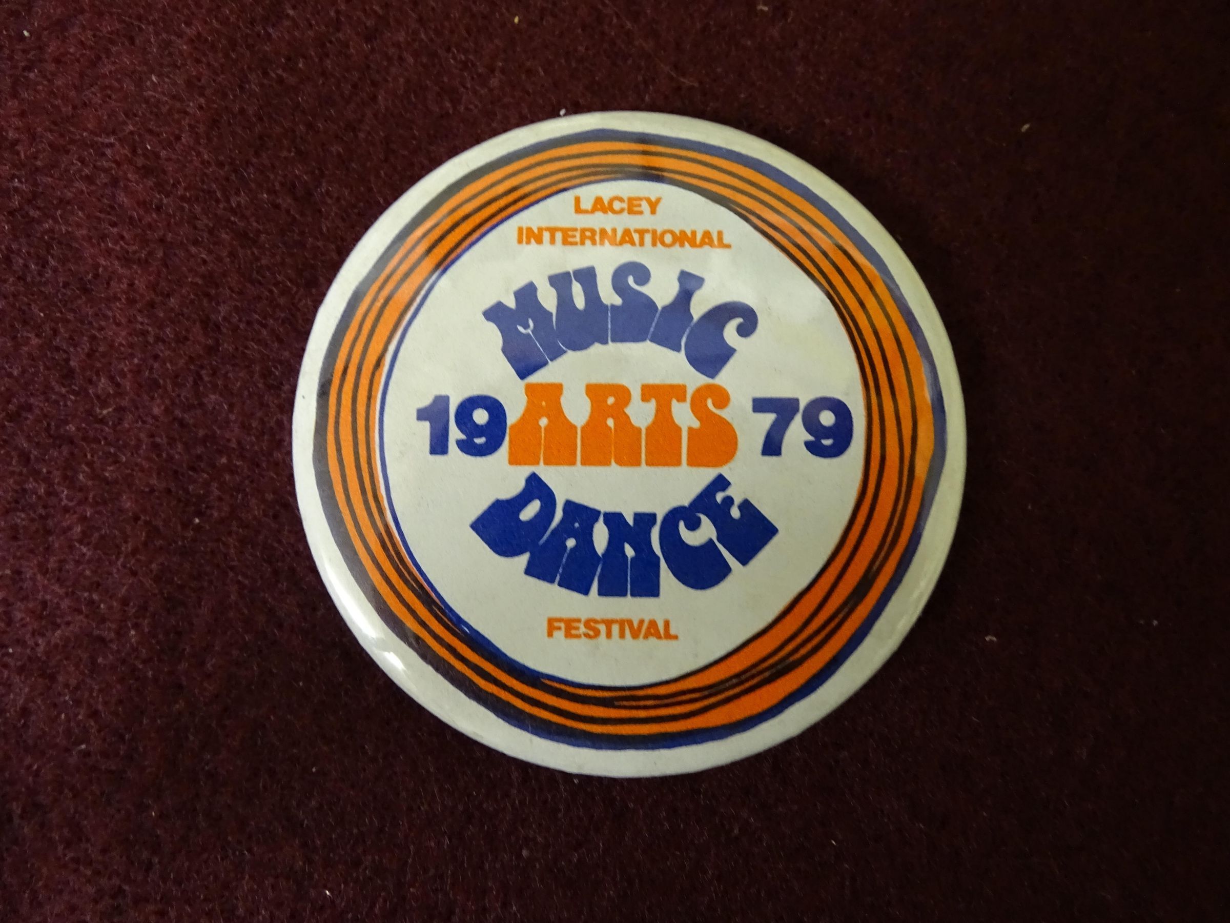 White metal button with orange and blue ink. On the front are the words "Lacey International Music Arts Dance Festival 1979".Relationships