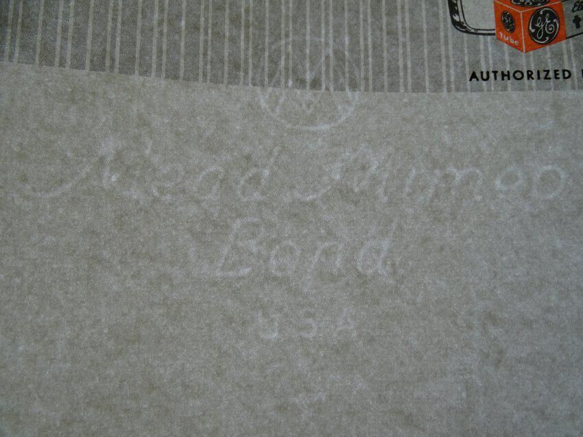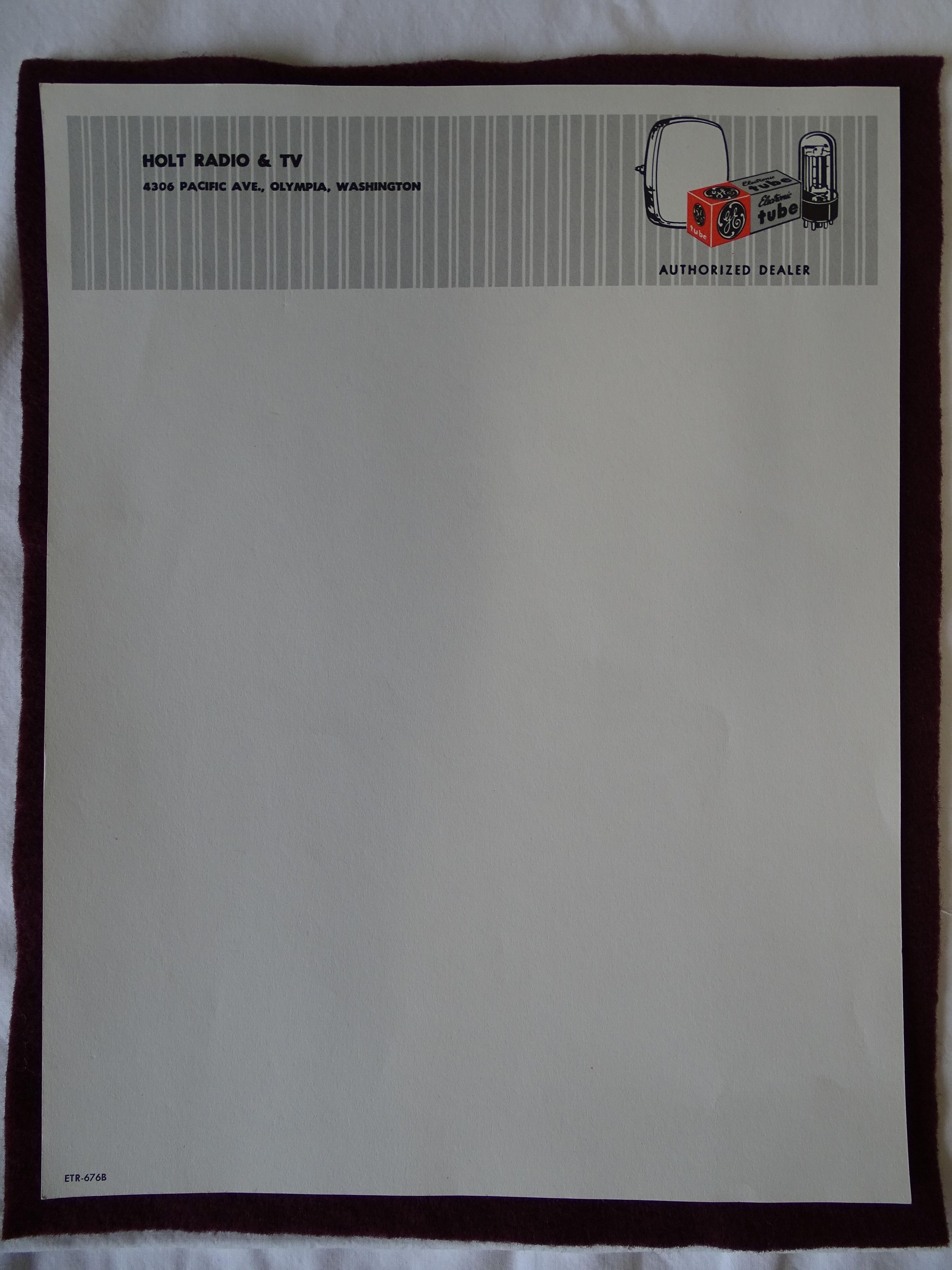 Holt Radio & TV stationery. The piece of paper is 8 1/2" x 11", and is paper thin. The piece of paper is an off-white color with a colored logo and lettering at the top. At the top left is the business address that reads: "Holt Radio & TV, 4306 Pacific Ave., Olympia, Washington." On the top right is an illustration of a TV screen, box and bulb. Underneath the illustration reads: "authorized dealer." In the illustration of the box is a GE product that reads: "electronic tube", with the GE logo. Behind the address and illustration is a back design of a grey lined pattern that is located on the top of the piece of paper. At the bottom left side of the paper is a product number that reads: "ETR-676B." In the top center of the paper is a water mark that reads: "Mead Mimod Bond USA", with a M logo above the lettering. There is nothing on the back side.Made/Created