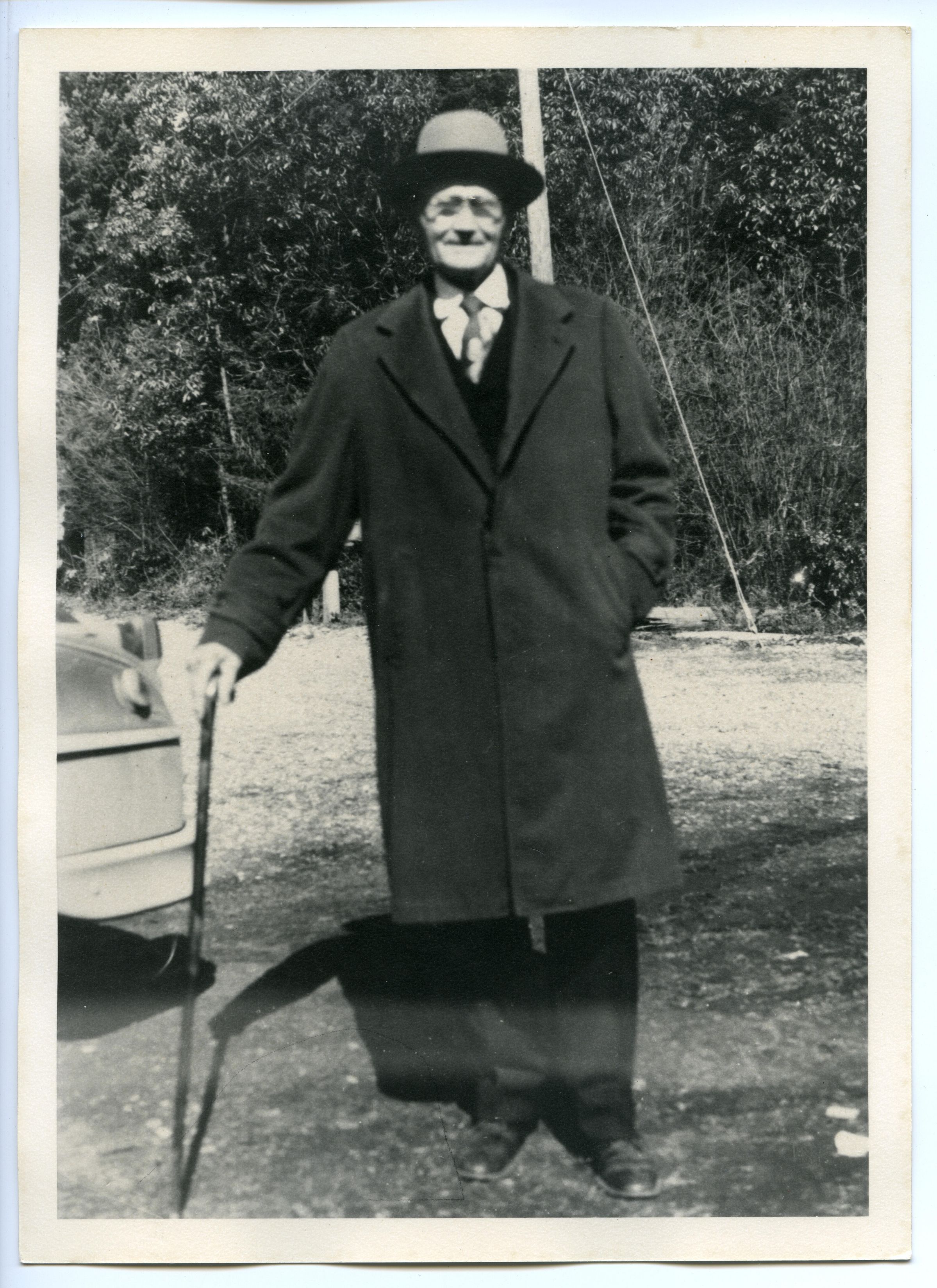 Albin W. Holmes with Walking Cane, Unknown Date. This image shows a man (Albin Holmes, Sr.) wearing a tall-crowned hat with a round brim with an overcoat over a suit. He is wearing glasses and is leaning slightly on a cane in his right hand. He is shown from head-to-toe. He is looking toward the camera and smiling. He is standing in a clear, leveled area with trees and other brush on the far side. A small portion of the back end of a car is visible at the left-hand side of the image. A power pole is partially visible behind Mr. Holmes.Made/Created