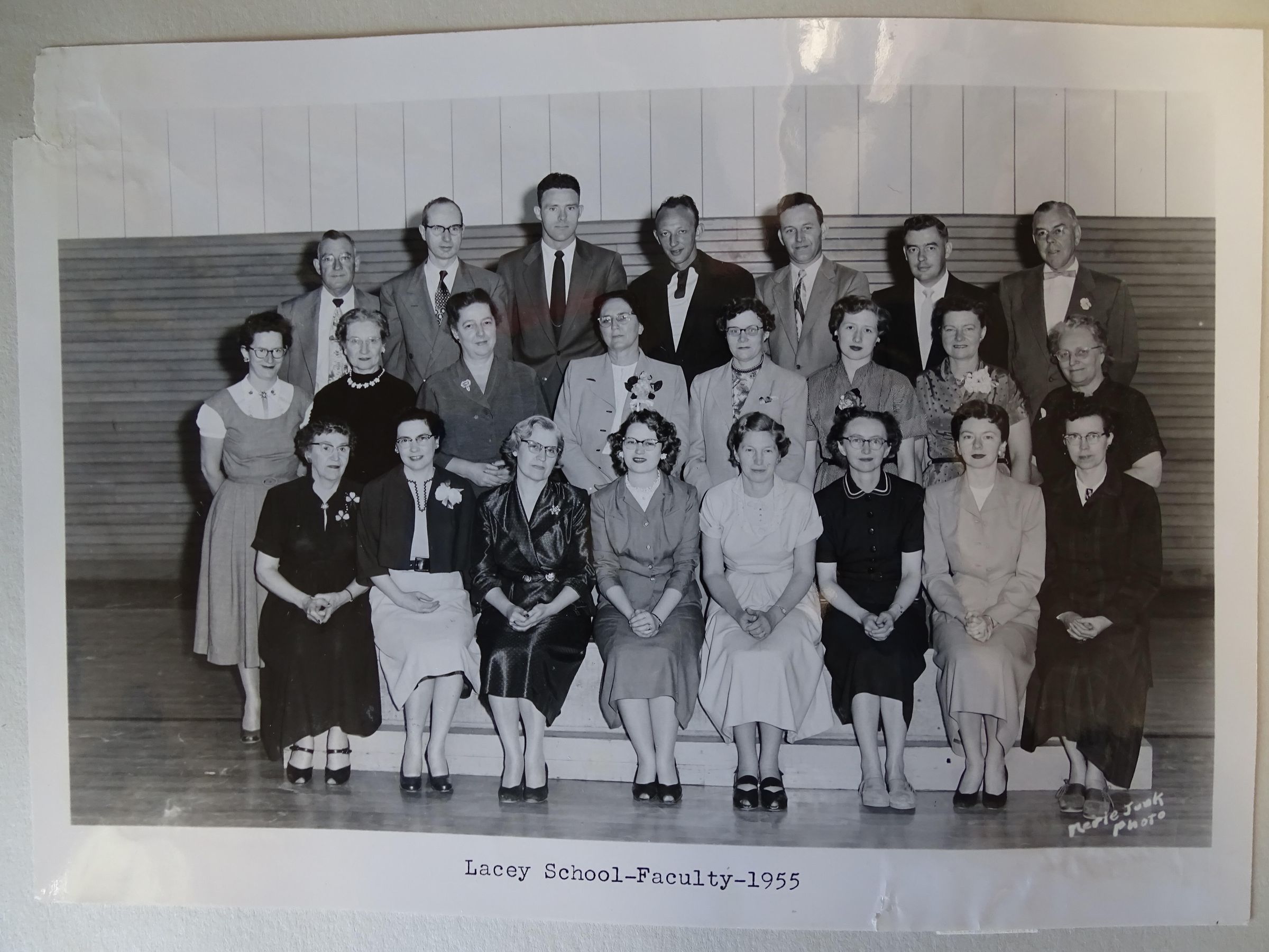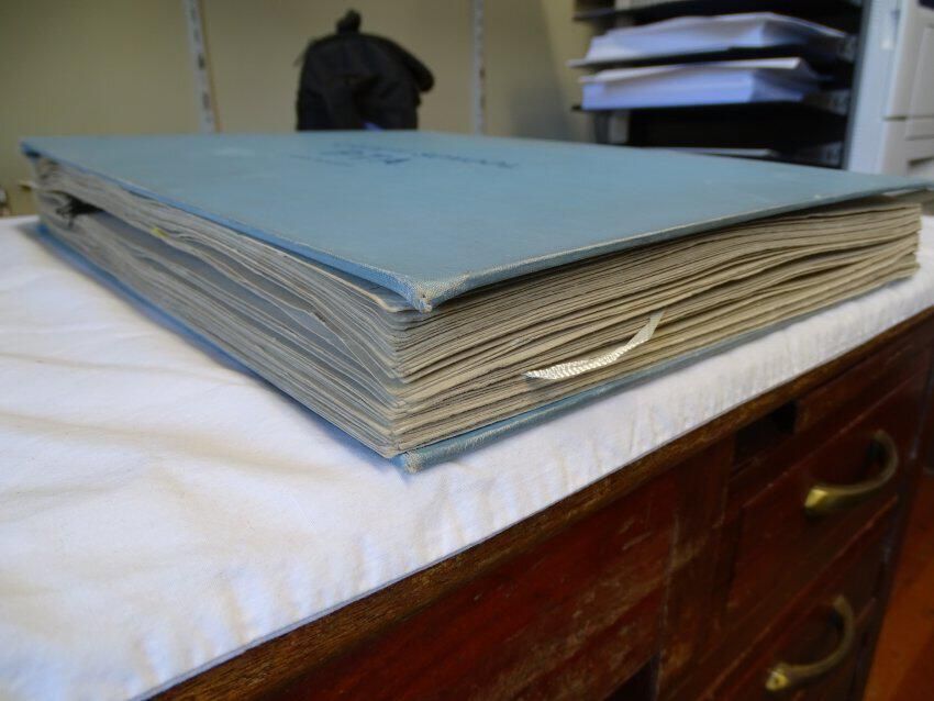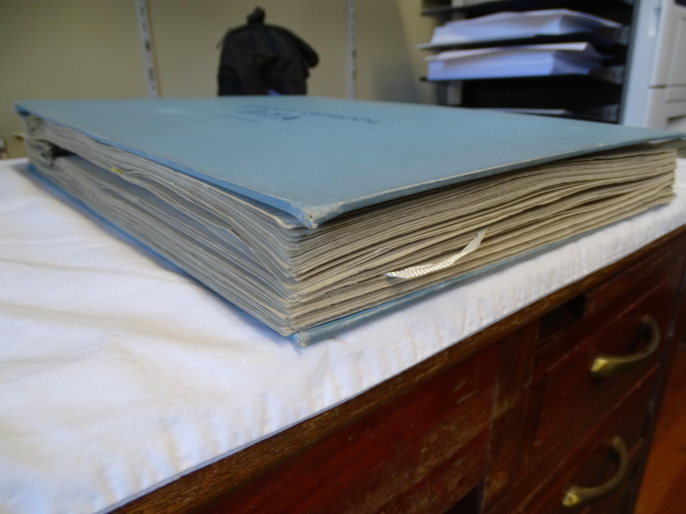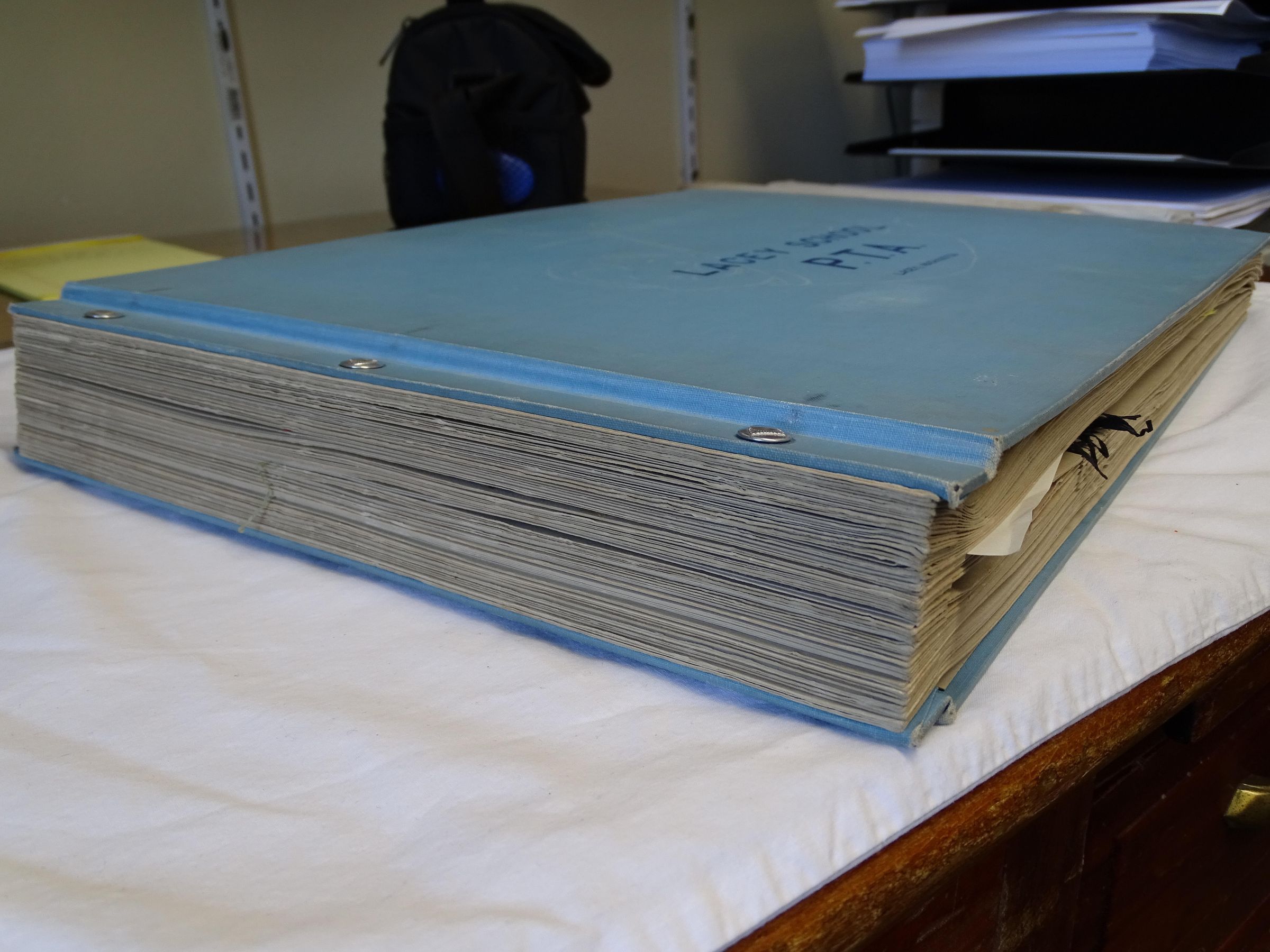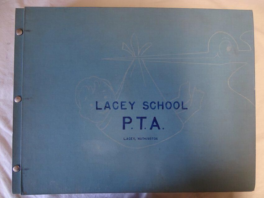 Lacey School PTA scrapbook. The scrapbook is 12 1/4" x 16" x 2". The scrapbook is blue with darker blue lettering on the cover. The cover has a stork and baby drawn on the cover in white. Inside the scrapbook has 100 pages of entries and clippings. Refer to the media tab and word document for the contents of the scrapbook. It lists the contents with a description corresponding to each of the page numbers. There are items that are loose within the book. Each loose item is marked on the back, corresponding to object ID and page number.Made/Created