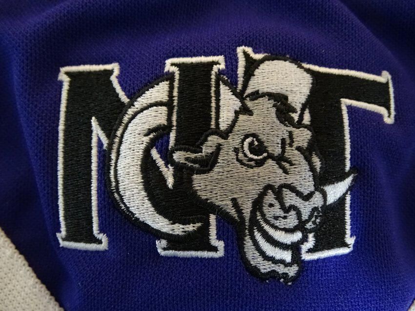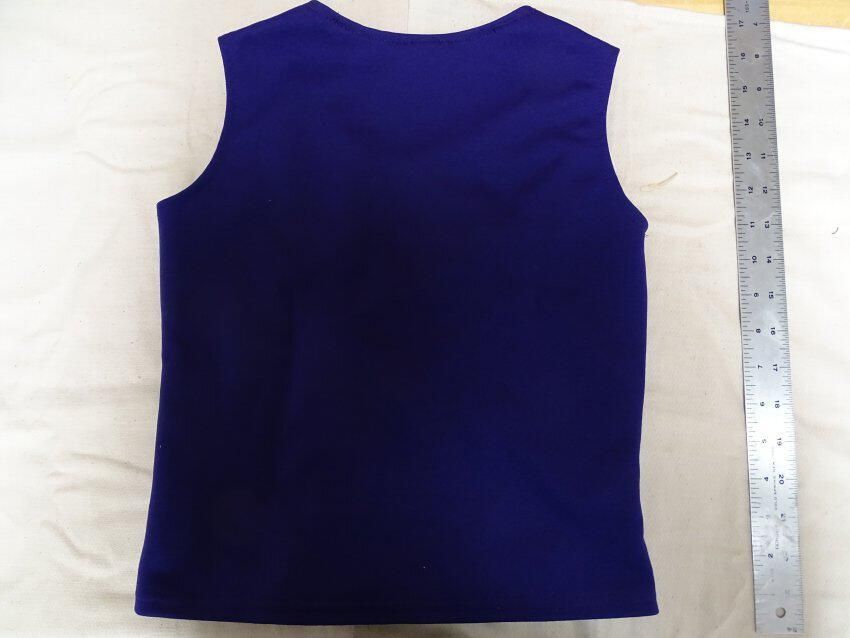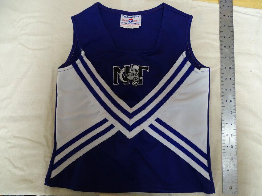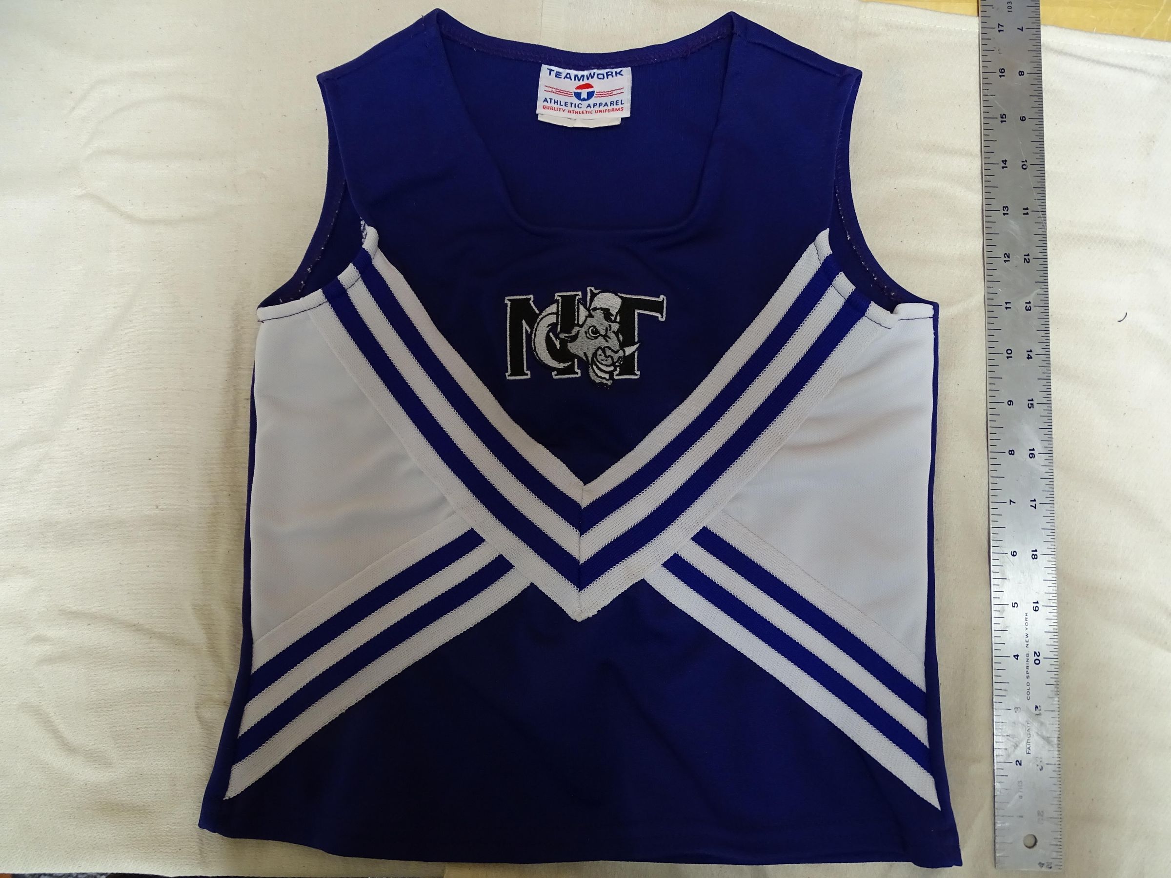 North Thurston cheerleader uniform. It is a small 15" x 16 1/2" x 1/4" uniform. The uniform is blue and white. There are blue and white stripes creating an X in the center. On the top and bottom of the X is blue, whereas the left and right side of the X is white. On the back, it is completely blue. The uniform is made of 100% polyester. In the center at the top is the North Thurston abbreviation NT, with their mascot, a ram between the letters. There is a tag on the collar that reads: "Teamwork athletic apparel", it also states that it was made in the USA. There is a name written behind the tag, it reads: "Jordan."Lexicon