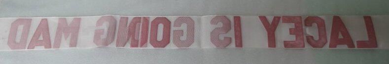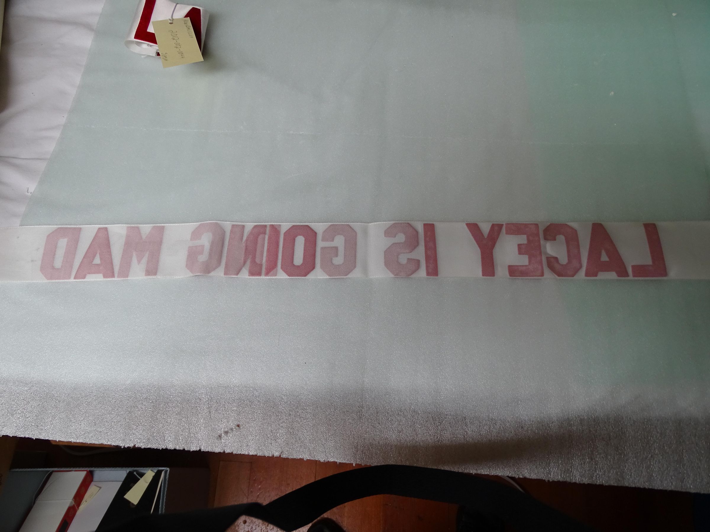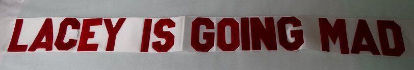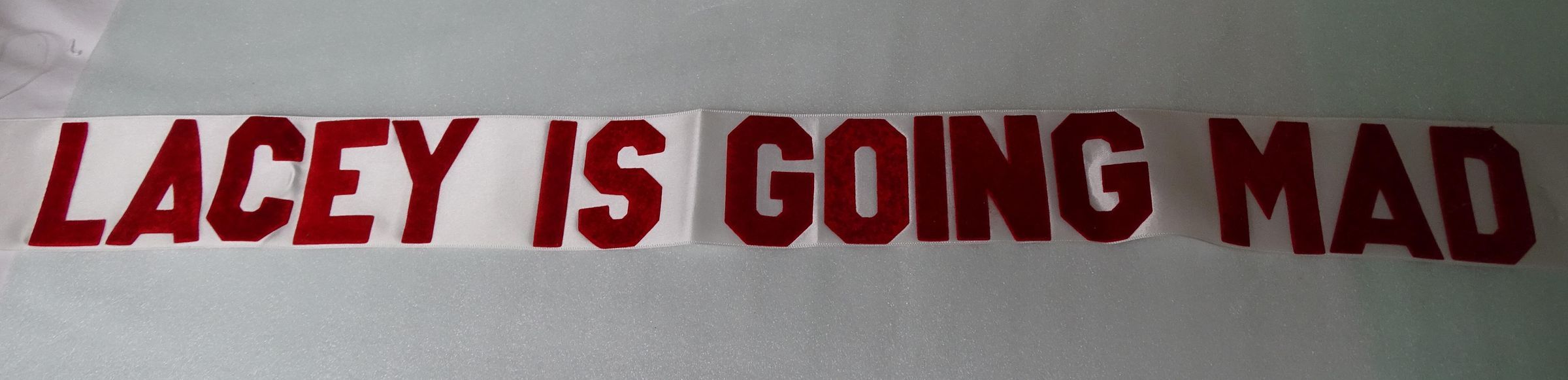 White satin-like cloth with red velvet letters attached that reads "Lacey is going mad". The cloth is long and narrow and was intended to be worn as a sash.