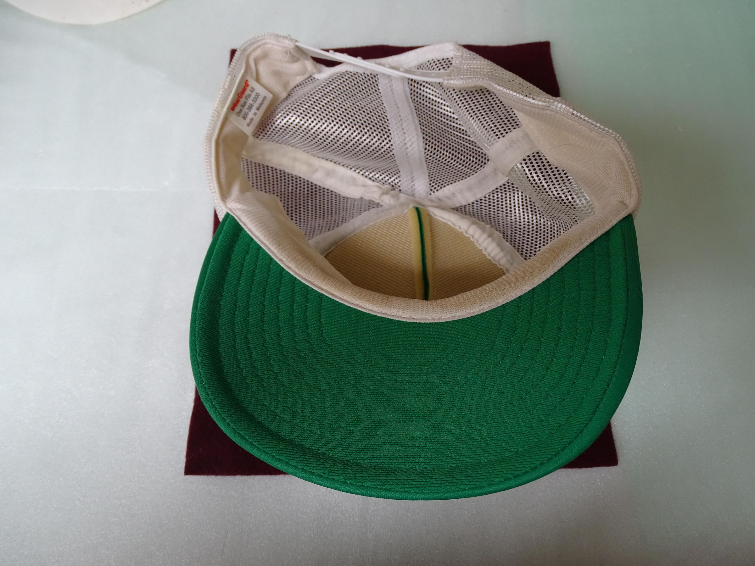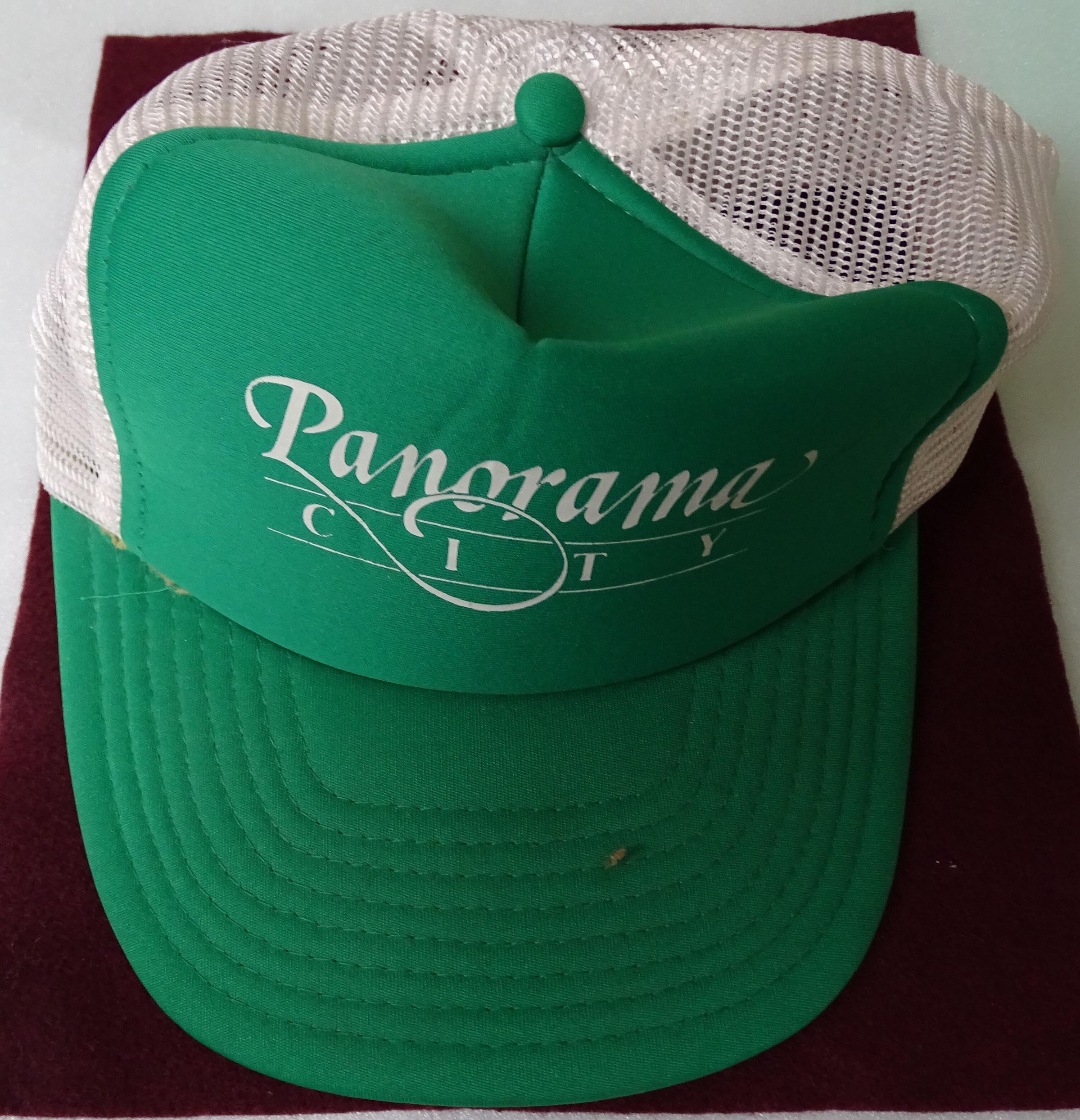 Green and white cloth baseball cap, In white ink are the words "Panorama City". There is a button at the top that is cloth-covered metal. There are two plastic strips at the rear that permit size adjustment. There is a cloth liner in the front portion and the rear portion is mesh. It has a cloth label that says on both sides "Wear Guard, One size fits all, 800-388-3300, made in Malaysia"Dimensions