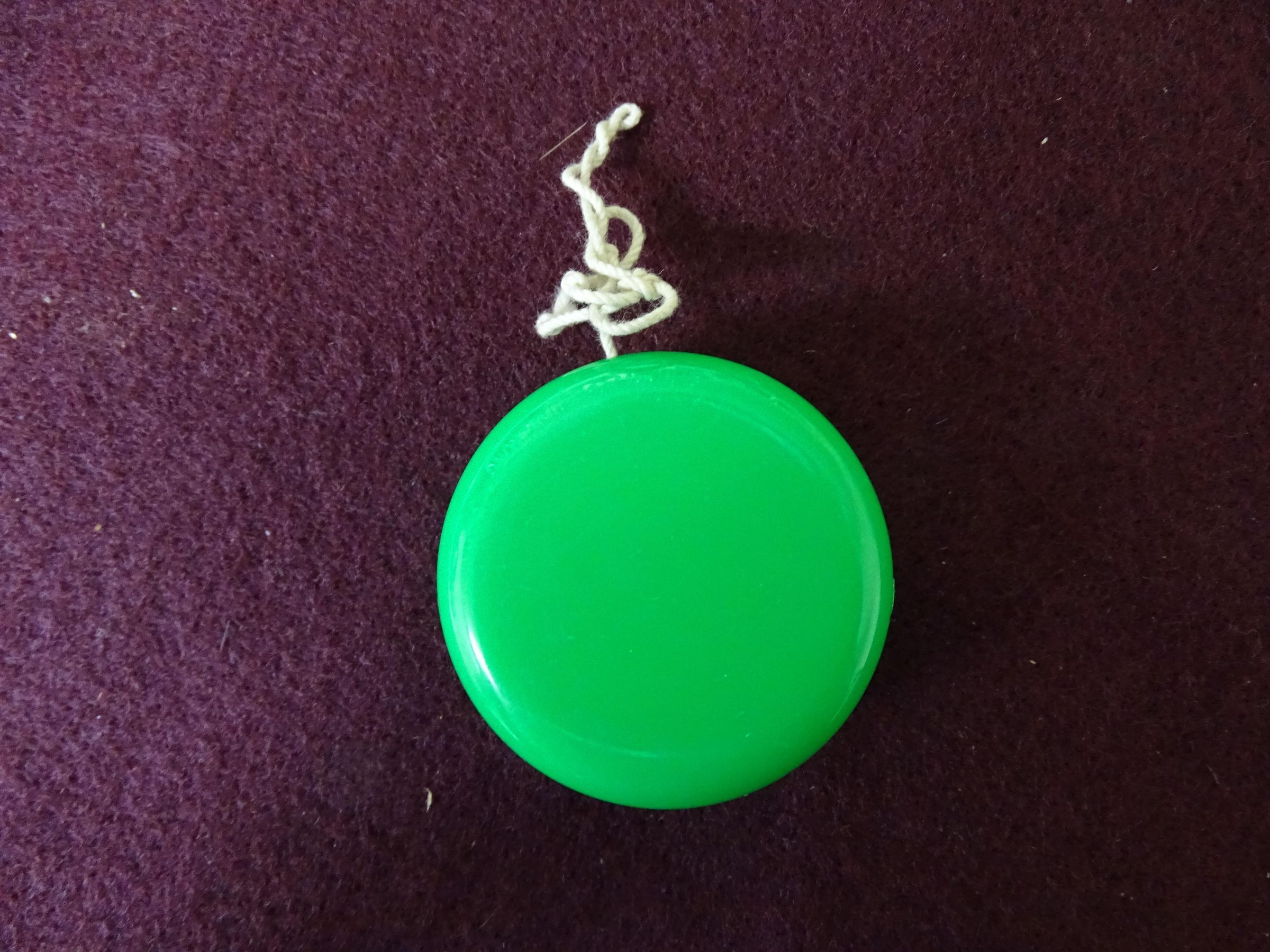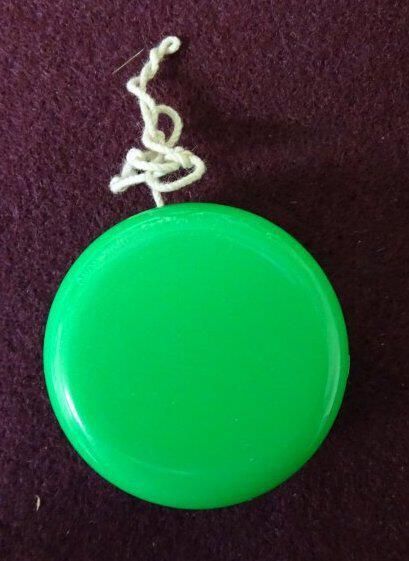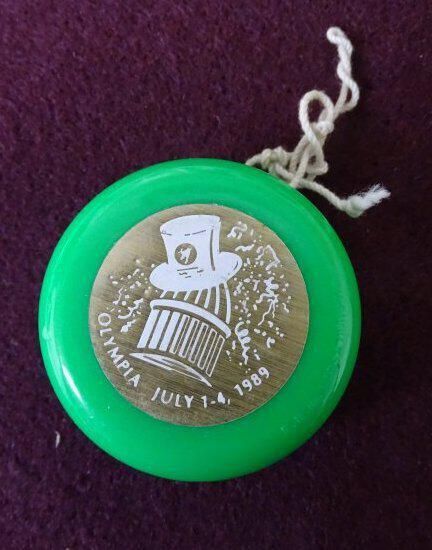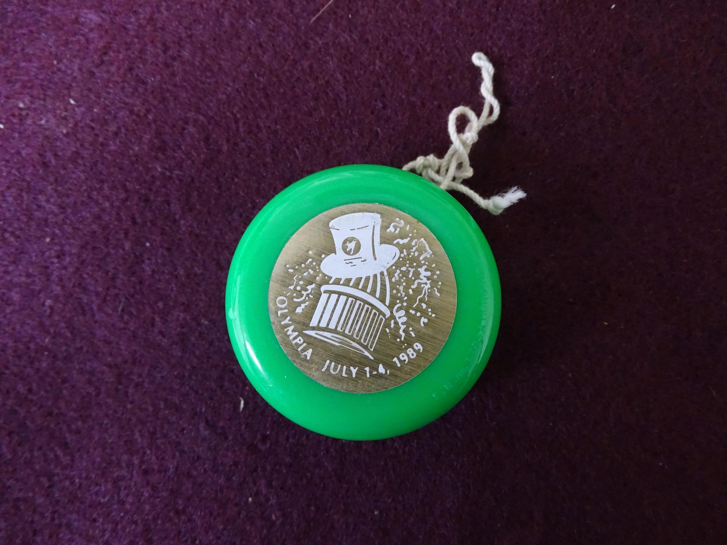 Green plastic yo-yo with string and a gold-colored paper label that has (in white) an image of the capitol dome and a top hat and the words "Olympia July 1-4 1989".Dimensions