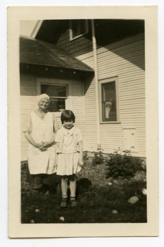 Anna Holmes with Grandchild at Union Mills, Unknown Date. This image shows Anna Holmes and an unknown grandchild standing outside a house at Union Mills. Anna Holmes is wearing a bonnet and an apron over a elbow-length sleeved dress. The little girl is wearing a collared, knee-length dress. Both Anna and the girl are looking toward the camera. Anna is smiling.