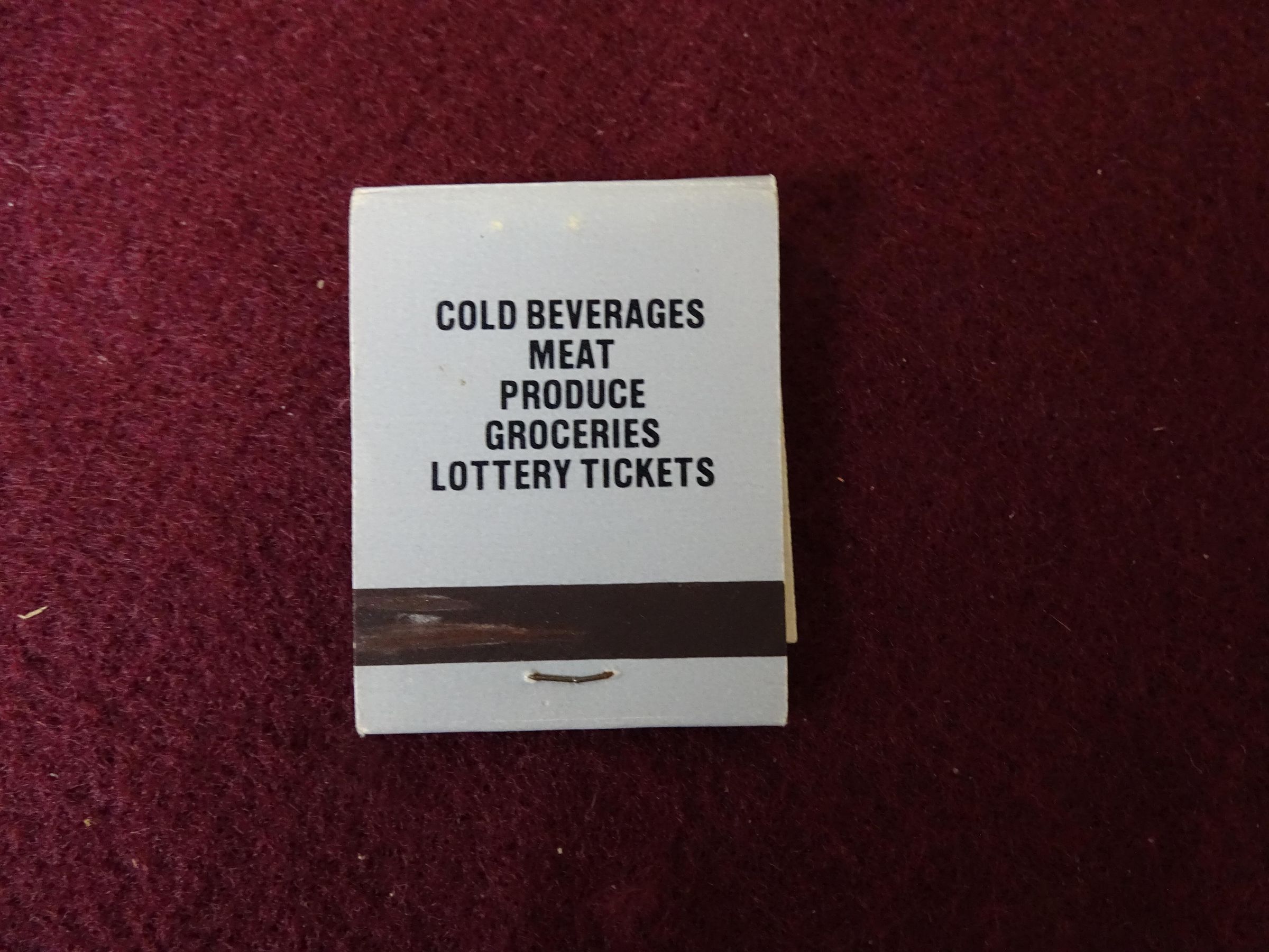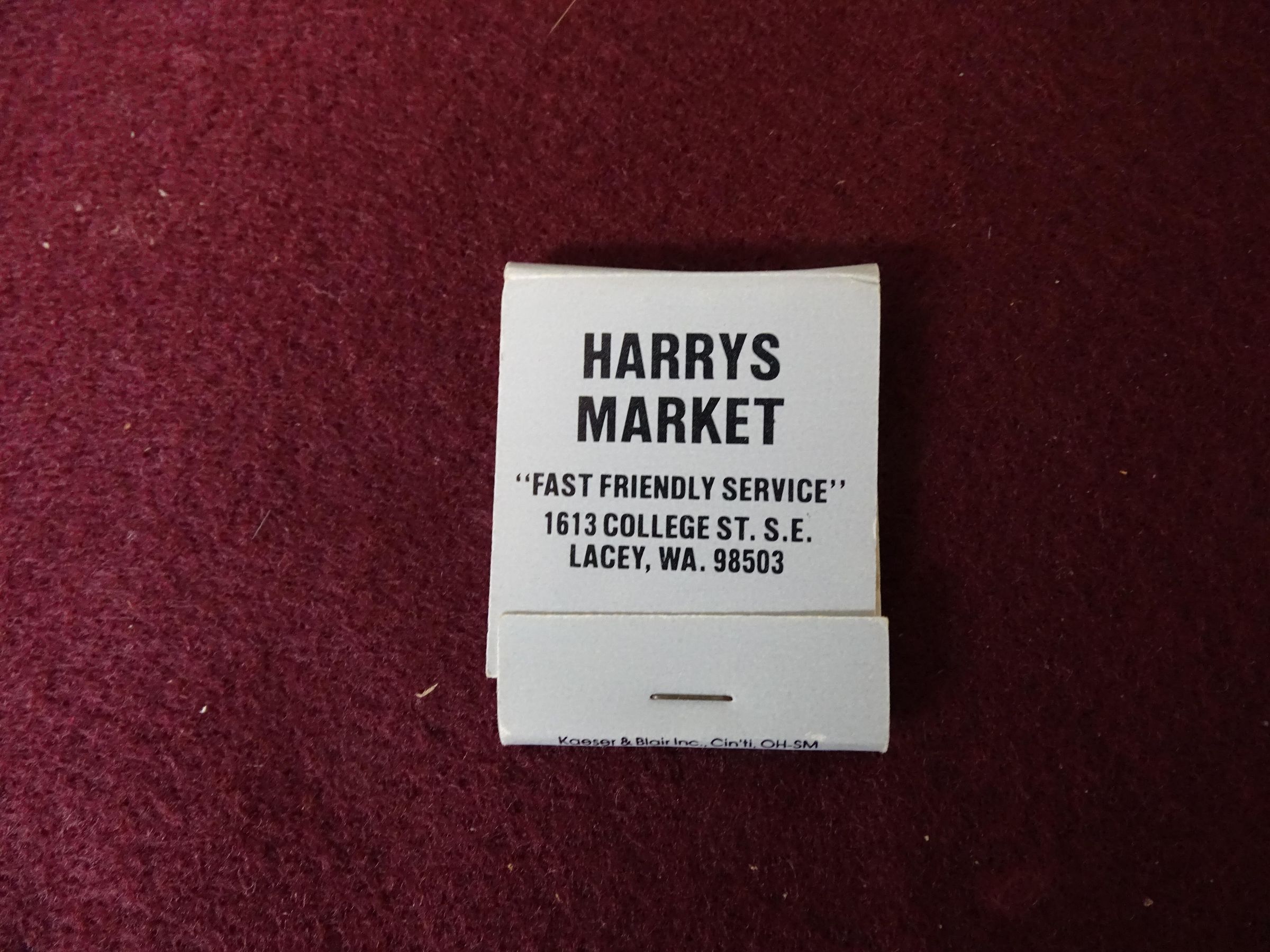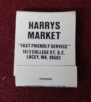 Gray paper matchbook. On the front is "Harry's Market, fast friendly service, 1613 College St. S. E., Lacey, WA 98503, for safety strike on back". On the back is "Cold beverages, meat, produce, groceries, lottery tickets". On the bottom is "Koeser & Blair Inc. Cin'ti, OH-SM".Relationships