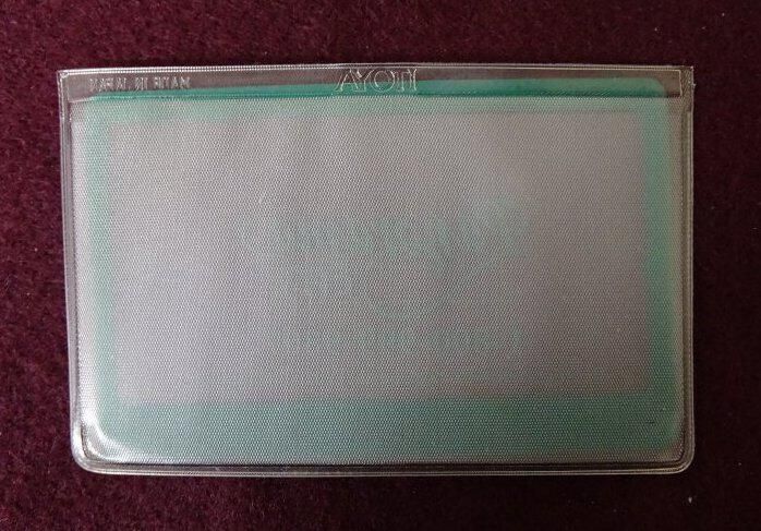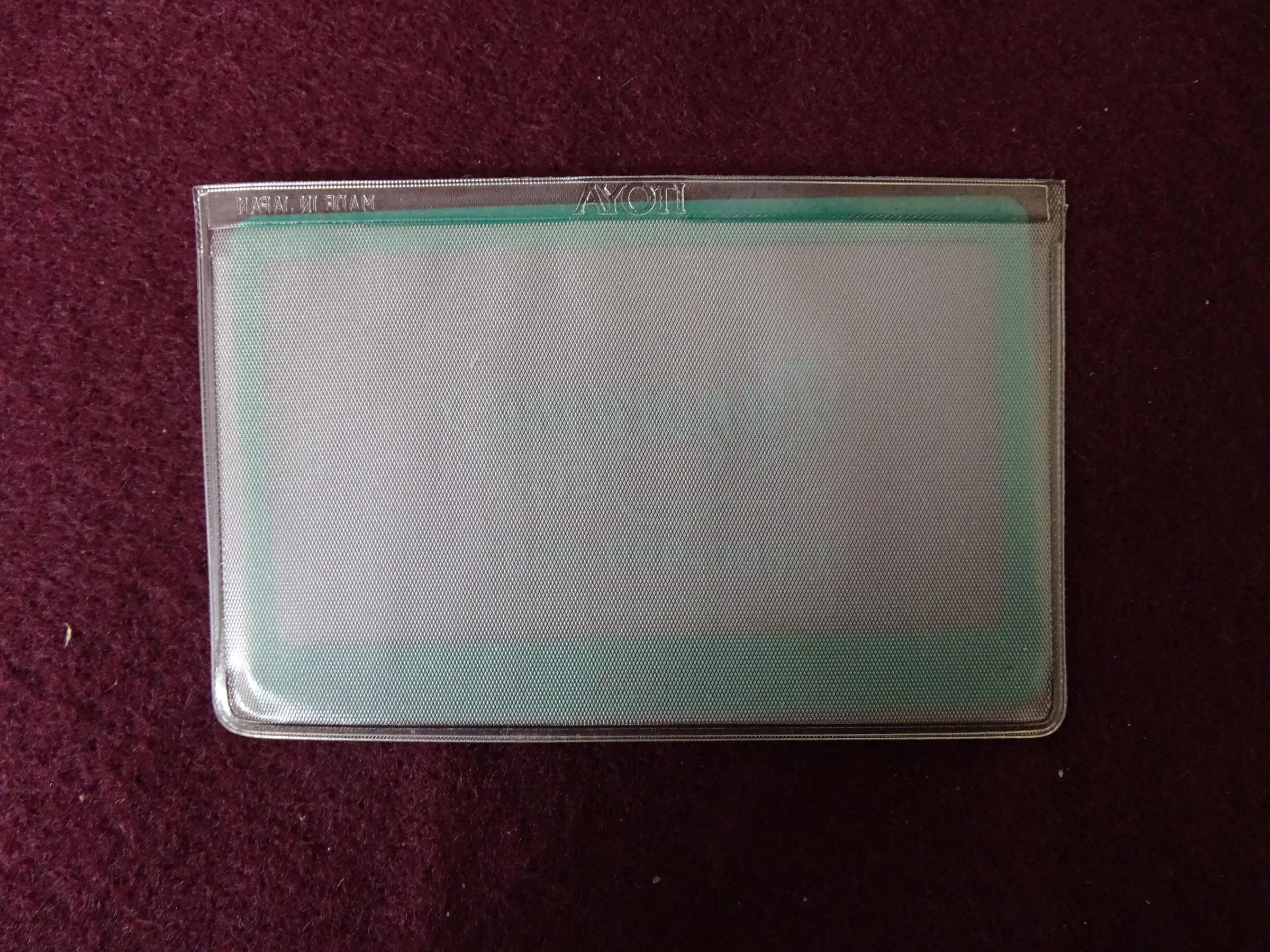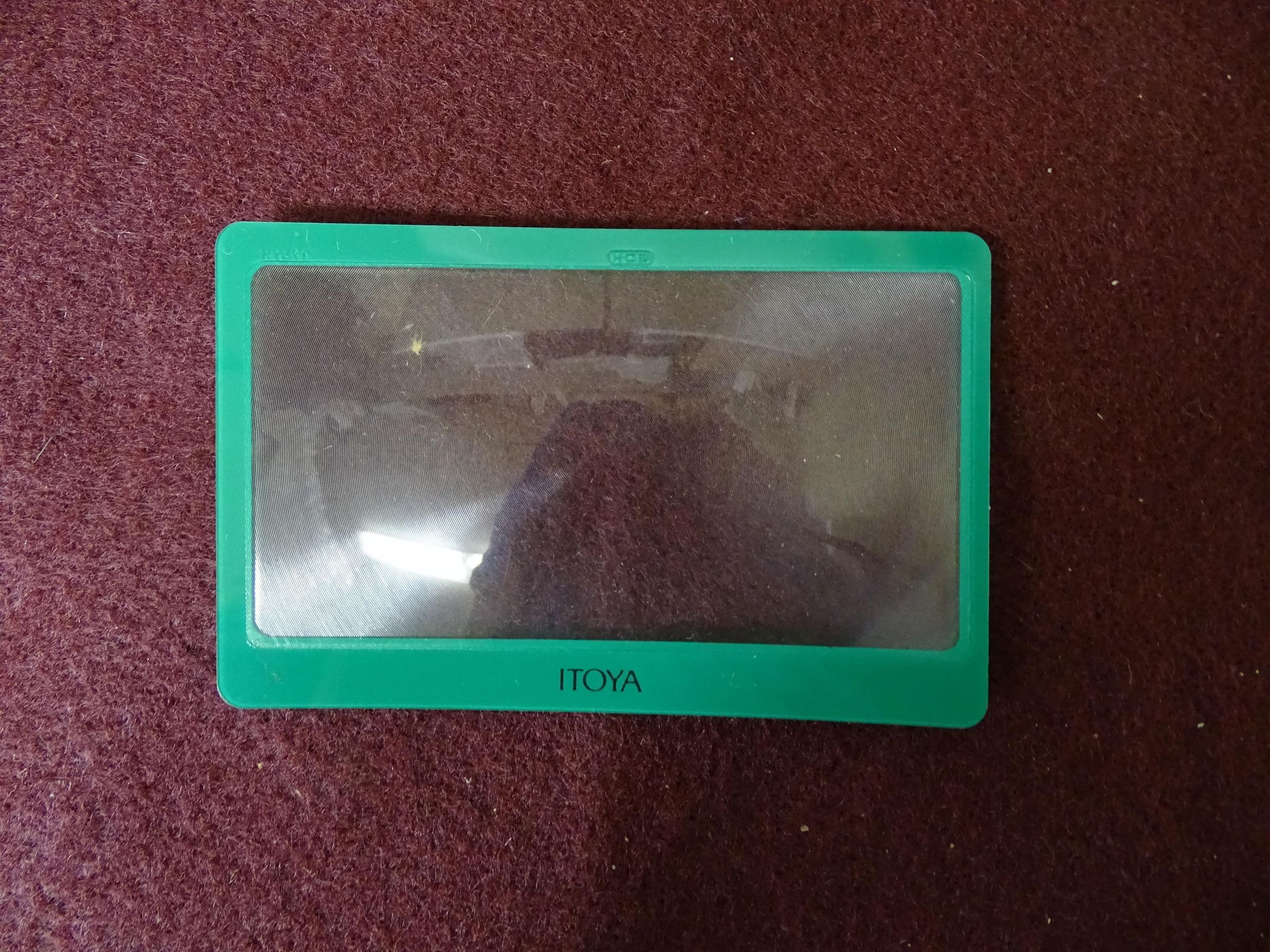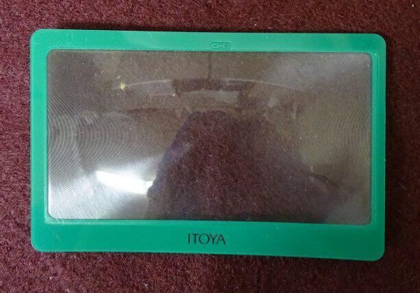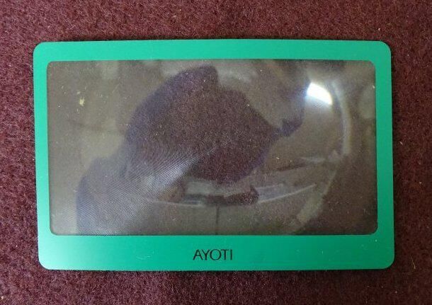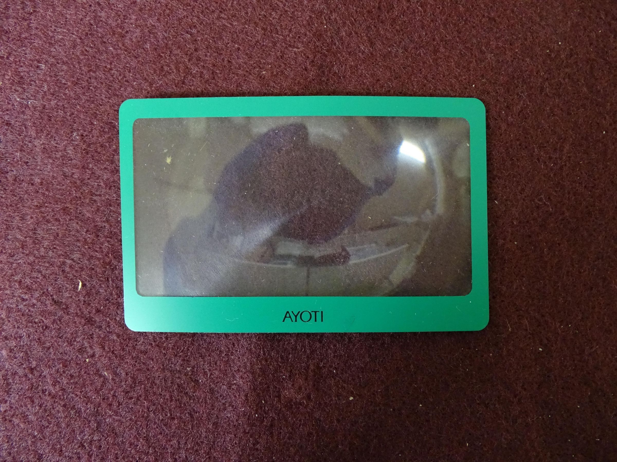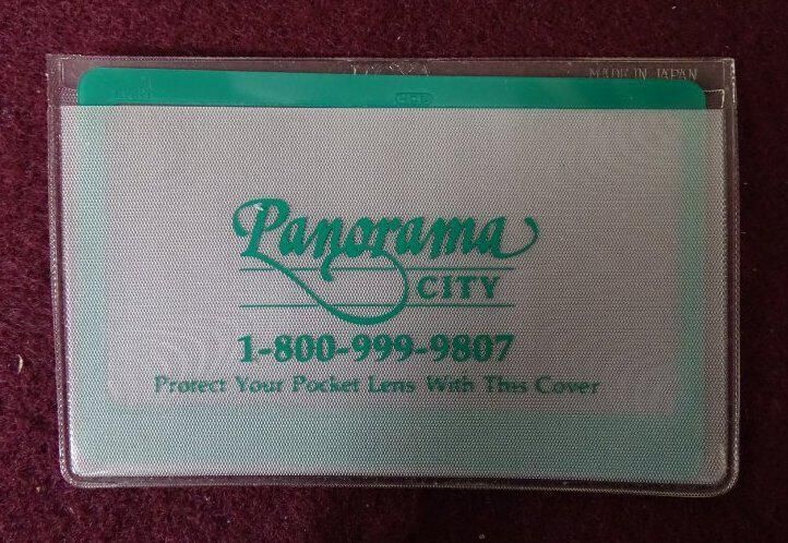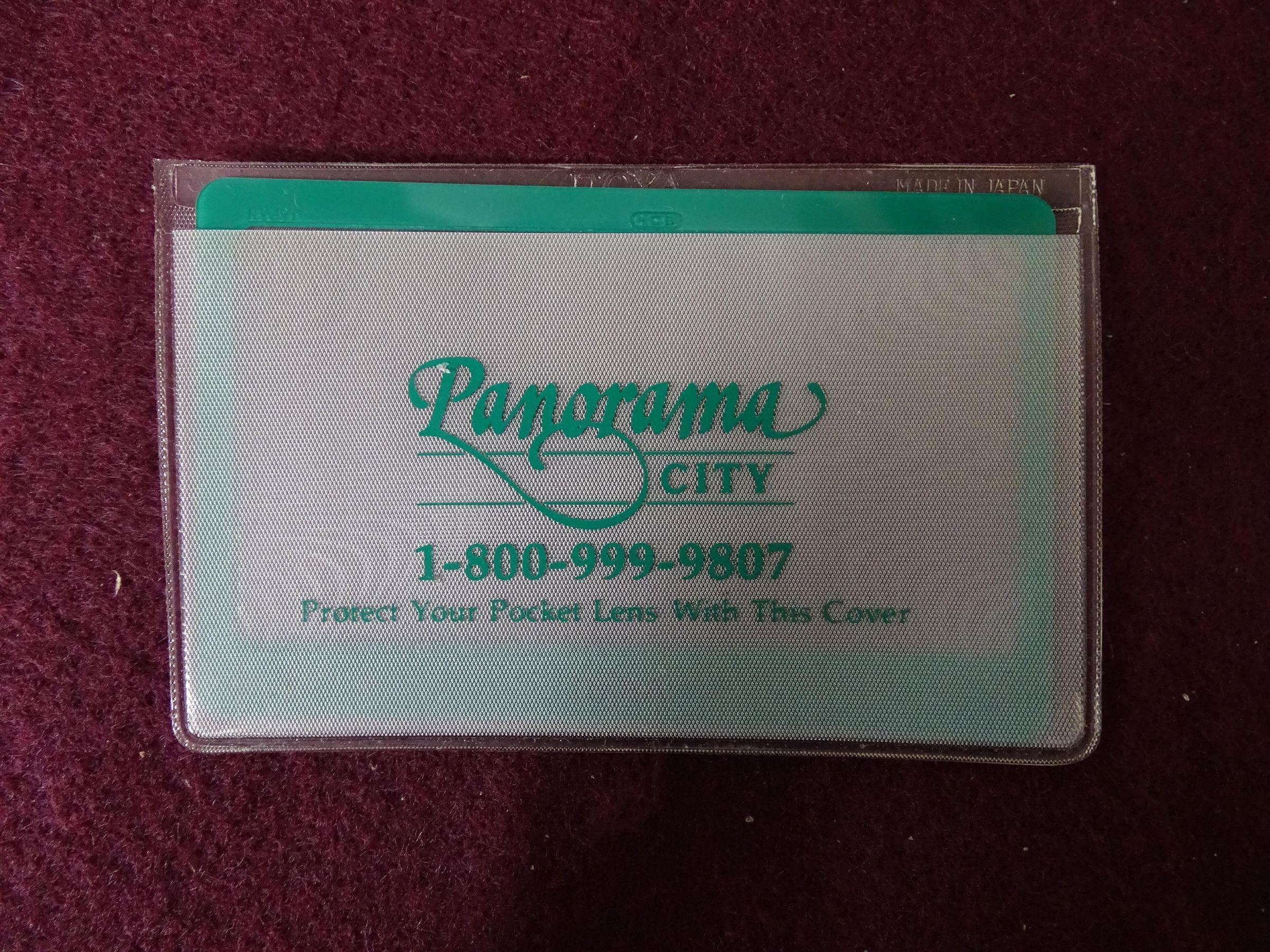 Plastic pocket magnifying lens inside a cover. The lens and the cover are clear plastic. The lens has a green border and the cover has printed in green "Panorama City, 1-800-999-9807, Protect your pocket lens with this cover". On the lens is printed "Ayoti" and on the cover is stamped "Ayoti, made in Japan".Dimensions