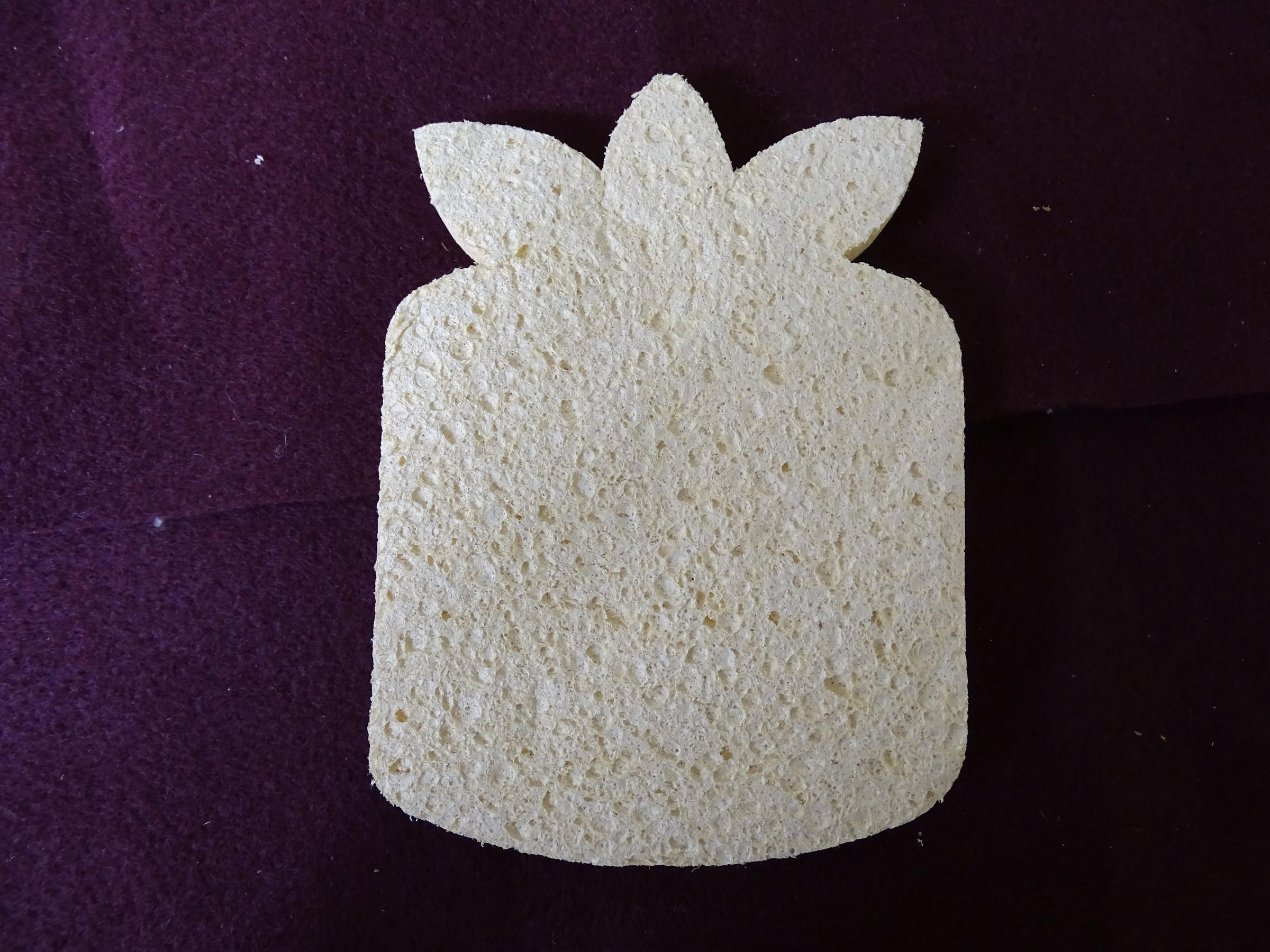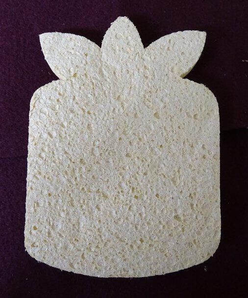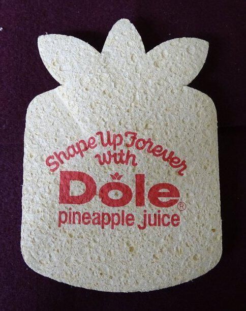 Yellow-colored sponge. On the front in red ink is printed "Shape up forever with Dole pineapple juice". The sponge is in a rough shape of a pineapple.