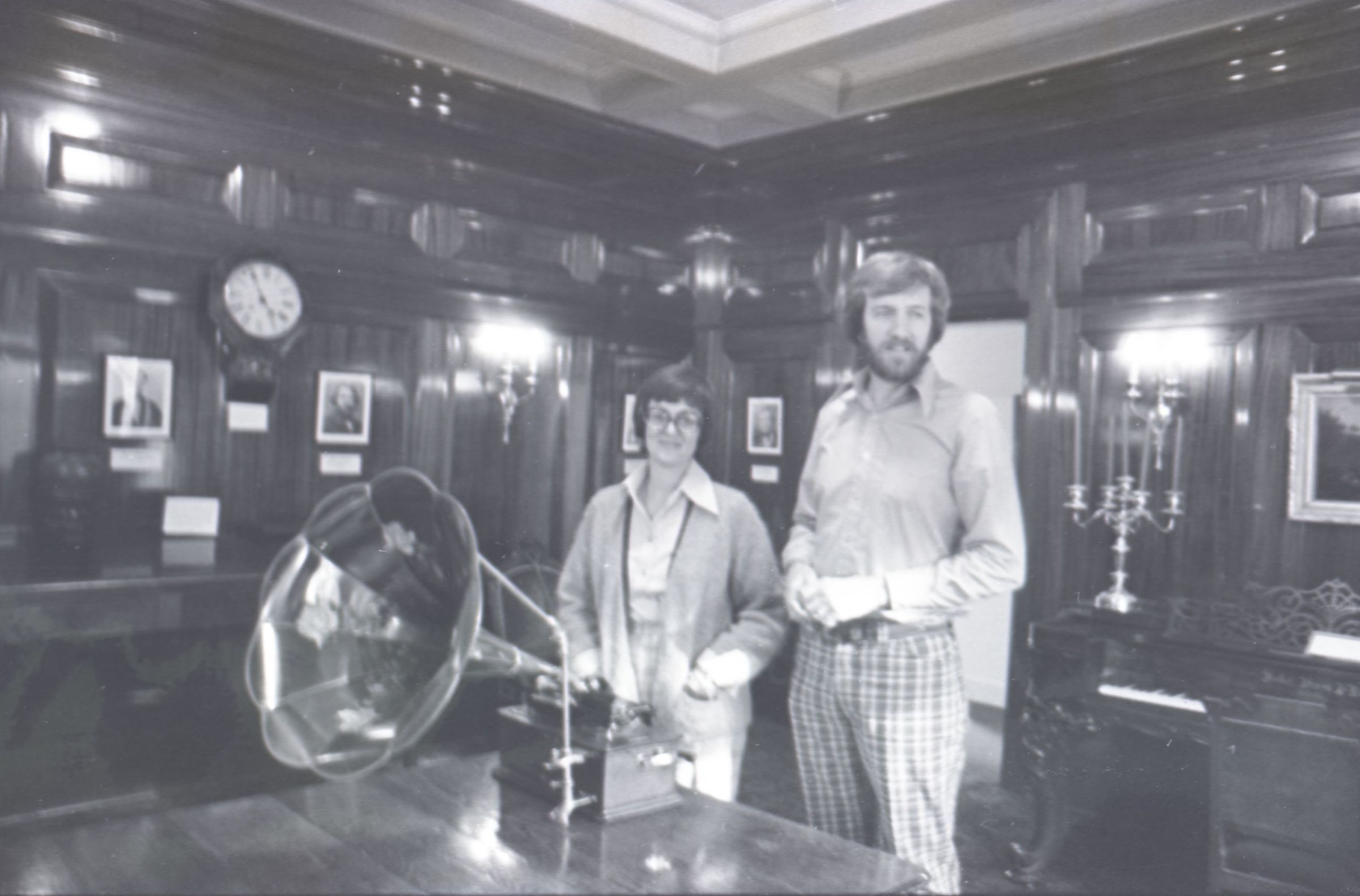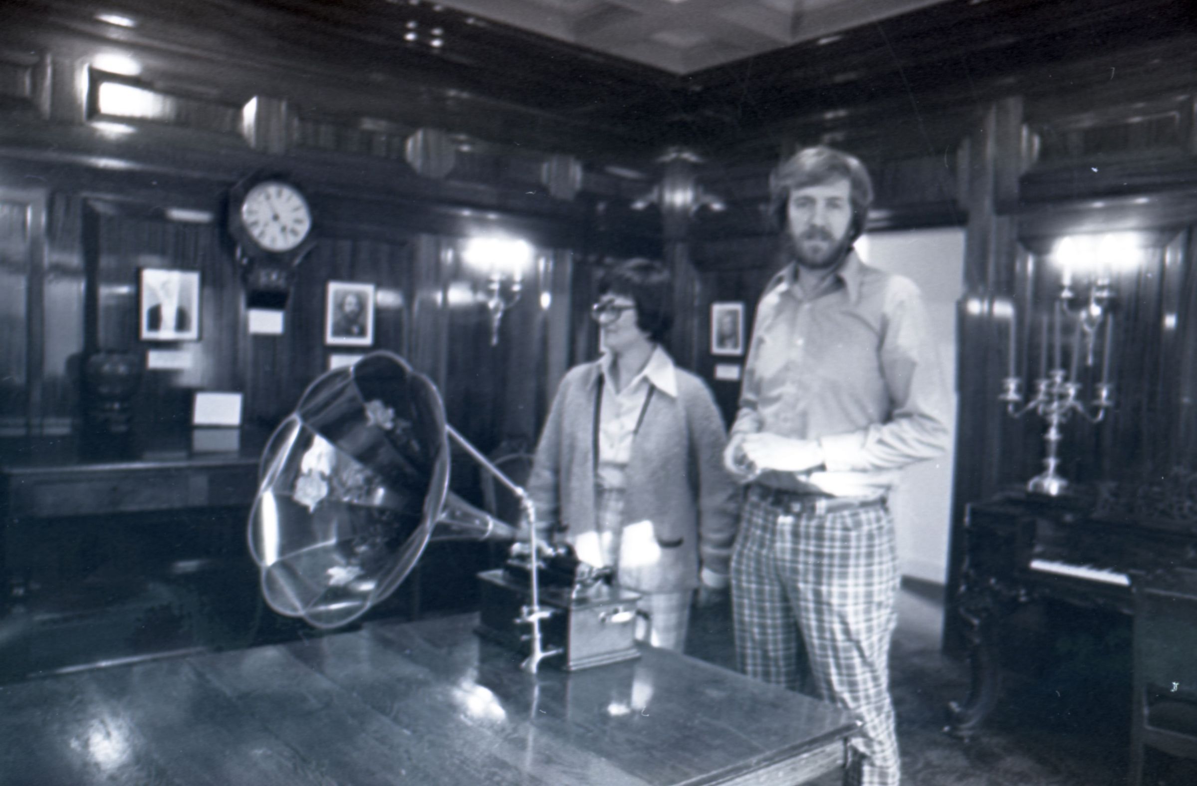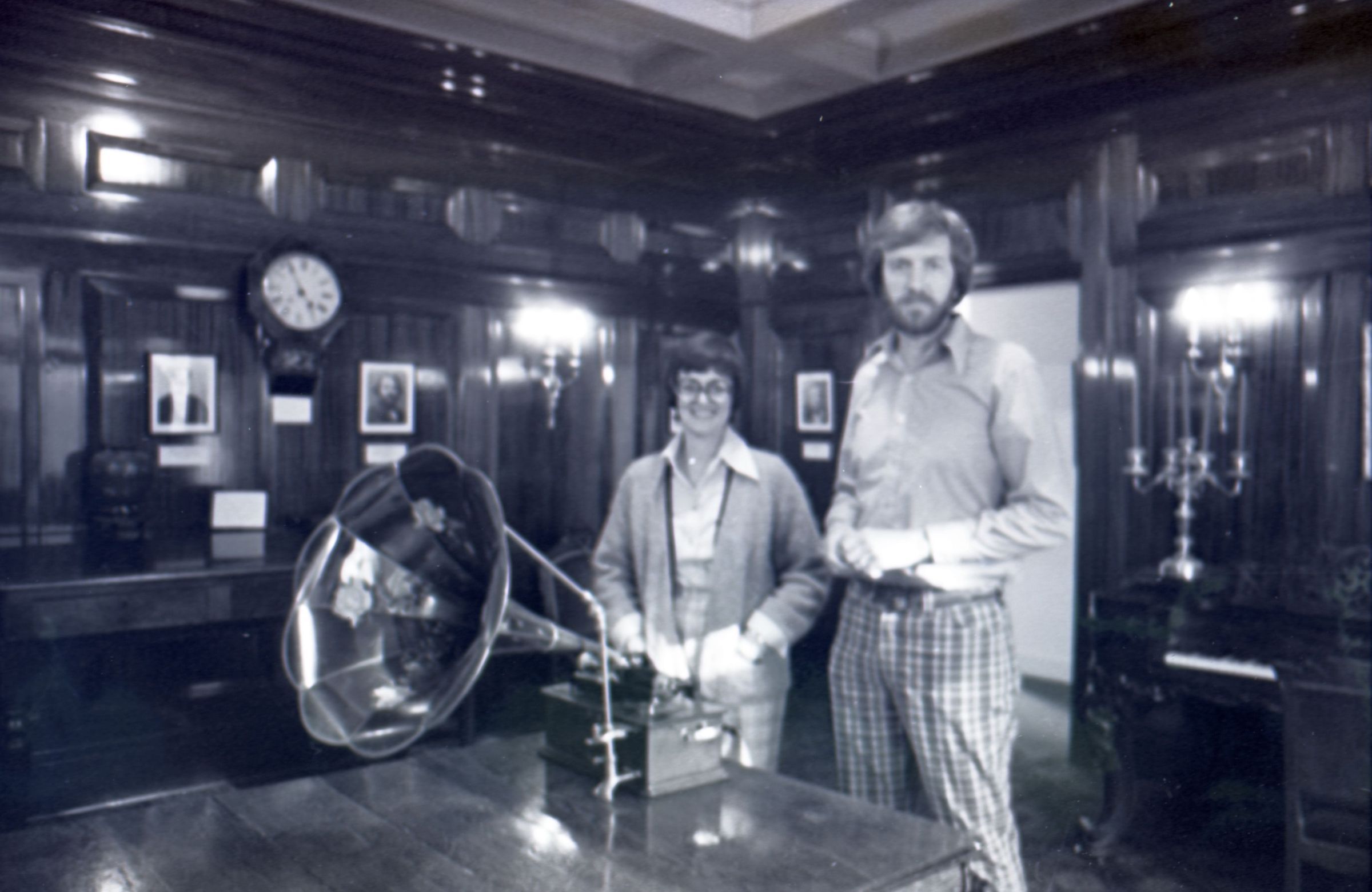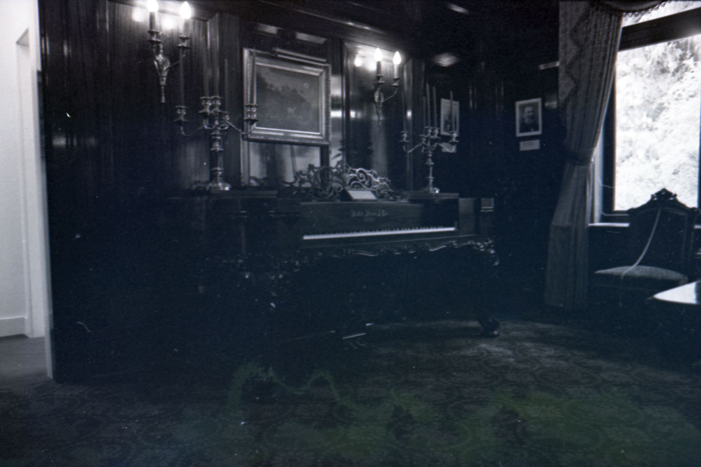 The images in group "c" show a parlor, the same masquerade ball sign seen in image 42b, a man and woman posing with a phonograph, and four women looking at a (presumably fake) human skull with the top cut off.Made/Created