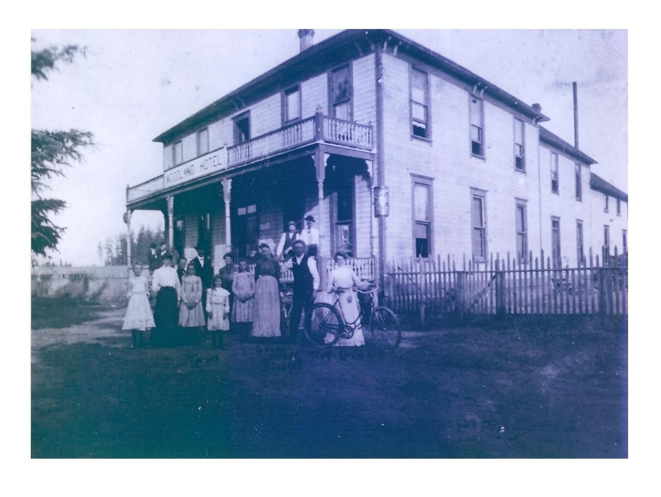 Kenney family in front of the Woodland Hotel. Digital copy of historic print. Blue-toned image shows the grand scale of the Woodland Hotel, looking southeast. There are eleven people in front of the hotel, two men on the porch and two men towards the rear of the porch. Written underneath the people, left to right: "Twins" "Grand mother Bridget" "Tom" and "Grace".Made/Created
