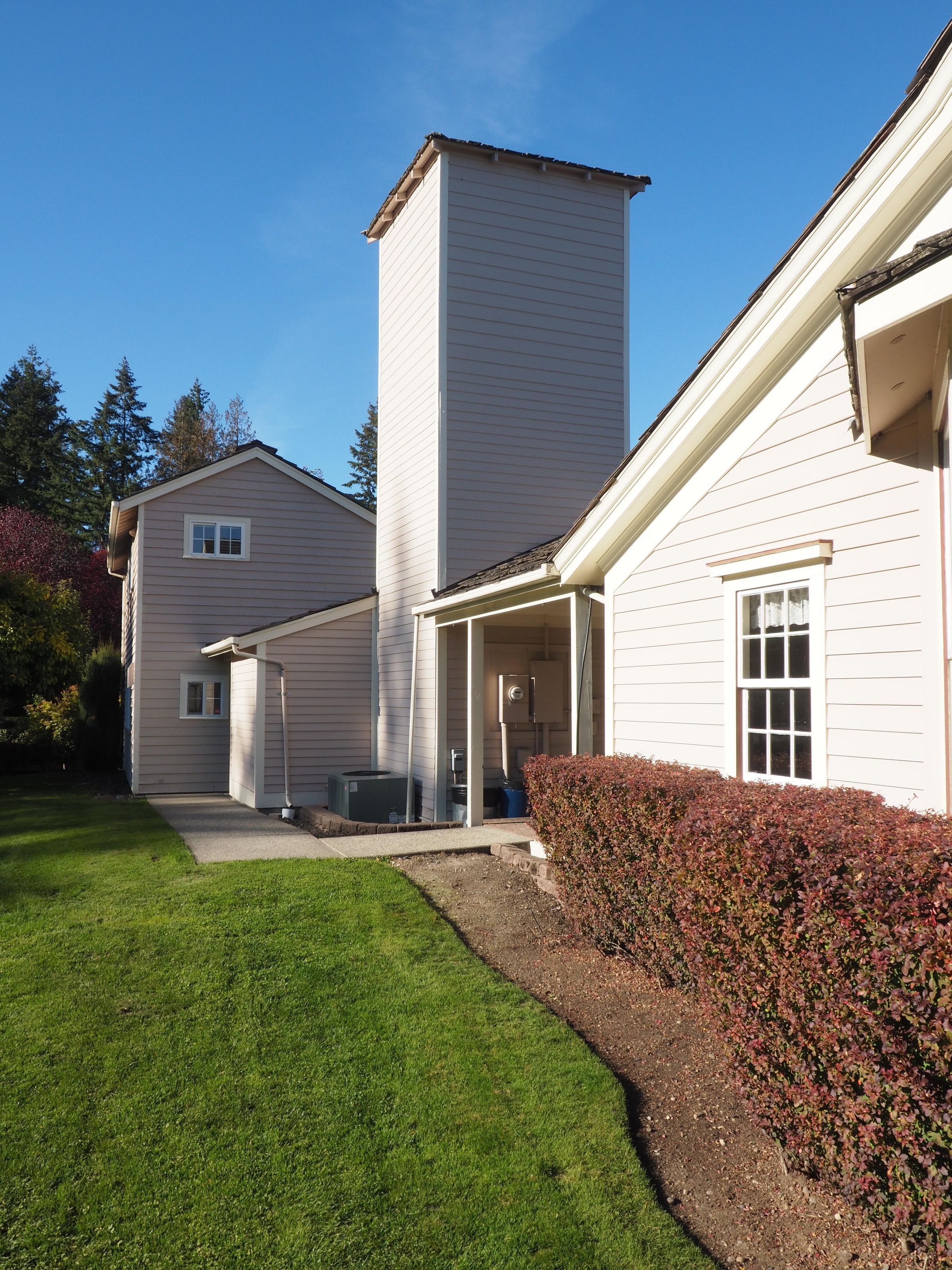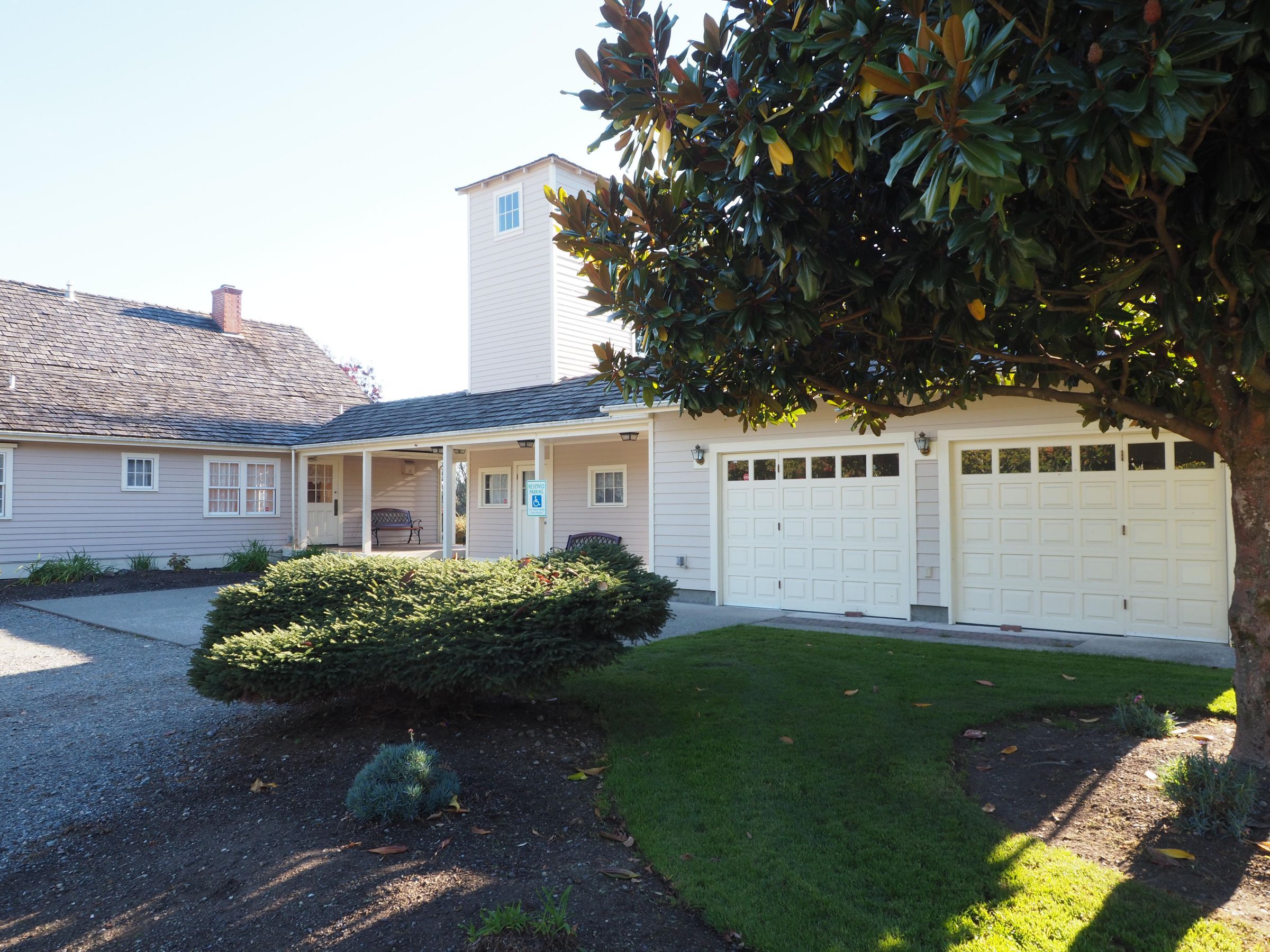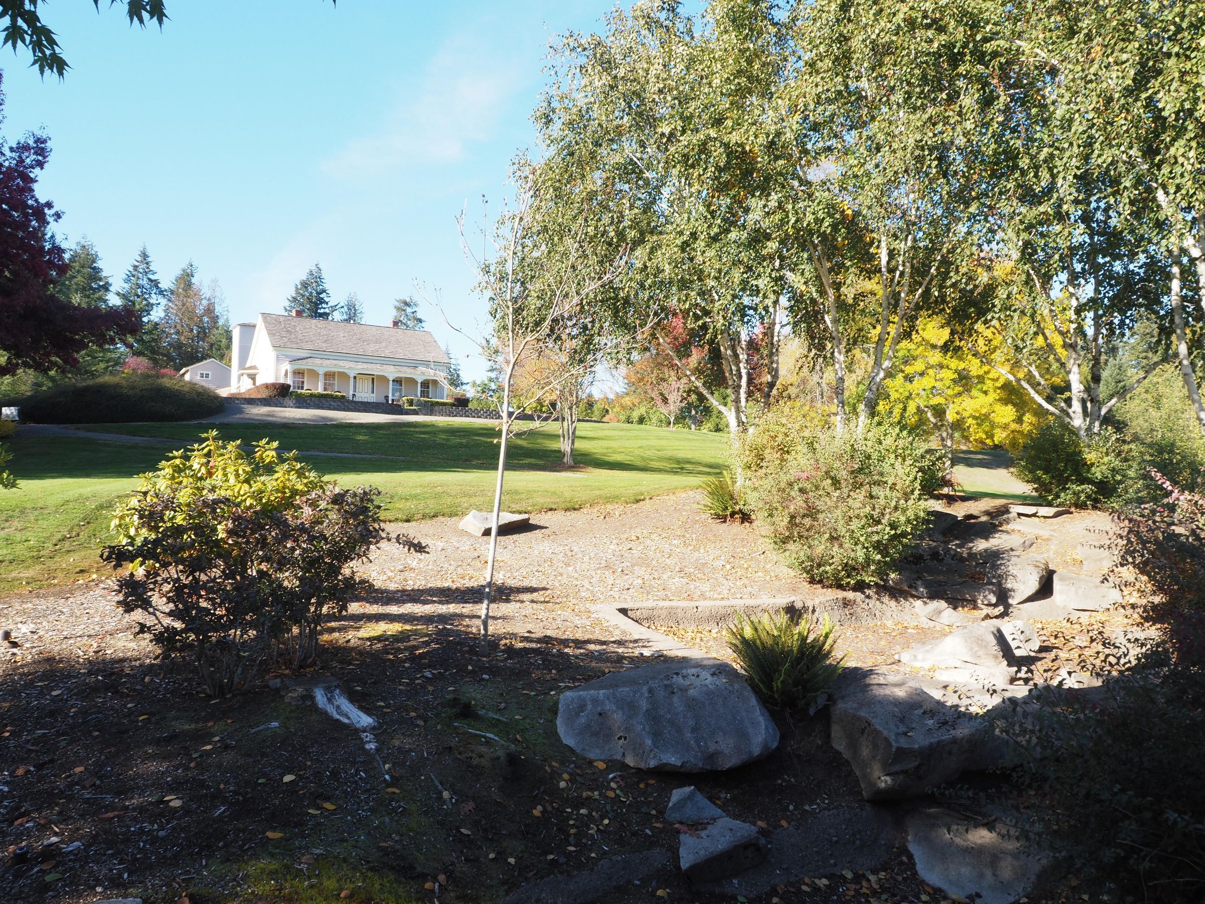 49 digital photographs of the Jacob Smith House and grounds, 4500 Intelco Loop SE, in Lacey from various vantage points. Images 1-5 and 14 are of landscaping, images 6 and 7 are from the bottom of the hill, images 8-13 are long shots of the front of the house through the landscaping, 15 is a straight on view of the front of the house, 16, 17 and 18 are looking west from various distances, images 19 and 20 are close ups of the front door, image 21 is a column detail, images 22-26 are shots of the southwest side view at different points and angles, 27 and 27 are of the outdoor "hallway" between structures, 29 is a closeup of the window, 30 shows the bench, 31 and 32 show the northwest end of the building, 33 and 34 show the tower, 35 -39 are interior shots, 40-49 show the building from the parking lot side.