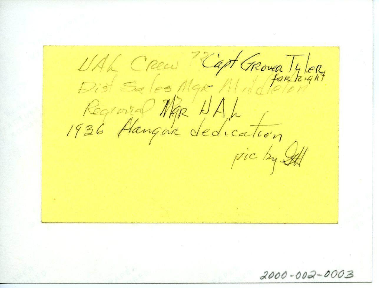 A note on the back reads: "UAL Crew ?? Capt Grover Tyler far right, Dist Sales Mgr - Middleton, Regional Mgr UAL, 1936 Hangar dedication, pic by GH"Made/Created