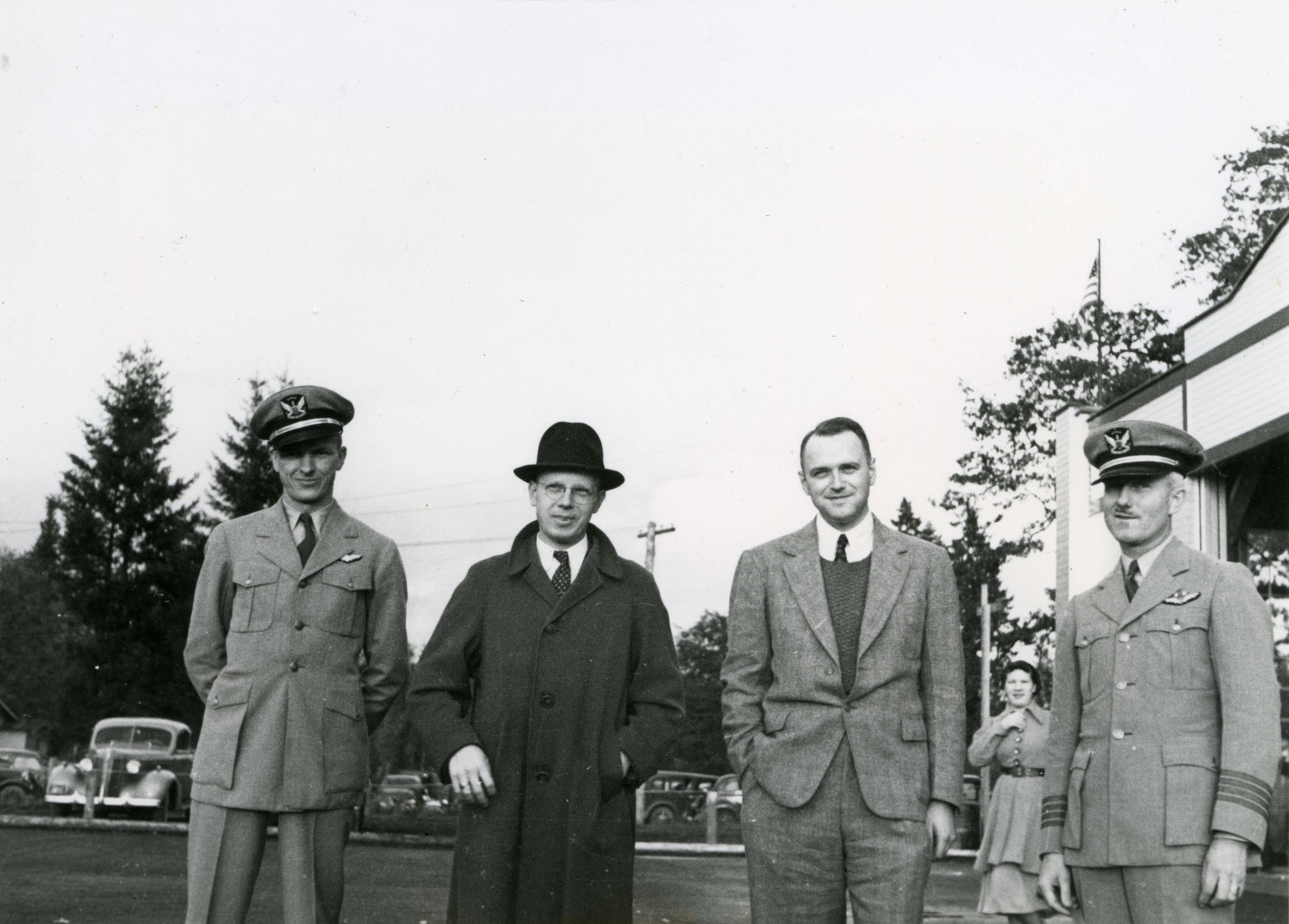 Black and white photograph of the United Air Lines Crew at the Olympia Airport hangar dedication. At the far right is Captain Grover Tyler. Also pictured, presumably in the center is United Airlines Regional Manager and the District Sales Manager (Middleton).
